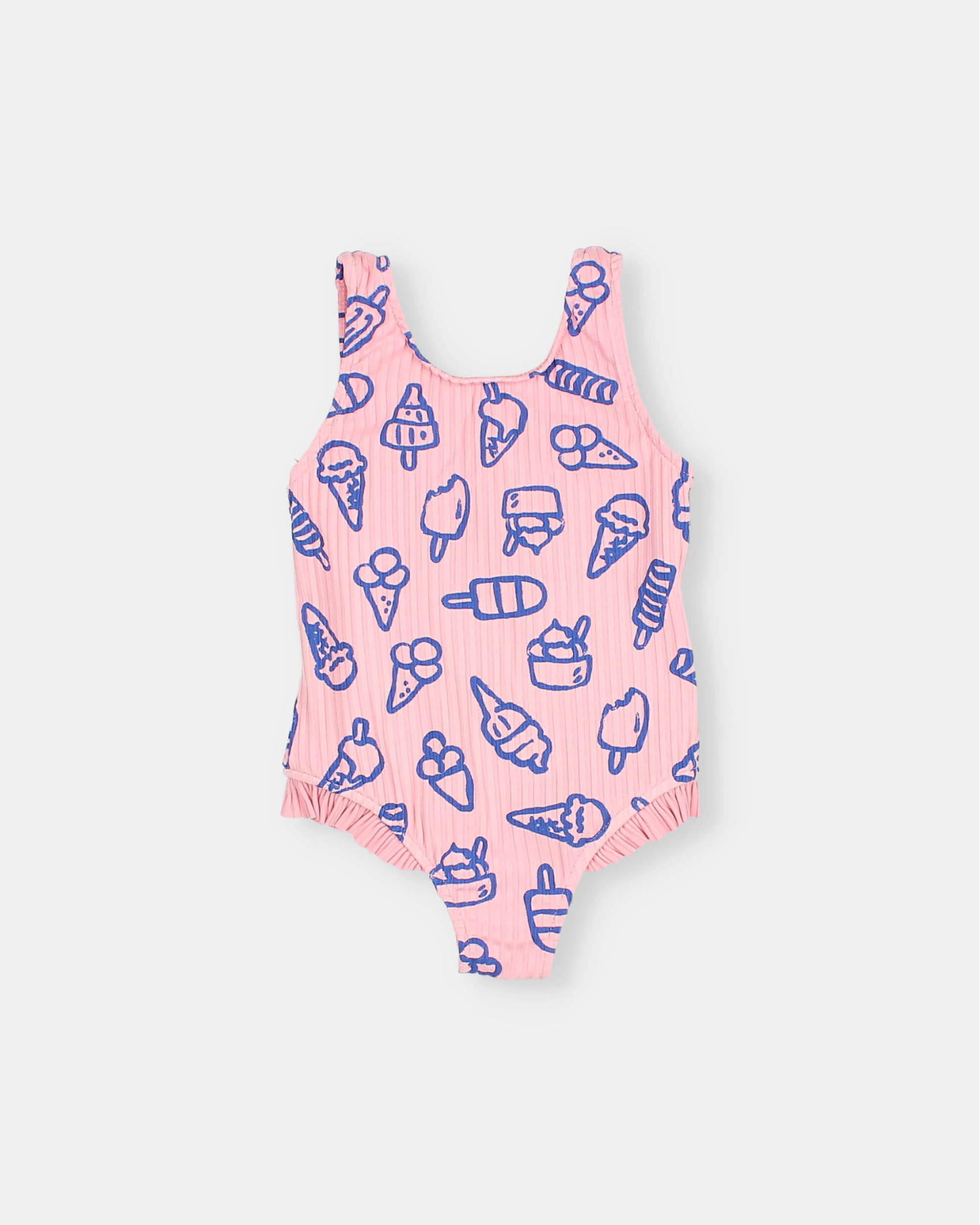 Ribbed polyamide maillot with ice cream print. Round neckline. Elastic thighs for a better fit. Ruffles on the side of the hem.