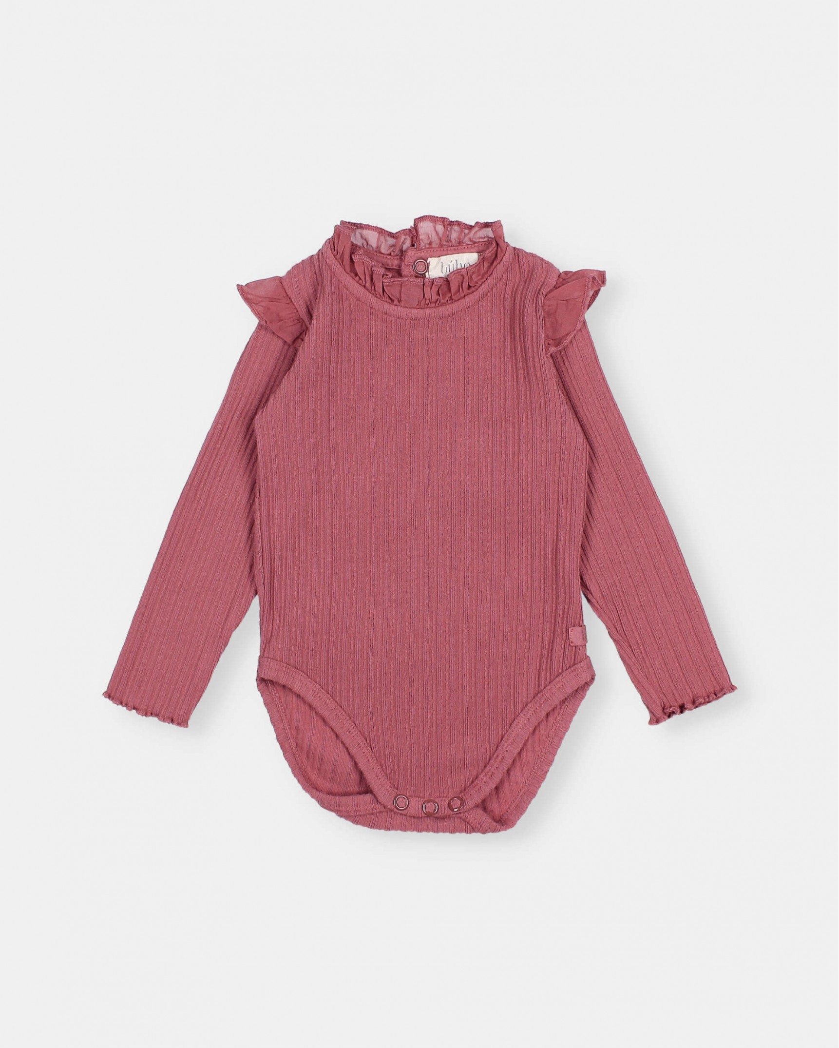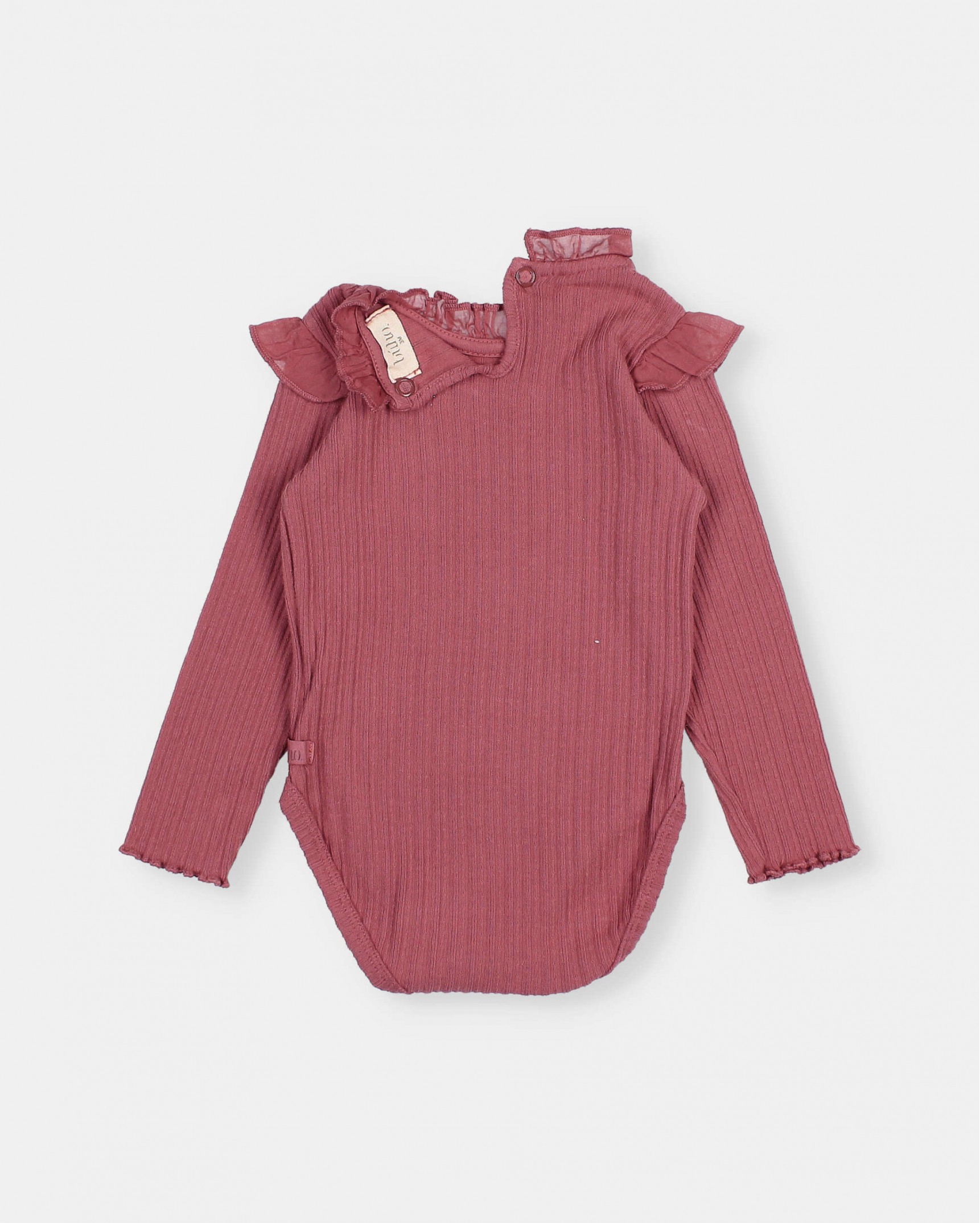 Ribbed bodysuit with cotton voile ruffles on the shoulders and neckline. Round neckline with teardrop fastening at the back. Snap buttons at crotch for easy dressing.