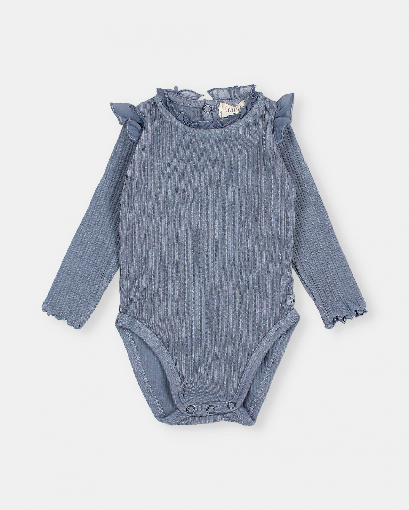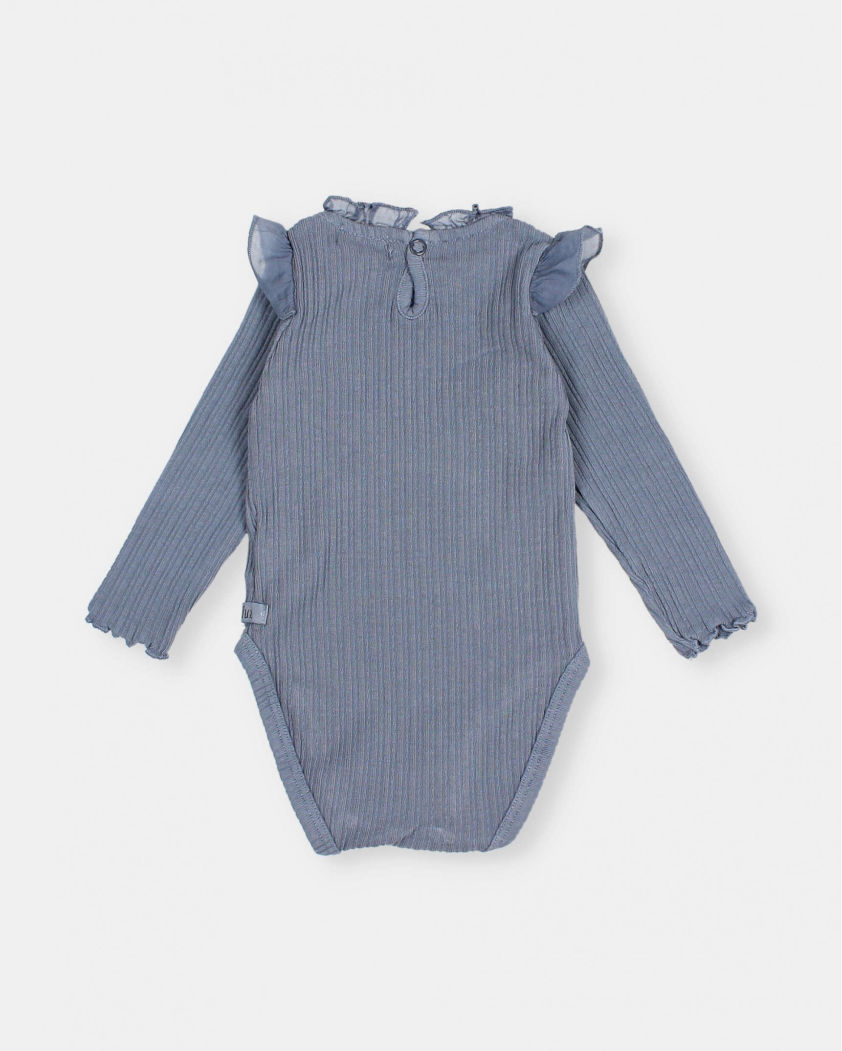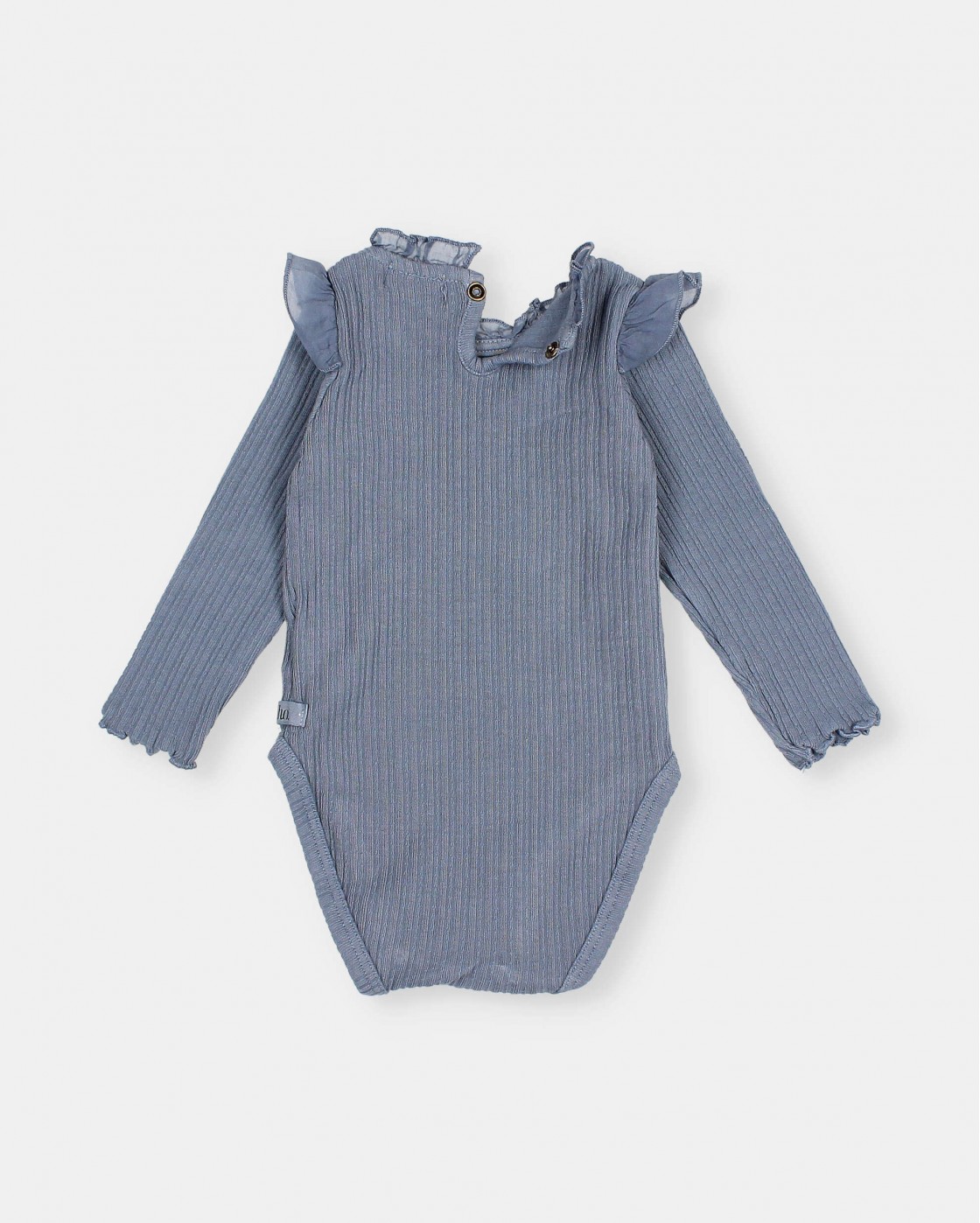 Ribbed bodysuit with cotton voile ruffles on the shoulders and neckline. Round neckline with teardrop fastening at the back. Snap buttons at crotch for easy dressing.