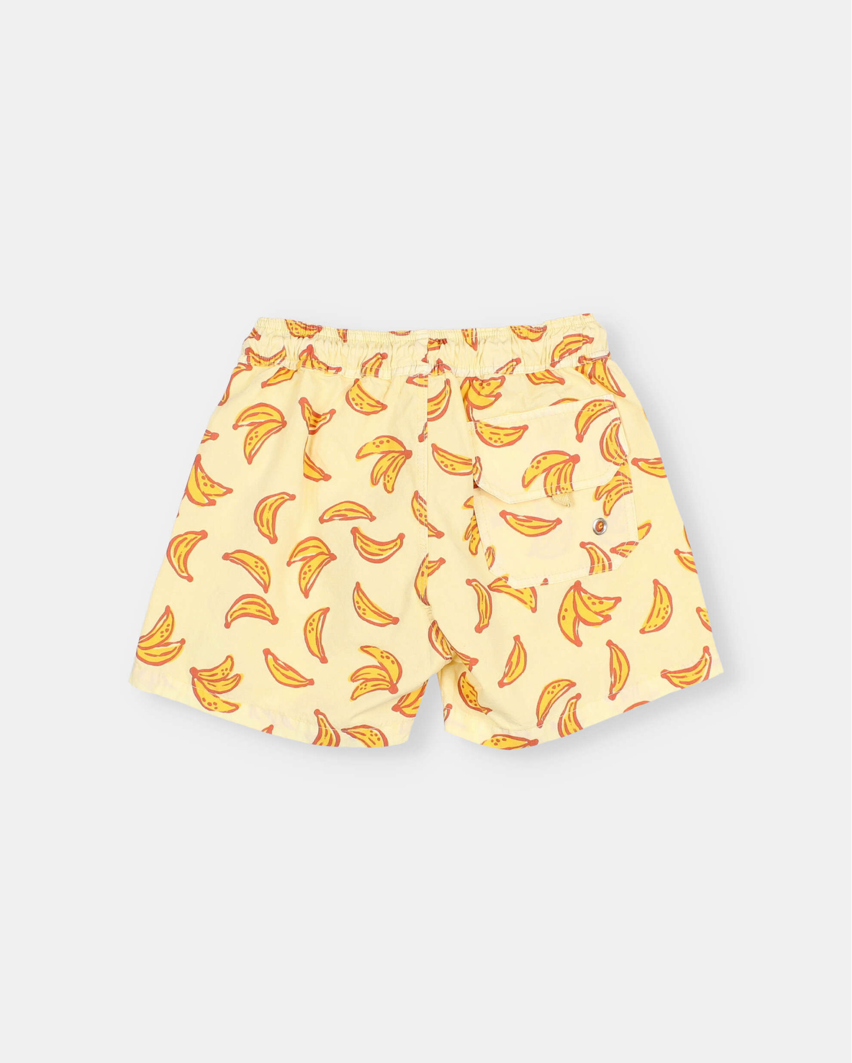 Organic cotton swimsuit with banana print. Elastic waistband for a better fit. Matching adjustable cotton drawstring at the waist. Decorative label at the hem. Plastron-style pocket at the back. Inner mesh lining.