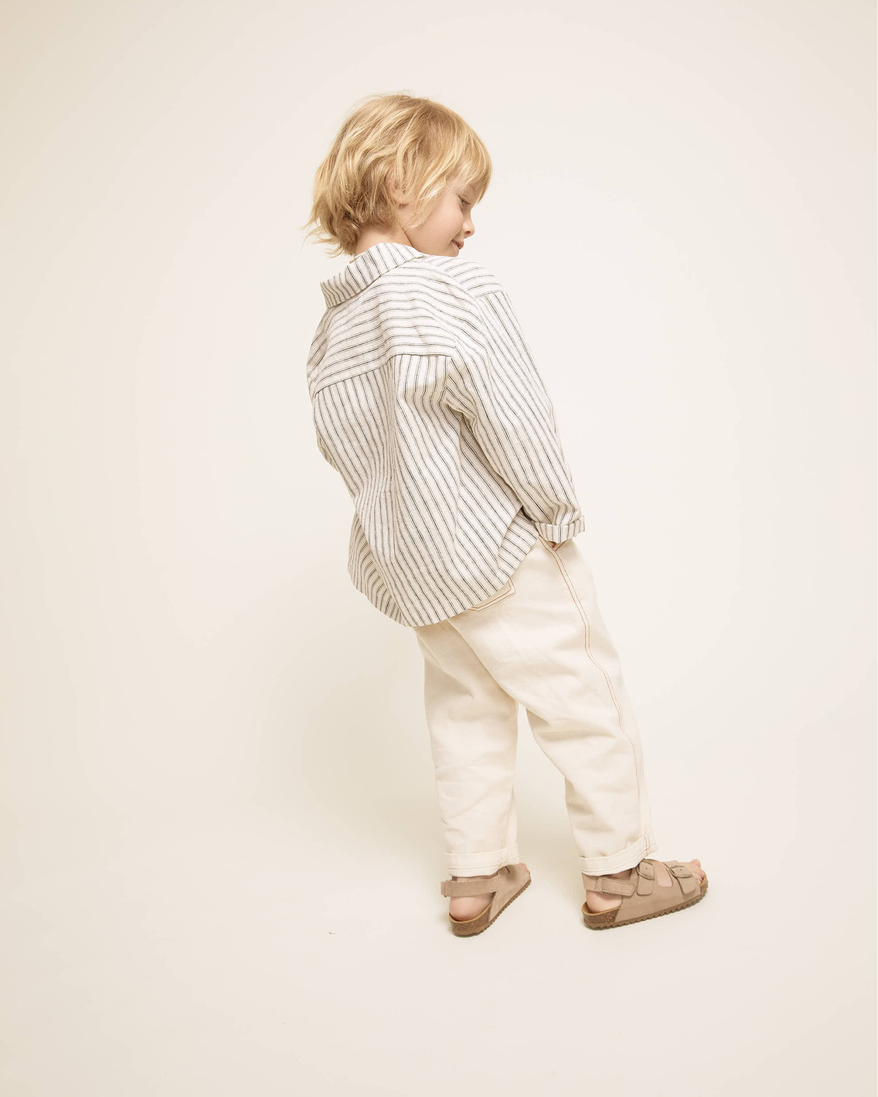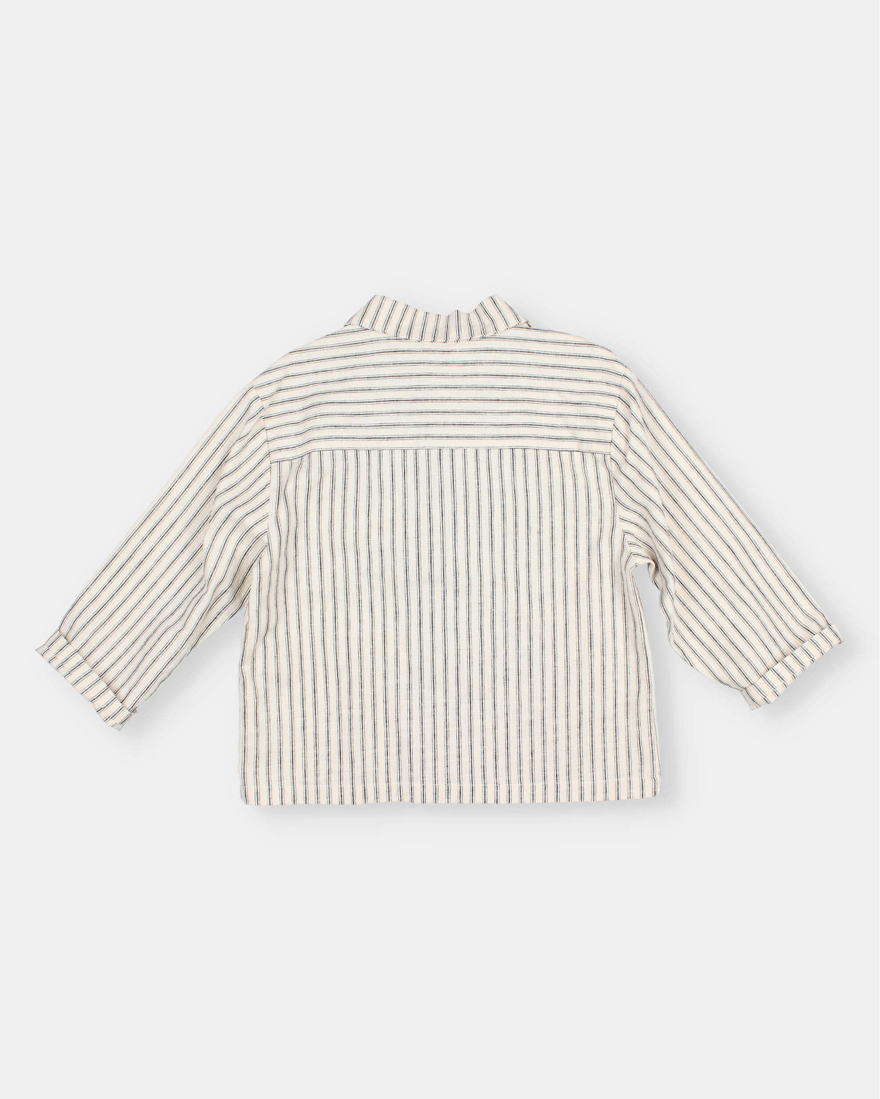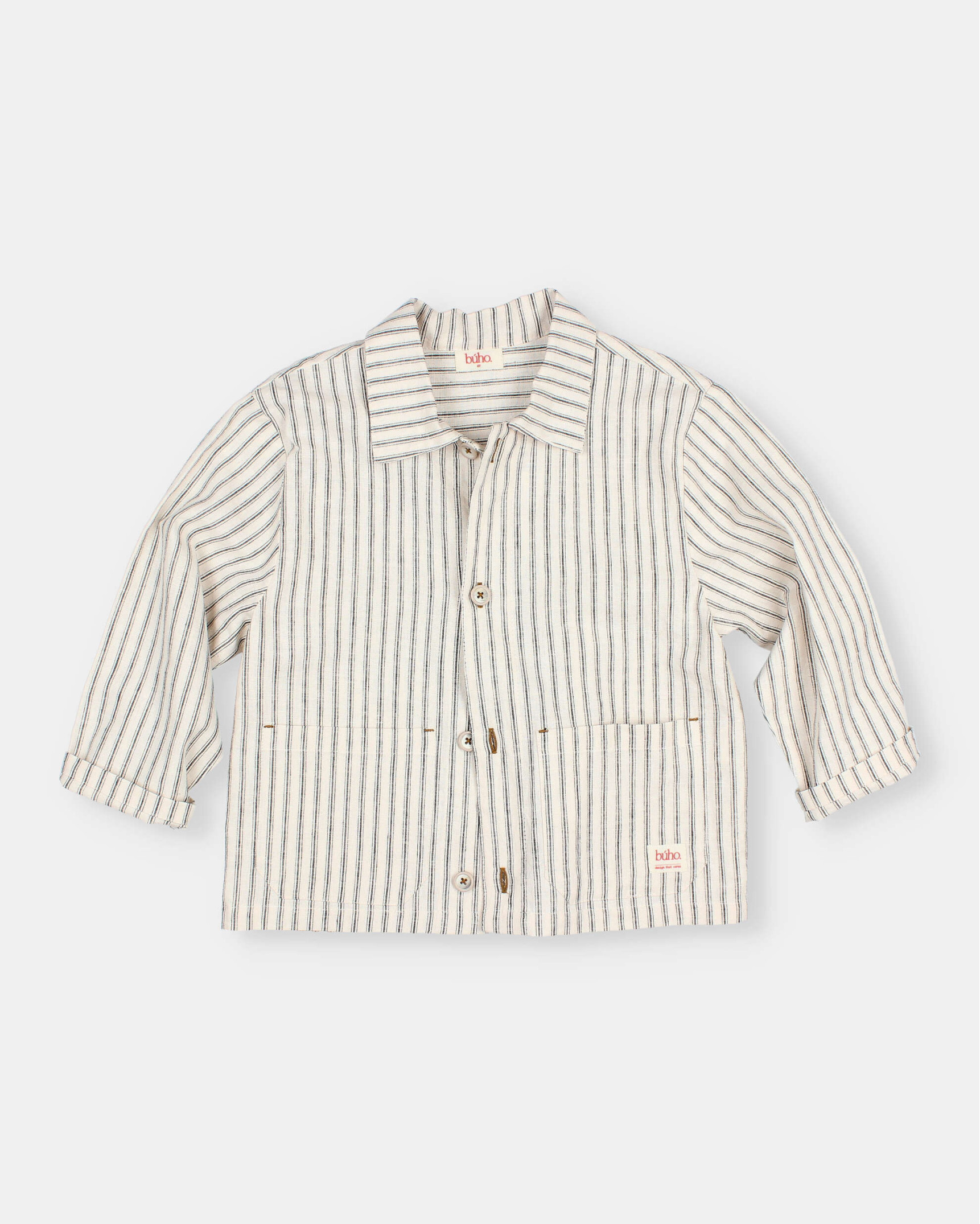 Cotton linen jacket with woven stripes. Shirt-style collar. Front button fastening. Front flap pockets. Decorative label on one pocket. Contrast thread details.