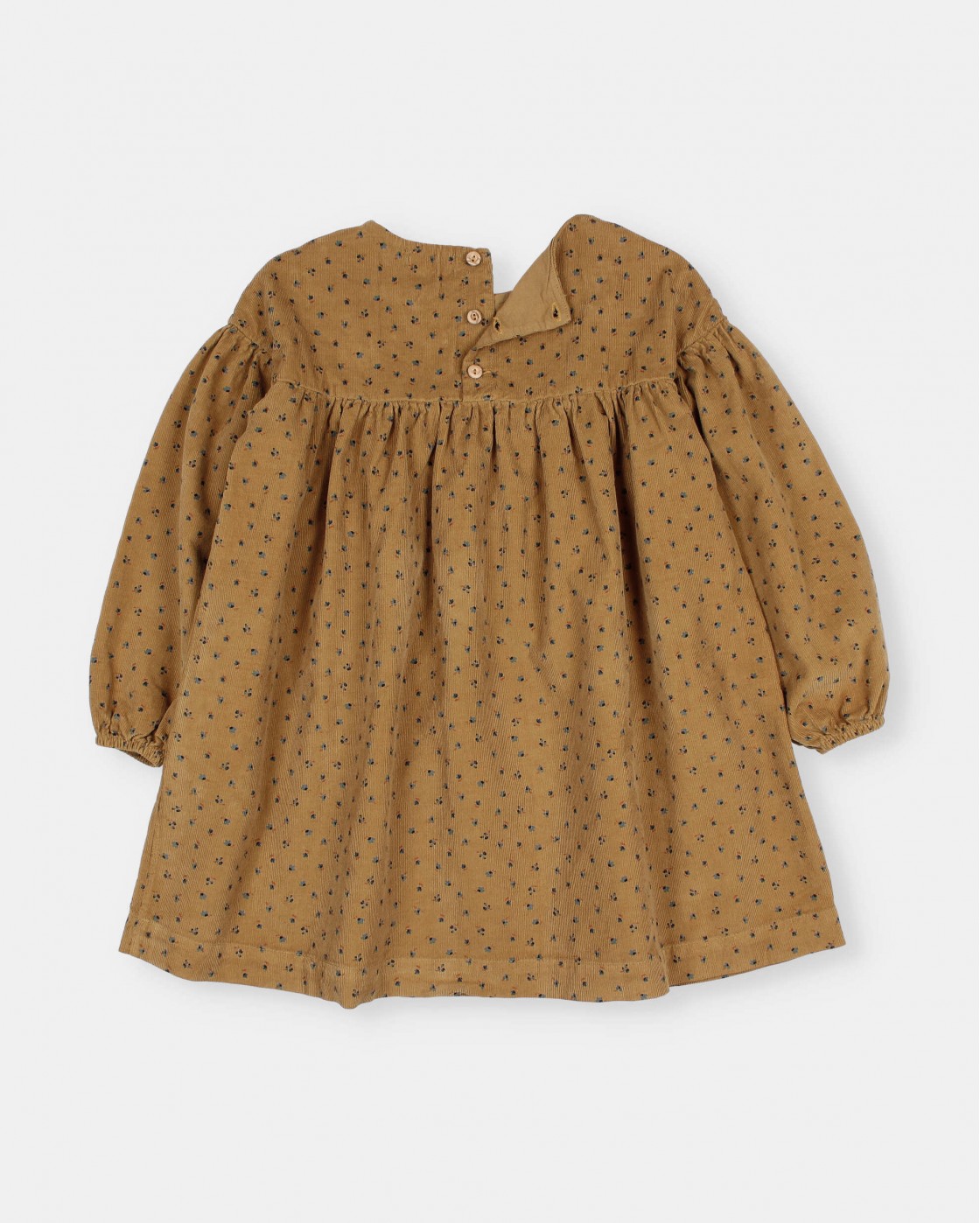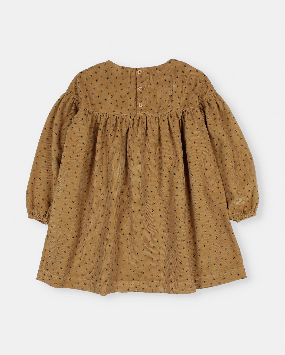 Micro corduroy dress with "fall" print. Long puffed sleeves. Round neck with button fastening at the back. Ruffle detail on the yoke. Gathered skirt.