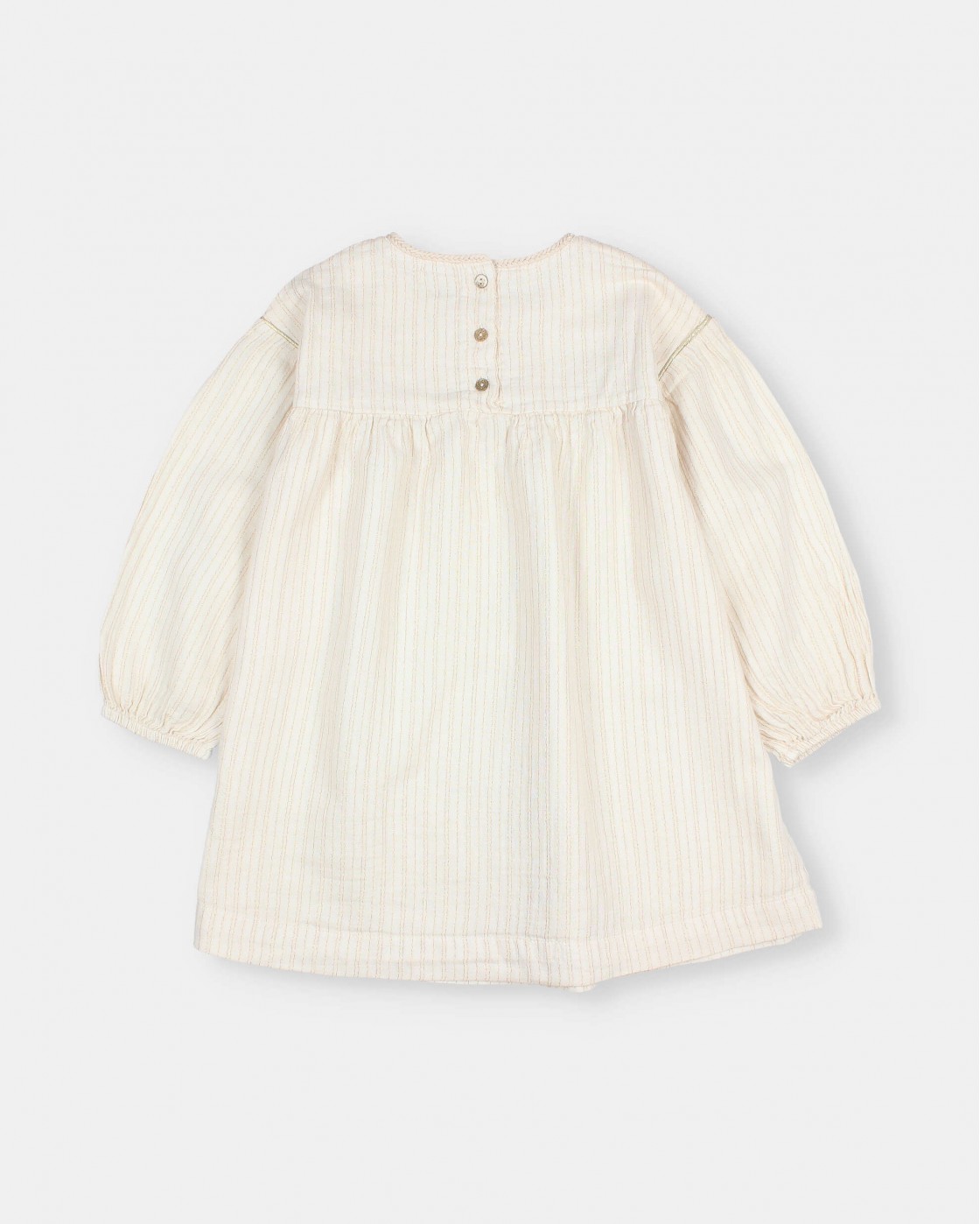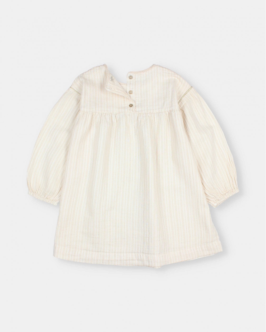 Double gauze with fine stripe lurex blouse dress. Puffed long sleeves. Round neck with braided finish detail. Button fastening at the back. Lurex piping detail on yoke and armholes.