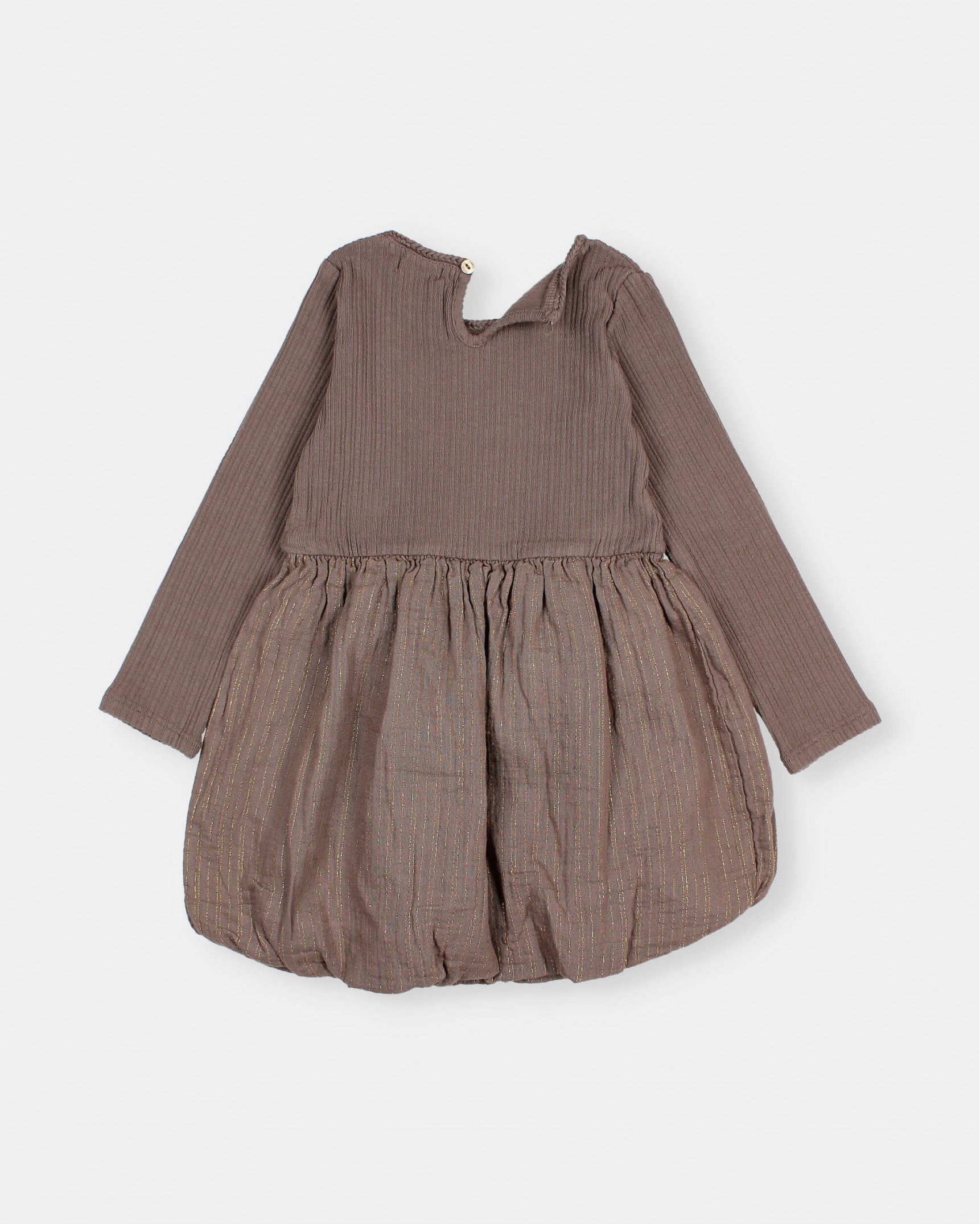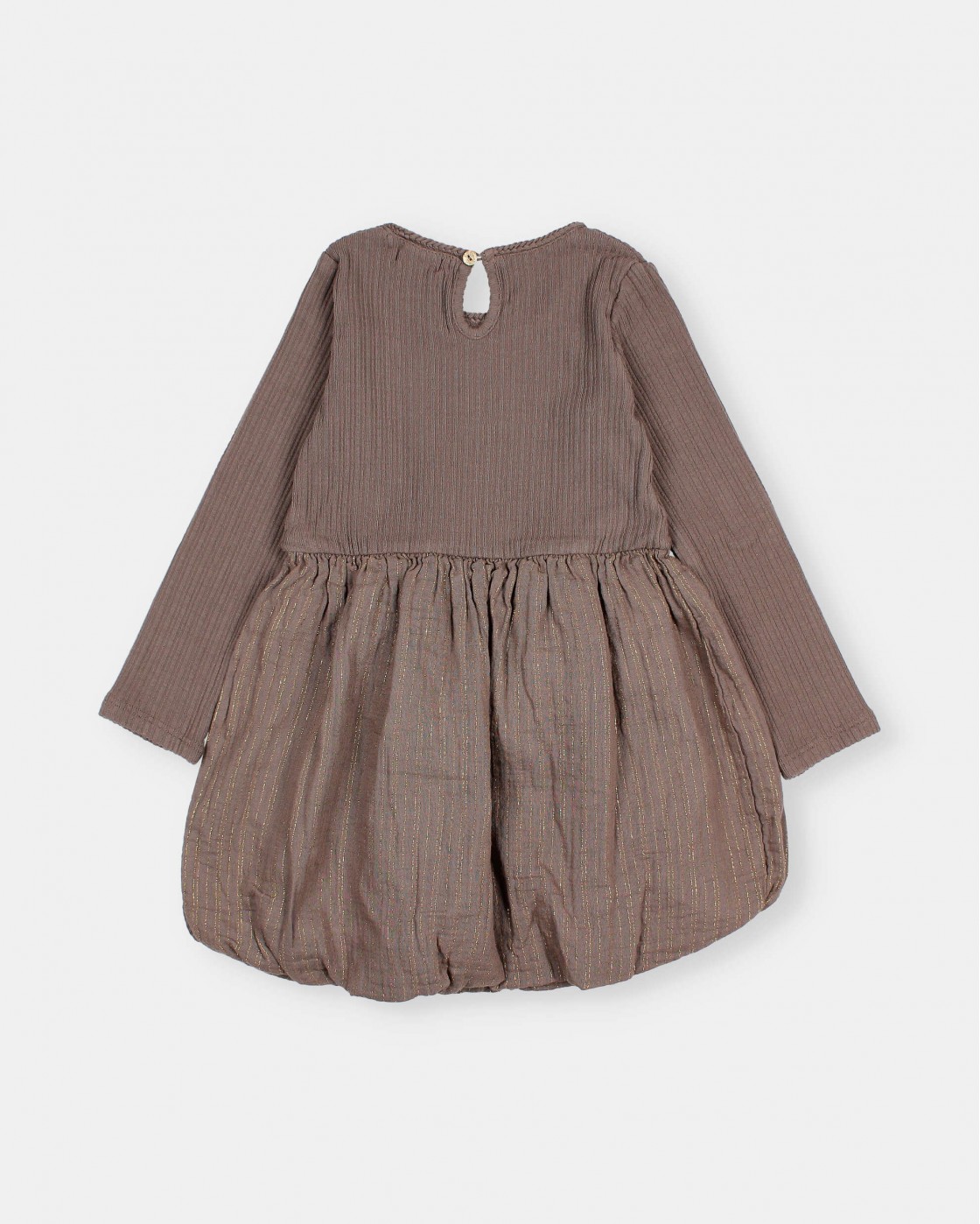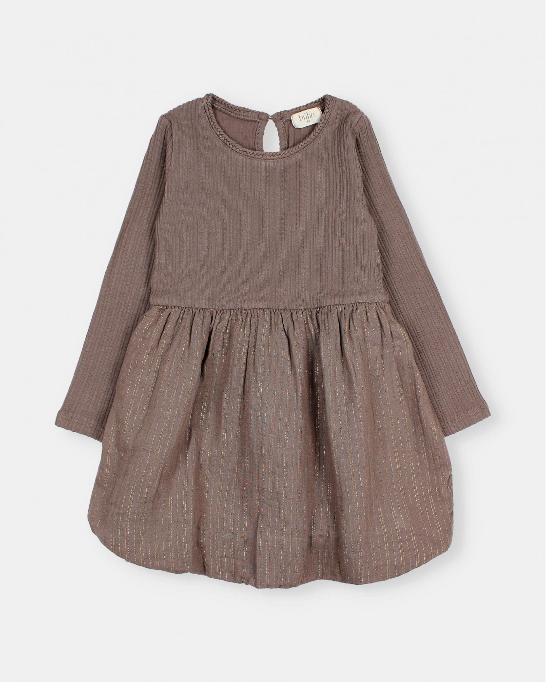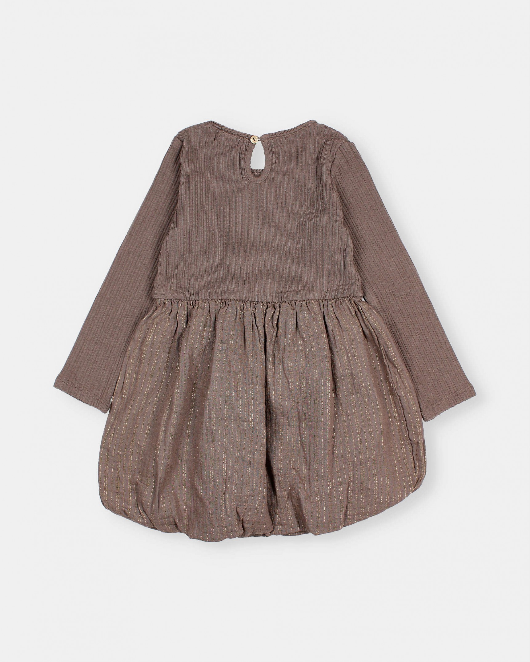 Combined lurex dress. Long sleeve ribbed body. Round braided neckline with tear-drop fastening at the back. Double gauze with fine stripe lurex puffed skirt.