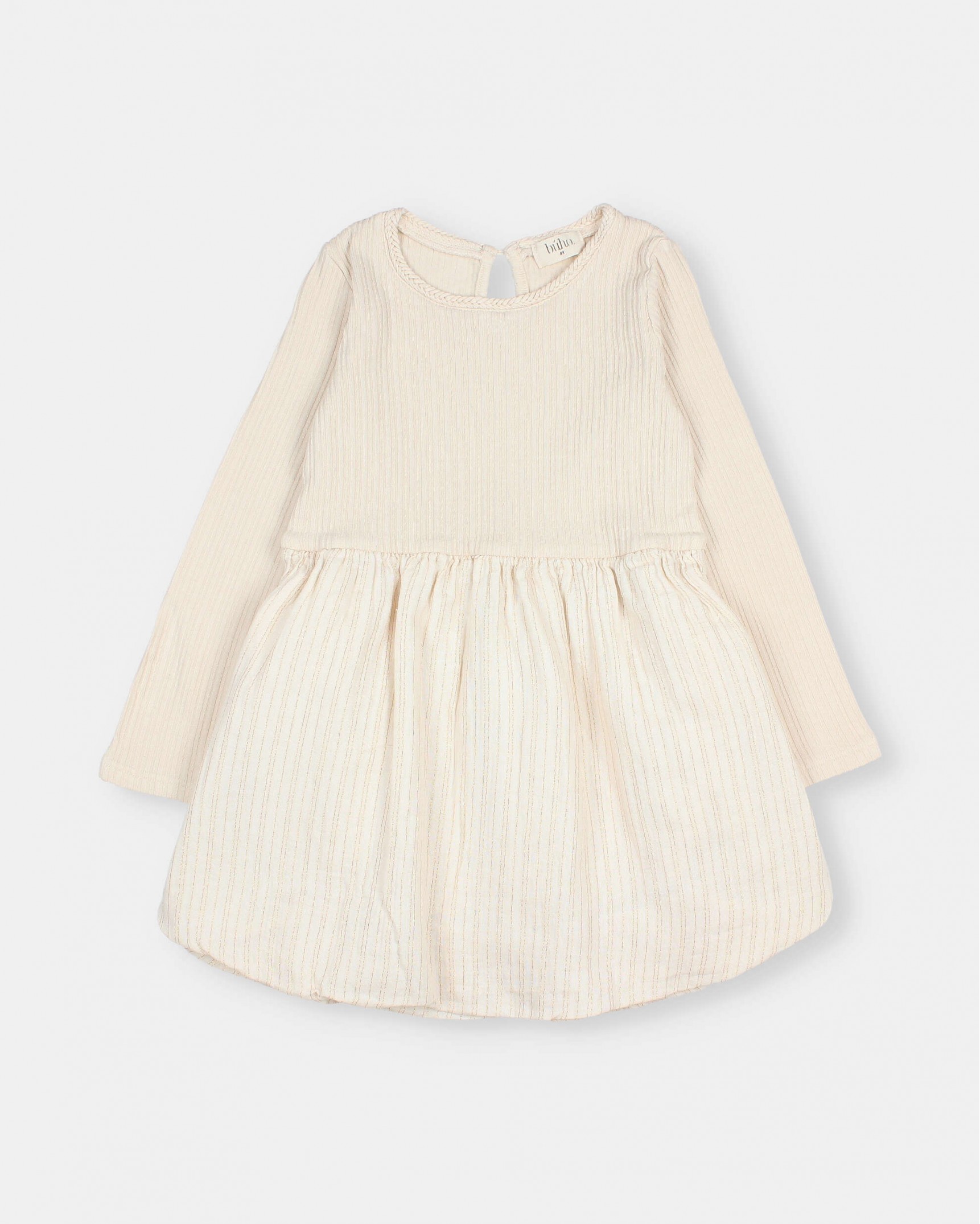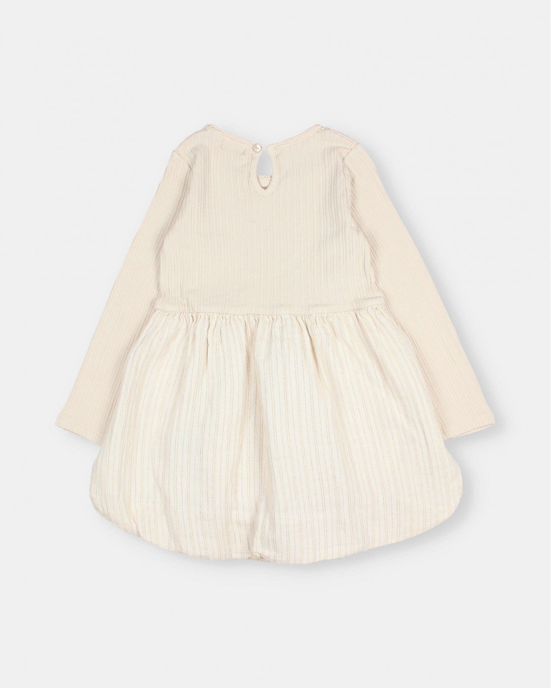 Combined lurex dress. Long sleeve ribbed body. Round braided neckline with tear-drop fastening at the back. Double gauze with fine stripe lurex puffed skirt.