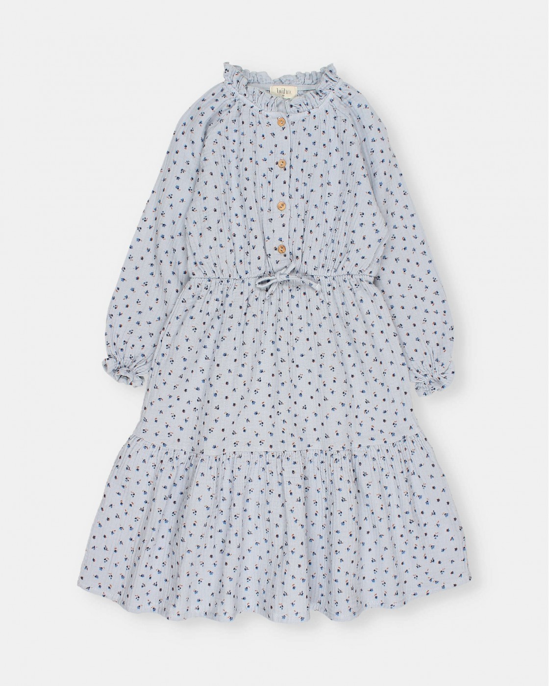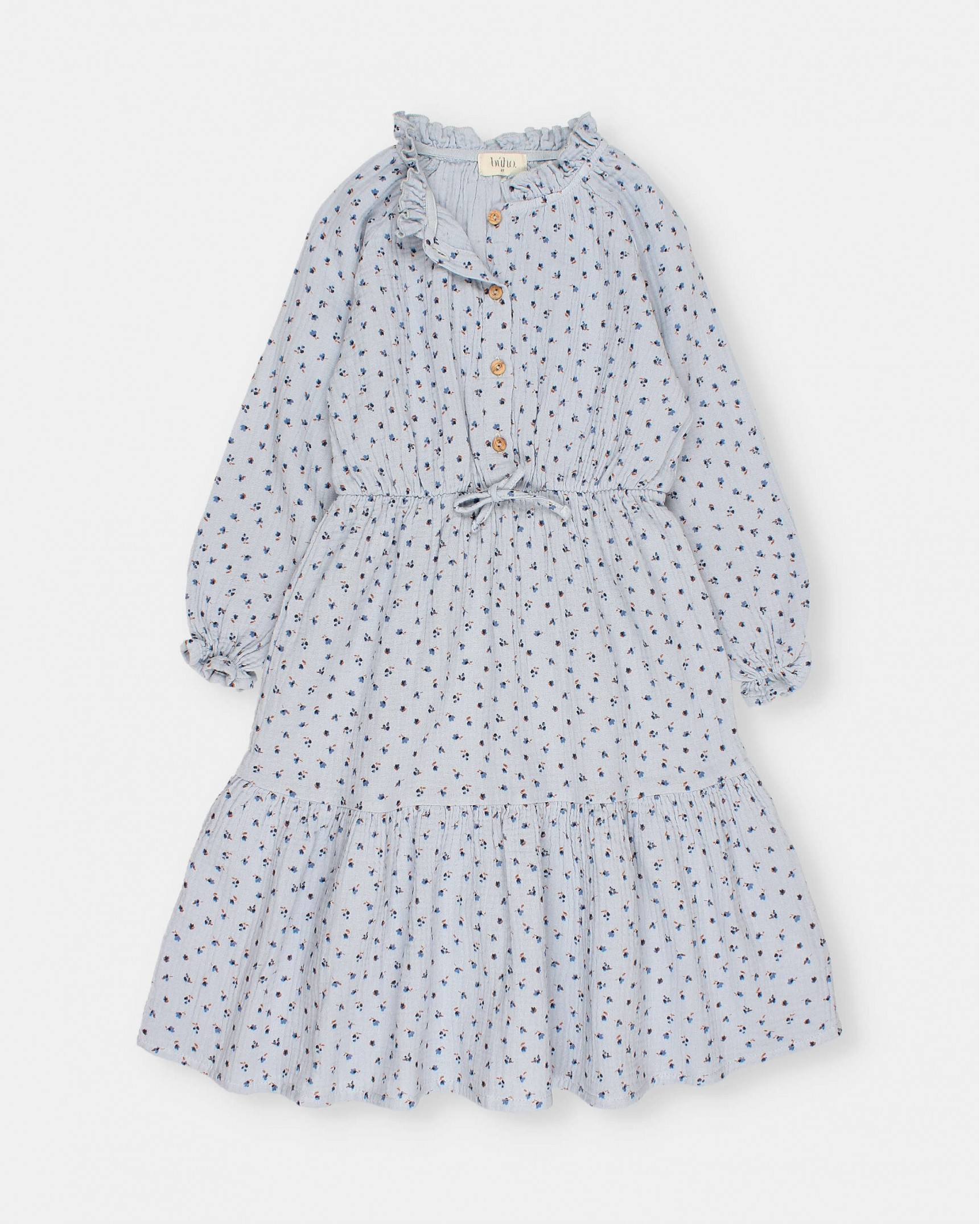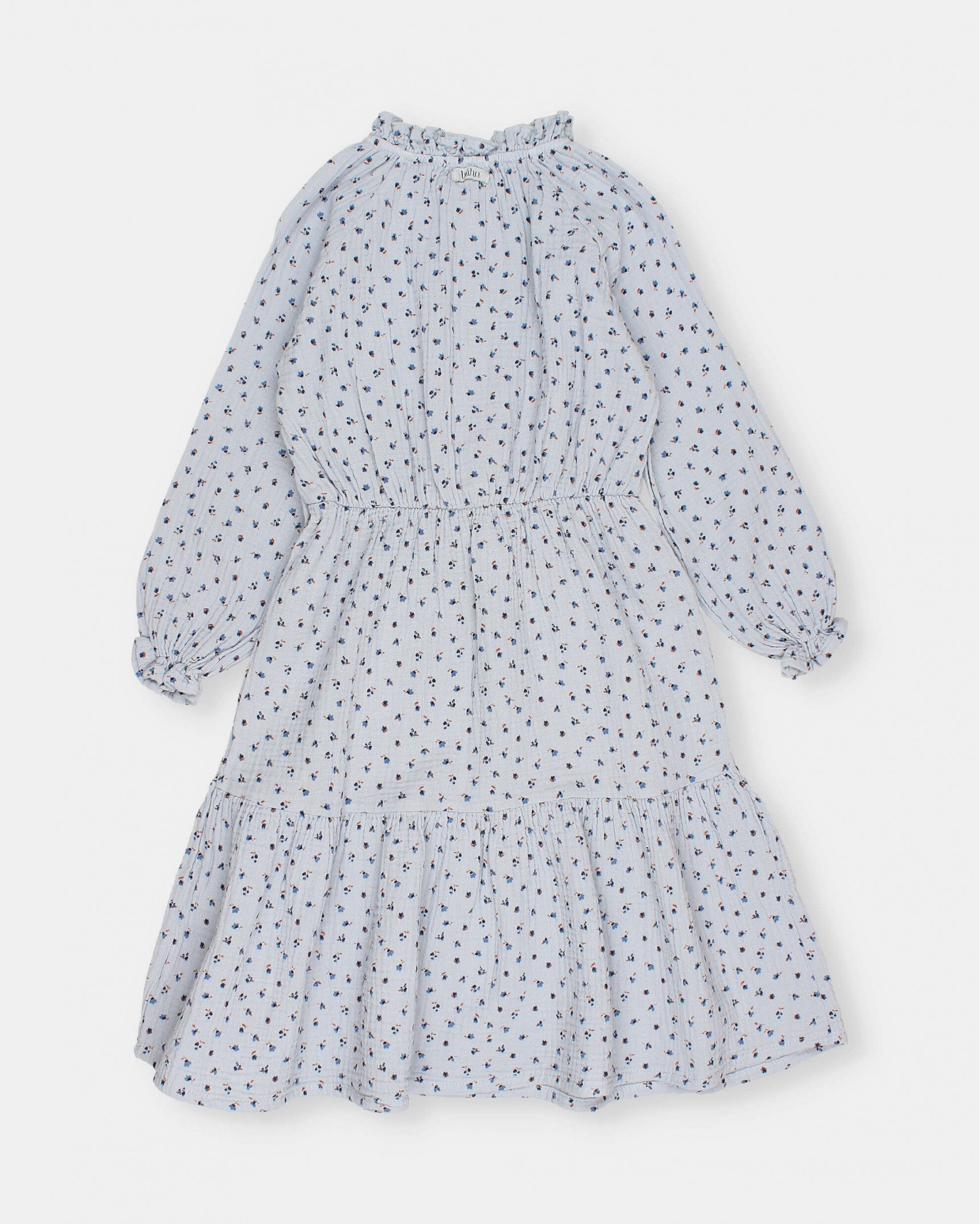 Long muslin dress with "fall" print. Front buttoning to the waist. Long sleeves with elastic cuffs and frill. Round neckline with ruffle. Elastic waist with decorative bow in the centre. Ruffled skirt with ruffle and flounce.