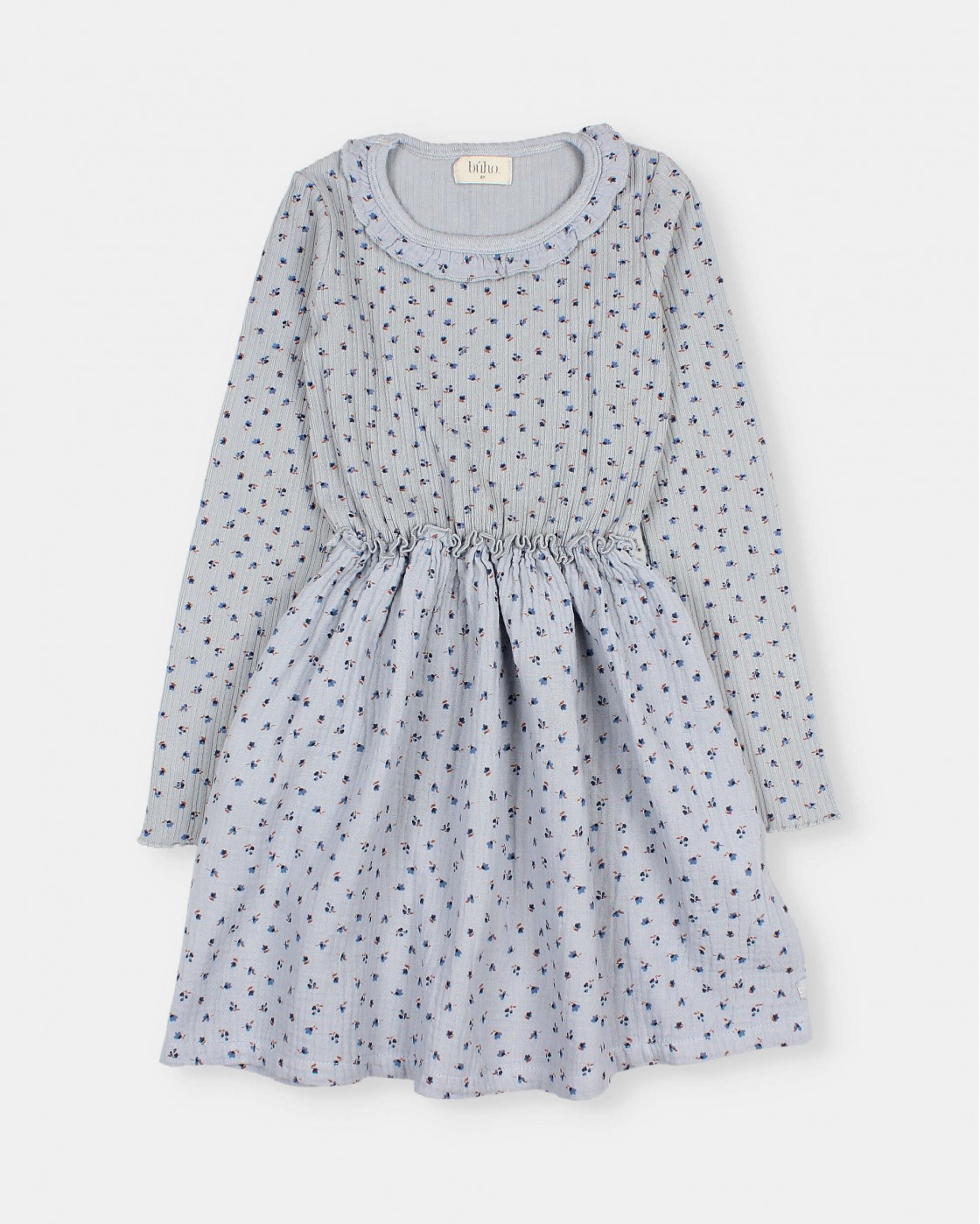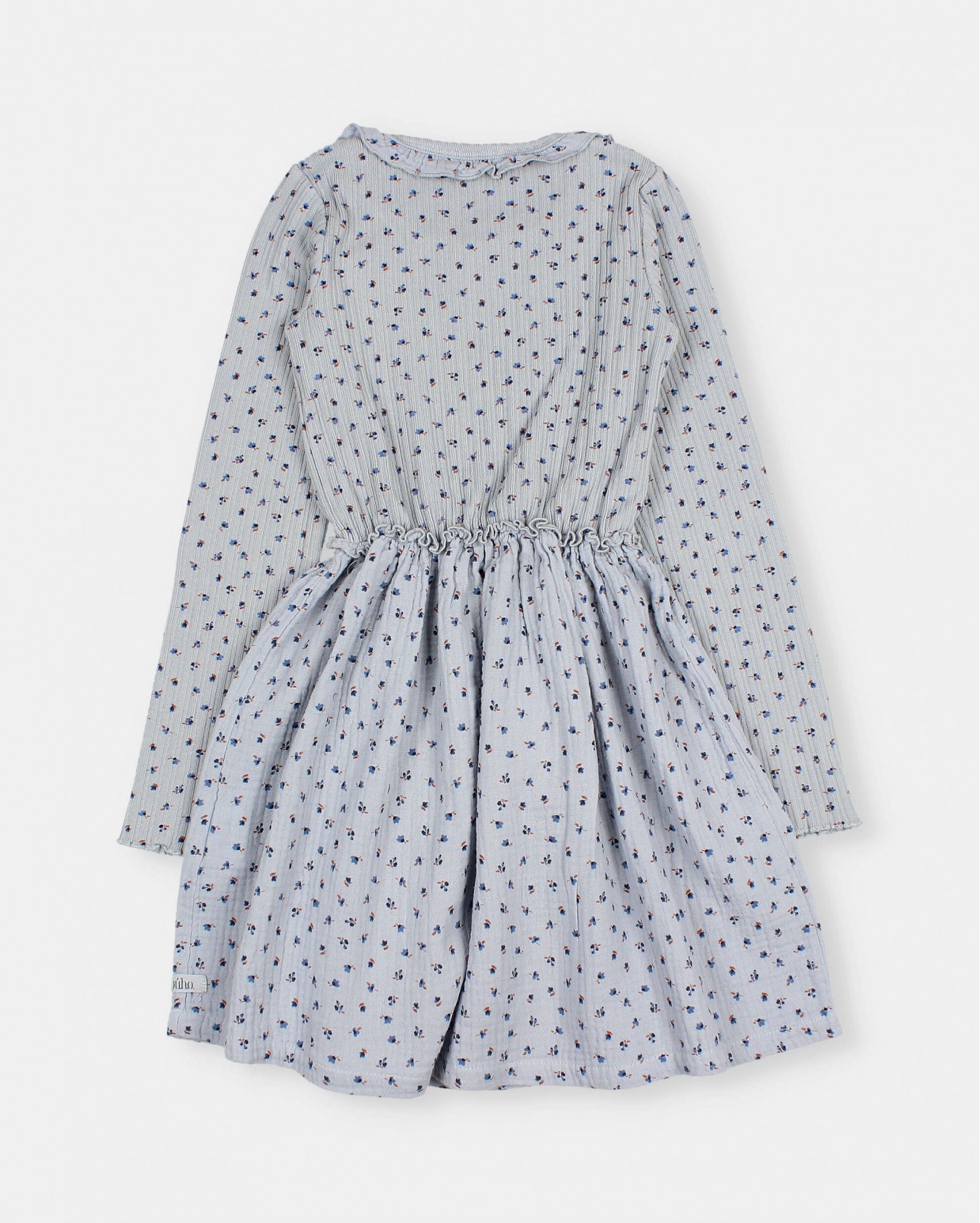 Combined dress with "fall" print. Long sleeve ribbed body with overlapping gathered muslin skirt. Round neckline with ruffle. Muslin skirt with ruffle.