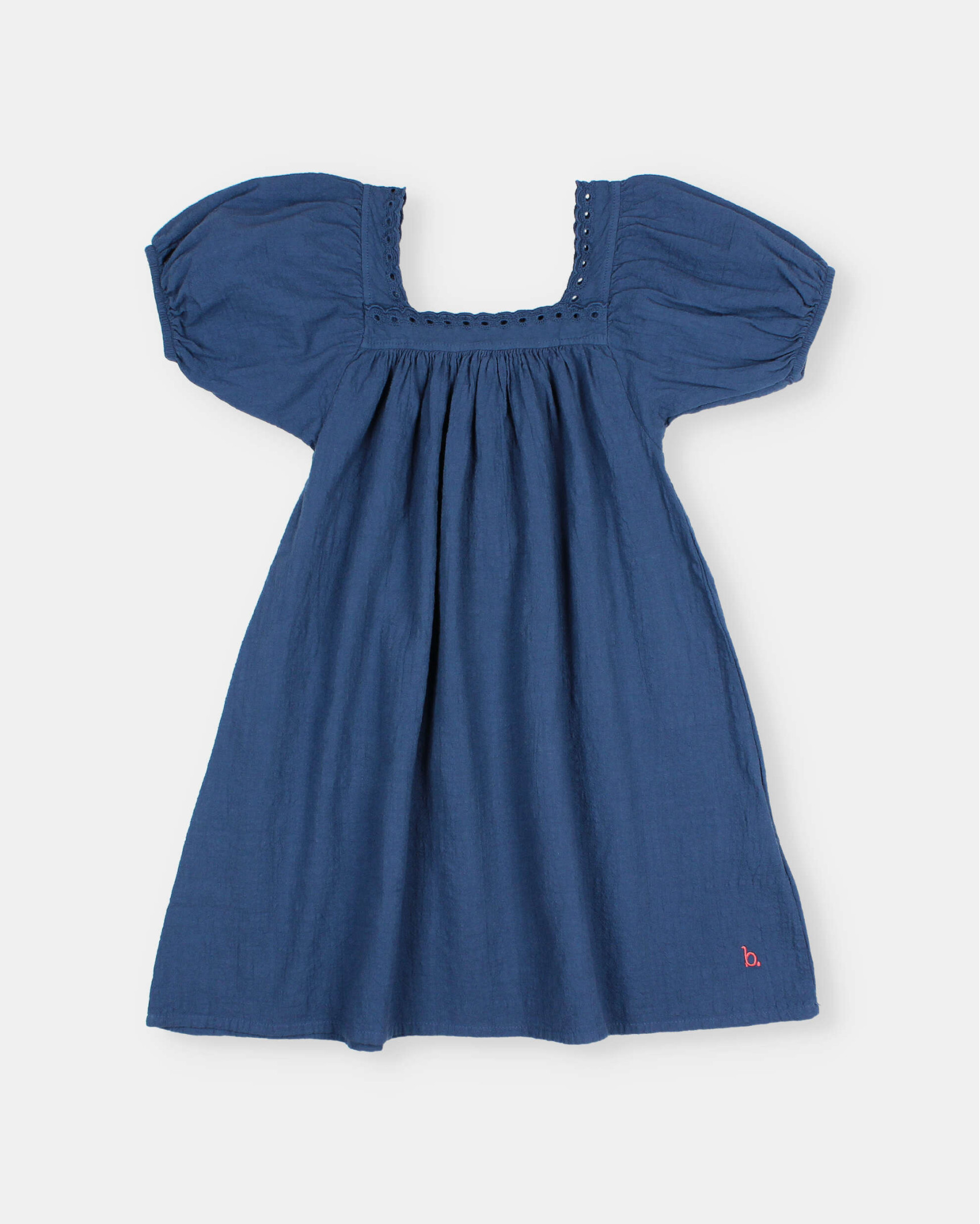 Textured organic cotton dress. Square neckline with lace detail. Wide puff sleeves finished with elastic. Flared skirt. Contrasting embroidered detail on the side of the hem.
