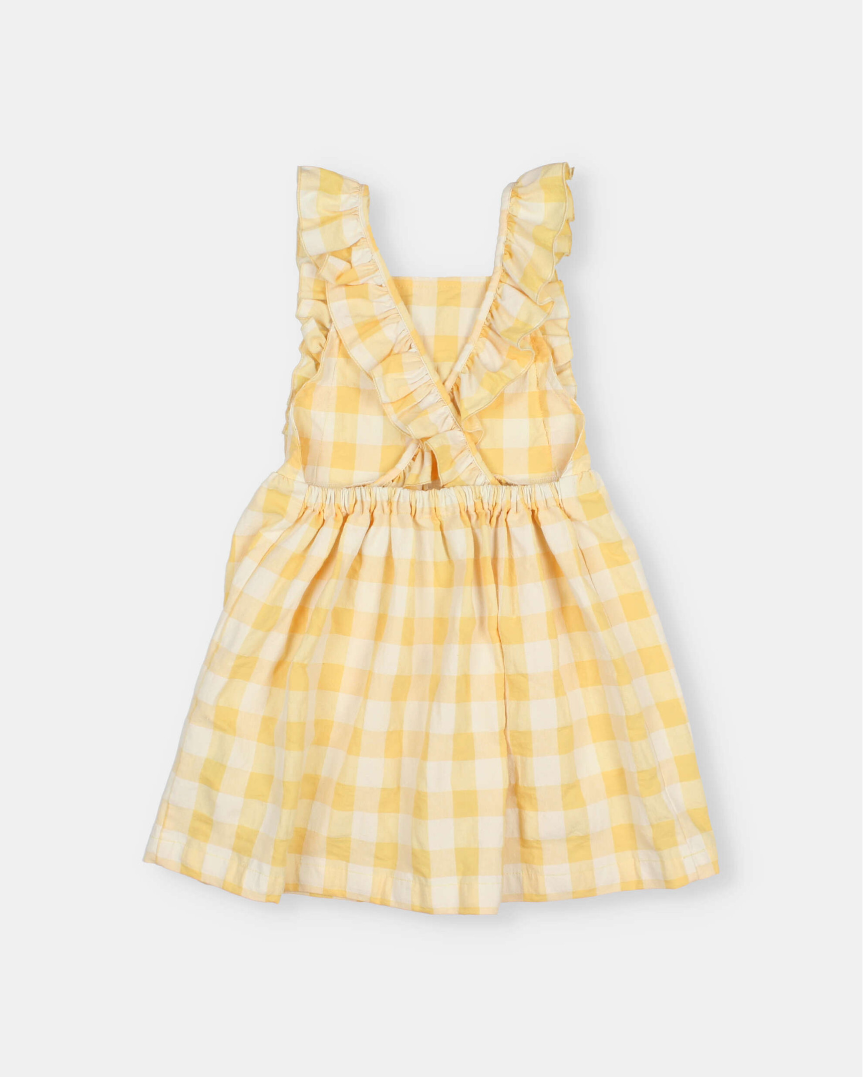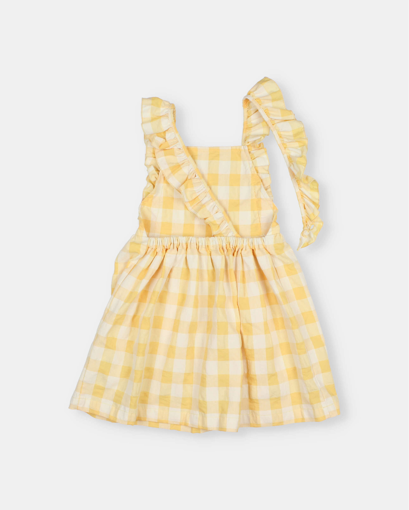 Gingham dress in cotton seersucker. Straight neckline. Crossed straps at the back with ruffle. Elastic waistband at the back. Flared bottom. Plastron pockets with onduline ribbon detail and contrasting embroidery.