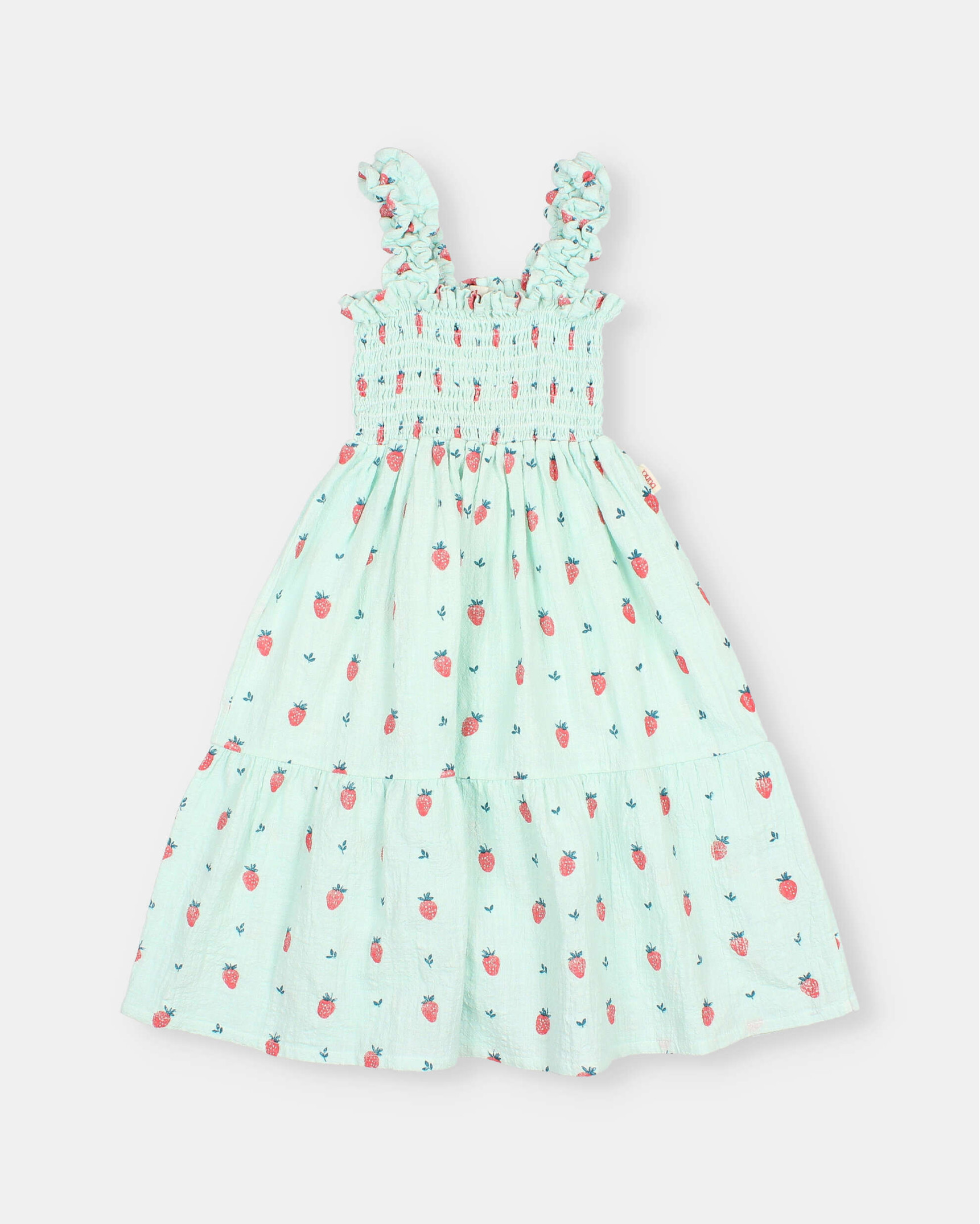 Textured organic cotton dress with strawberry print. Straight neckline. Elastic chest with gathering. Elastic straps with ruffles. Gathered skirt with flare.