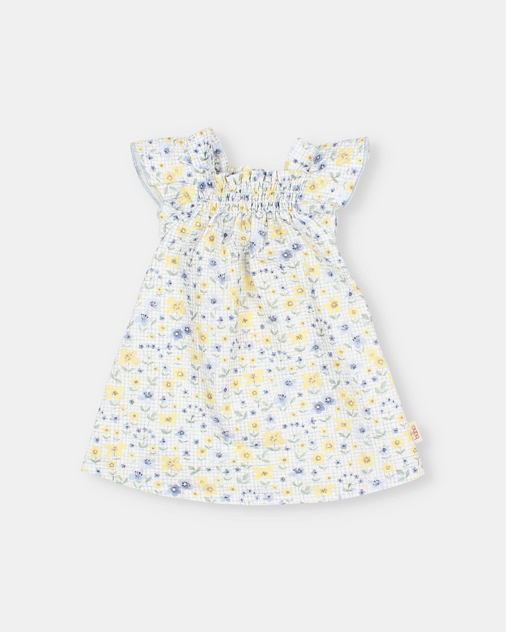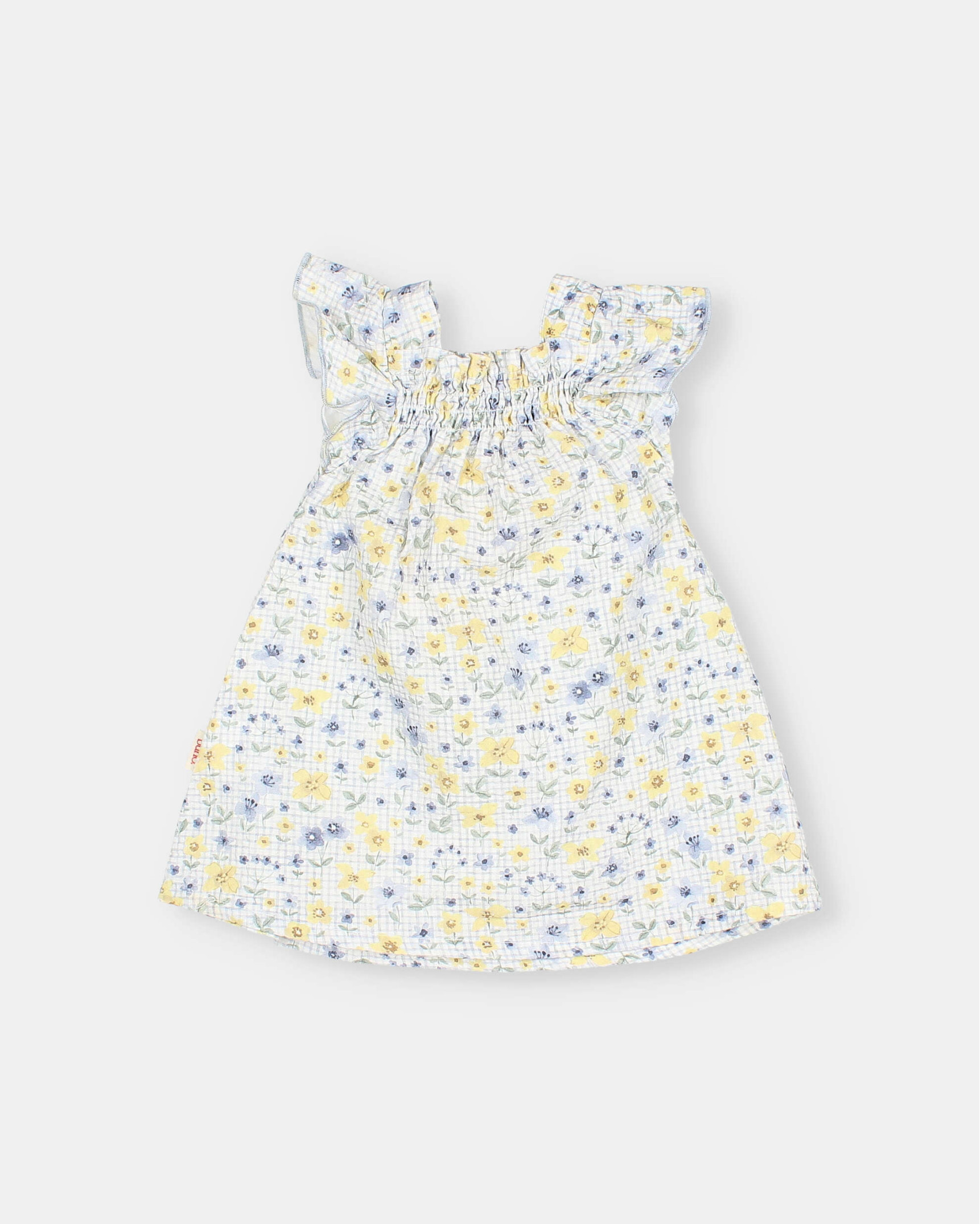 Cotton seersucker dress with picnic print. Ruffled straps with contrasting gathered trim. Elastic neckline with gathering. Flared skirt.