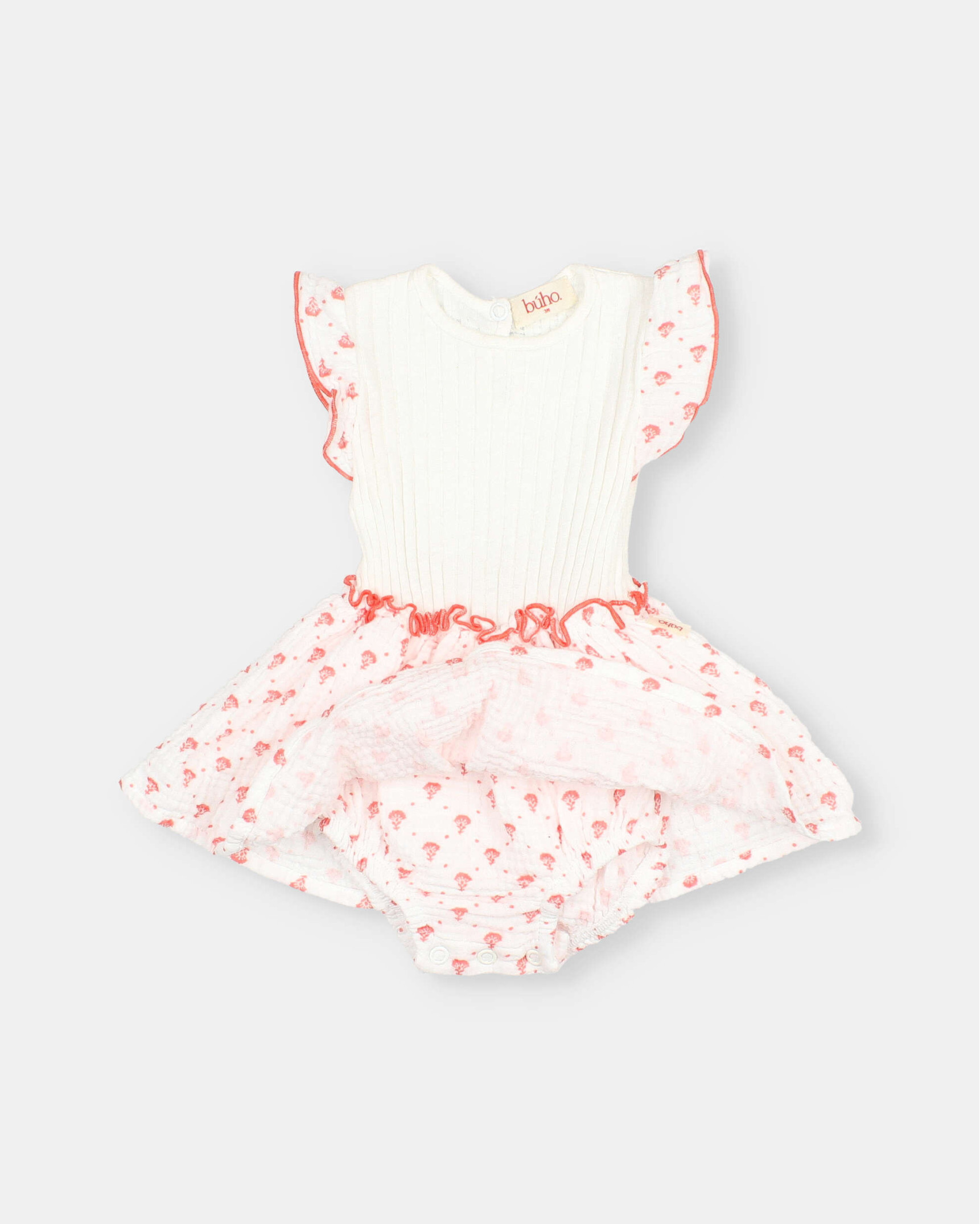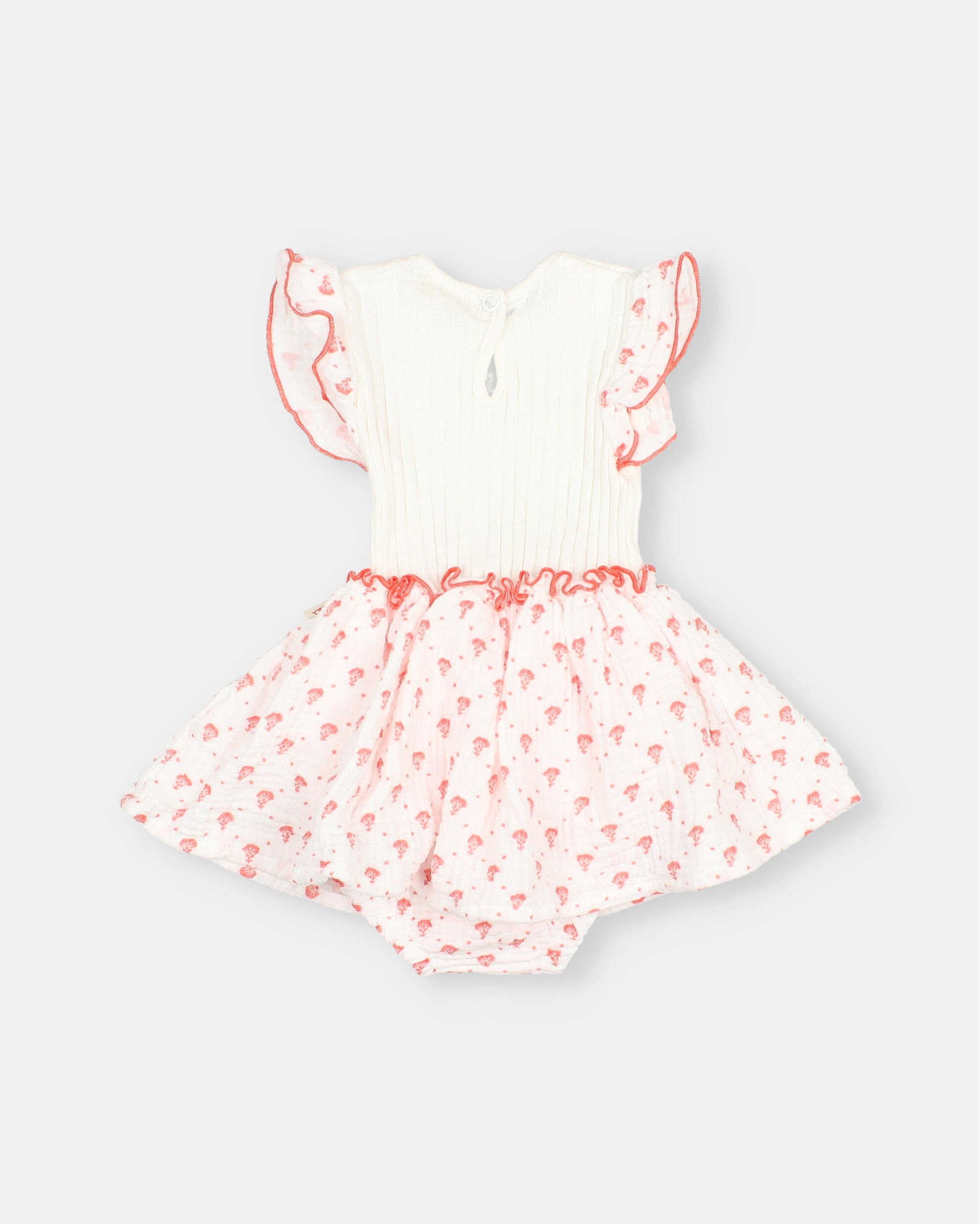 Round neck dress with textured straps and bali print. Ribbed top. Teardrop opening with press stud at the back. Organic cotton muslin skirt with bali print. Inner culotte with press studs at the crotch for easy dressing. Elastic waistband and thighs. Contrast piping detail.