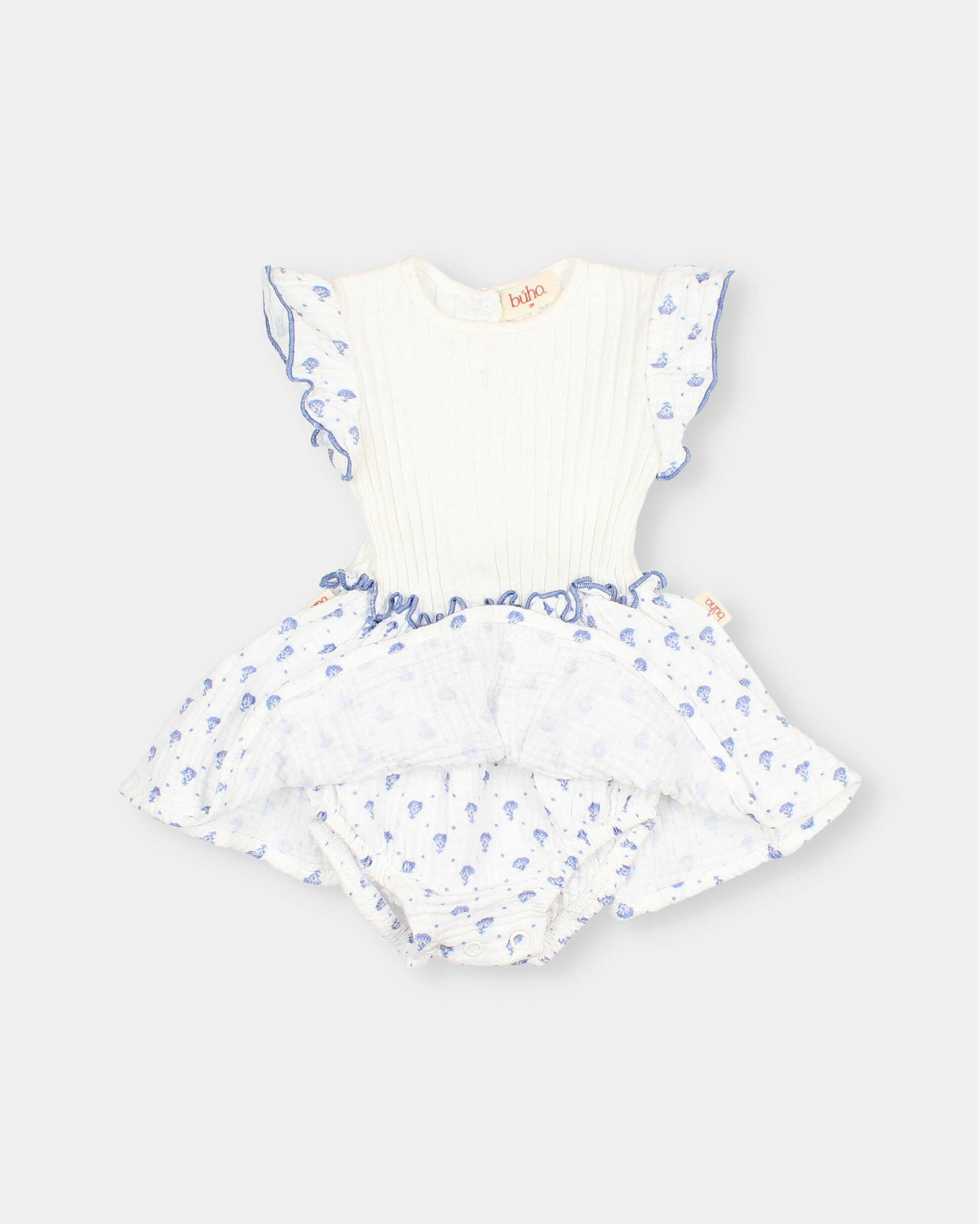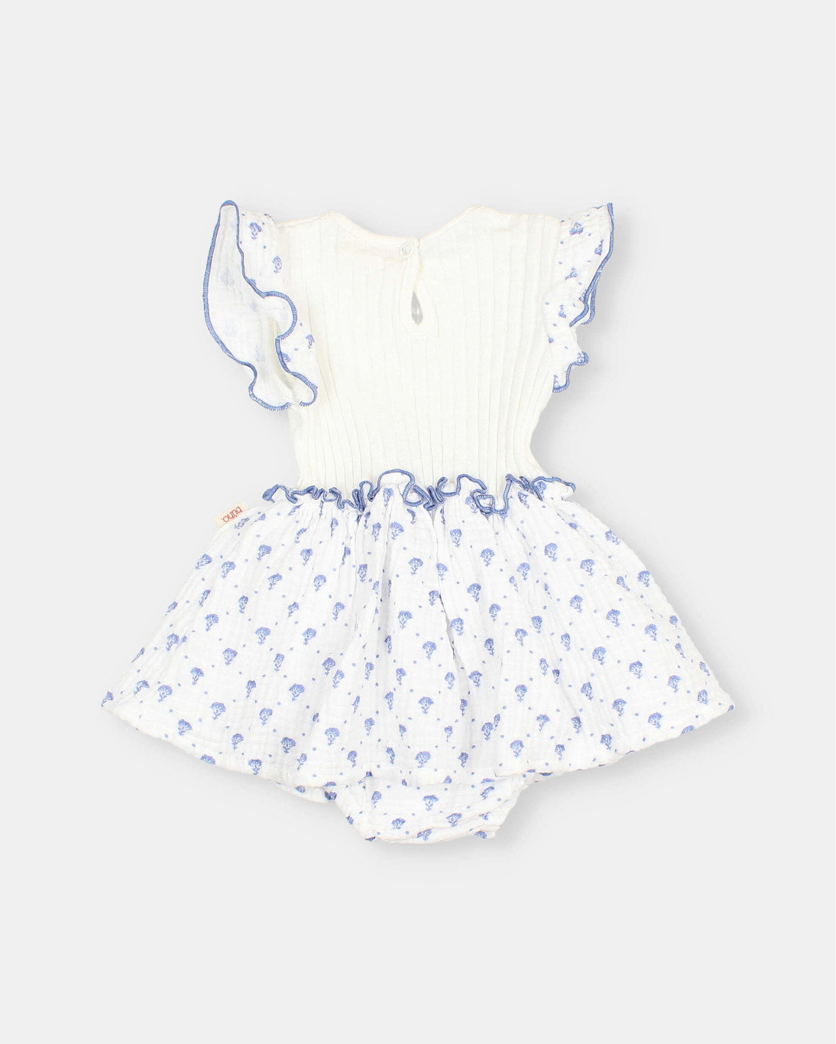 Round neck dress with textured straps and bali print. Ribbed top. Teardrop opening with press stud at the back. Organic cotton muslin skirt with bali print. Inner culotte with press studs at the crotch for easy dressing. Elastic waistband and thighs. Contrast piping detail.