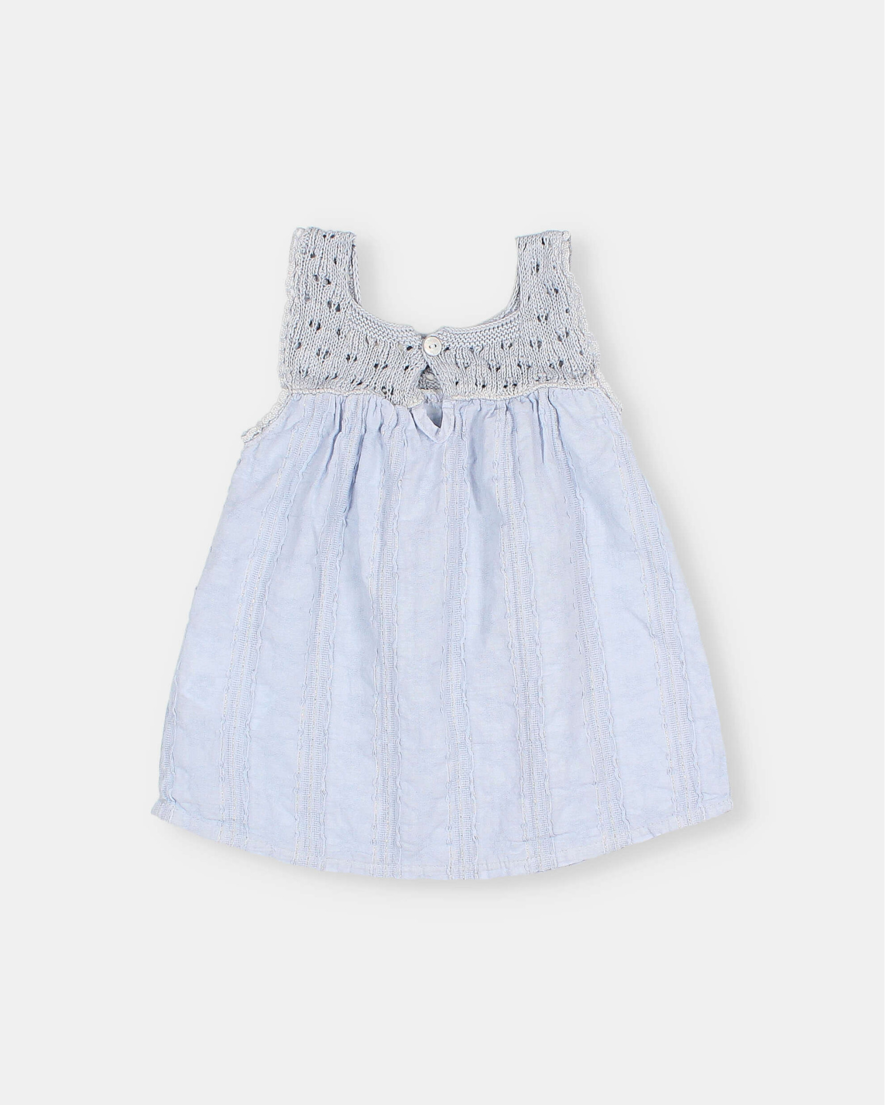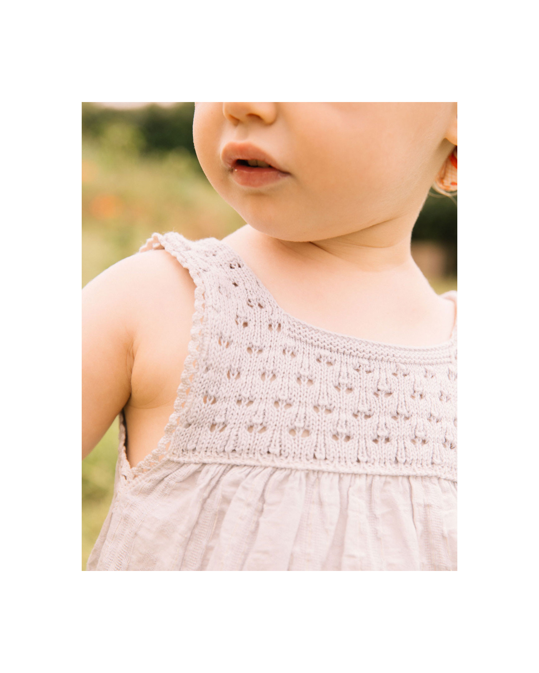 Striped knitted romper in organic cotton. Straight neckline. Straps with ruffles. Strawberry embroidery on the chest. Fastens with press studs at the crotch for easy dressing. Elastic waistband and ruffles on the thighs.
