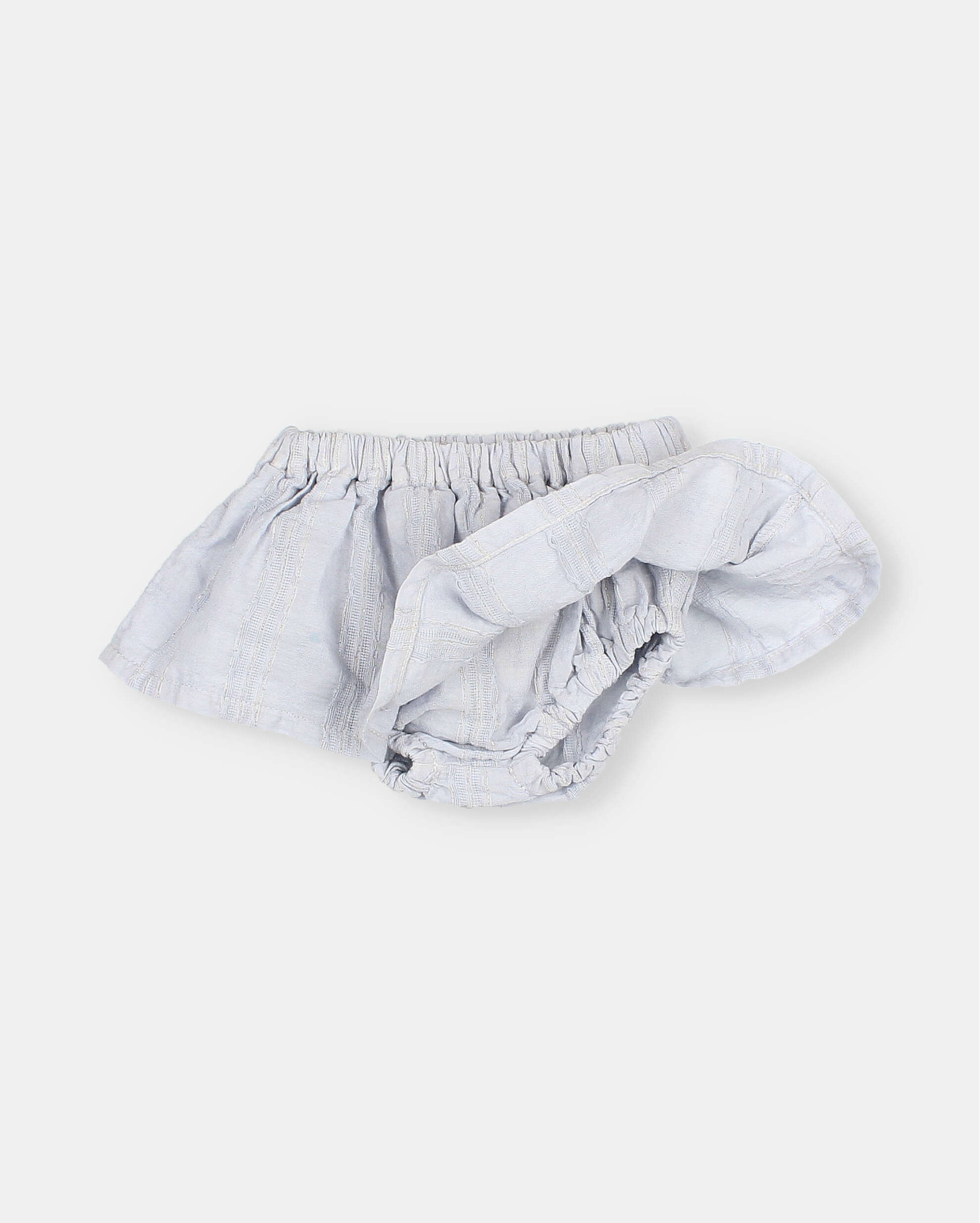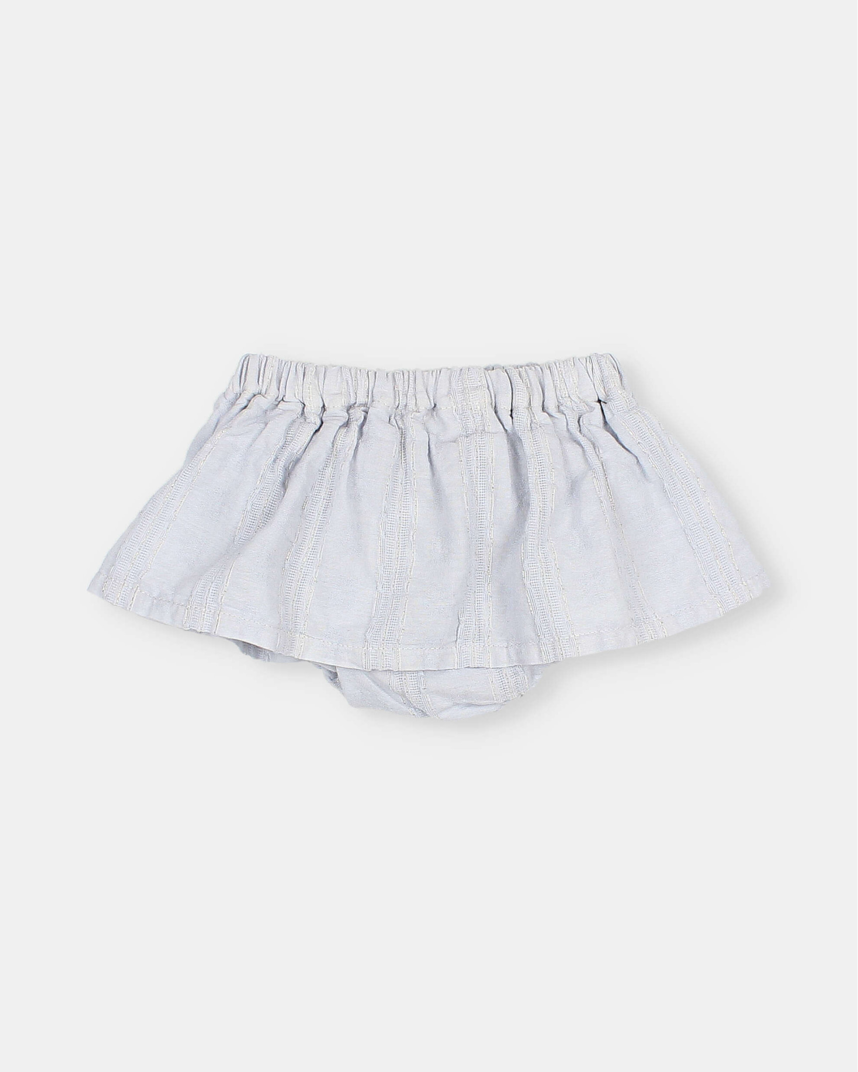 Cotton voile skirt-culotte with jacquard and delicate lurex stripes. Elastic waistband and thighs. Flared skirt.