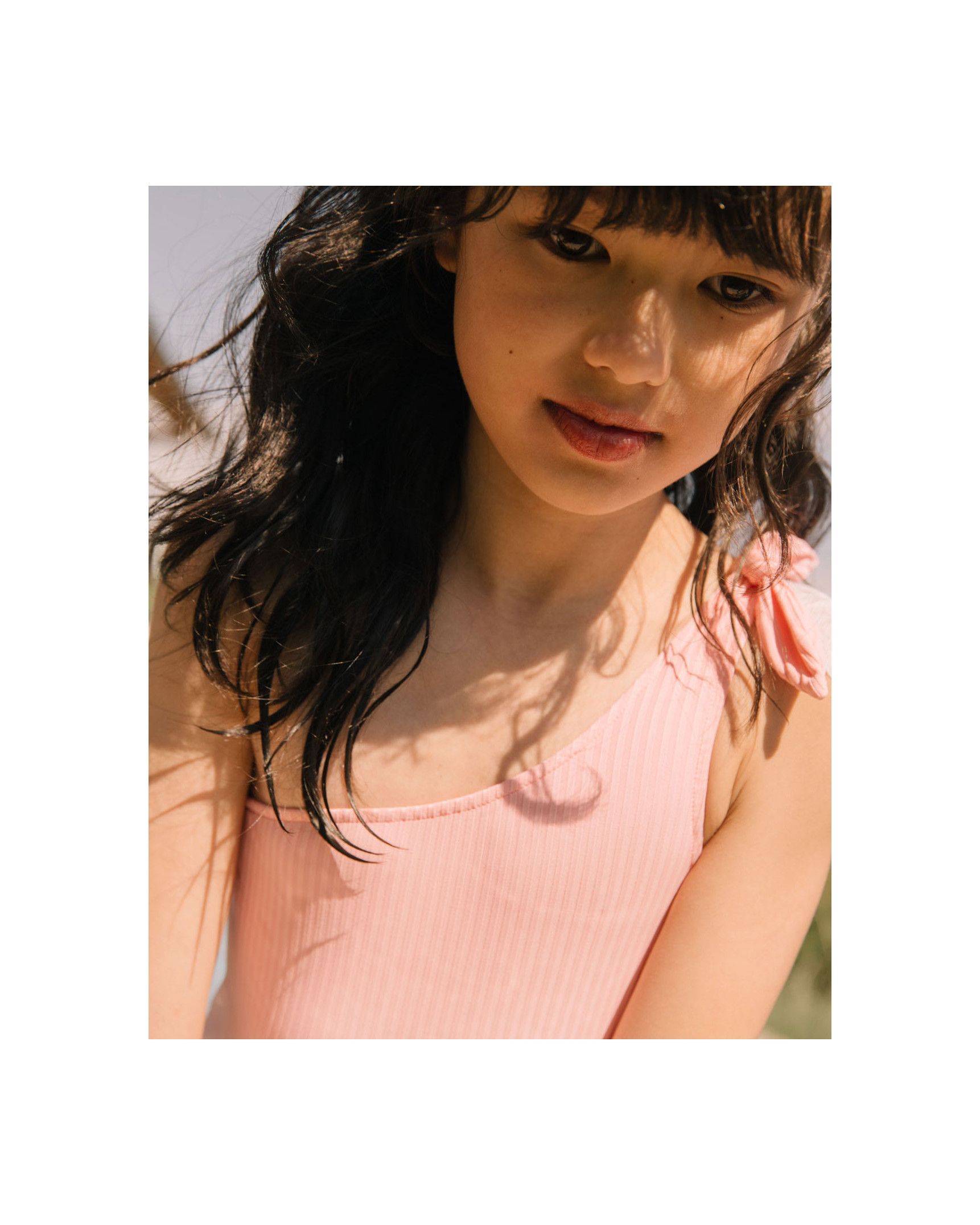 Ribbed polyamide maillot with asymmetrical neckline, strap and decorative bow.