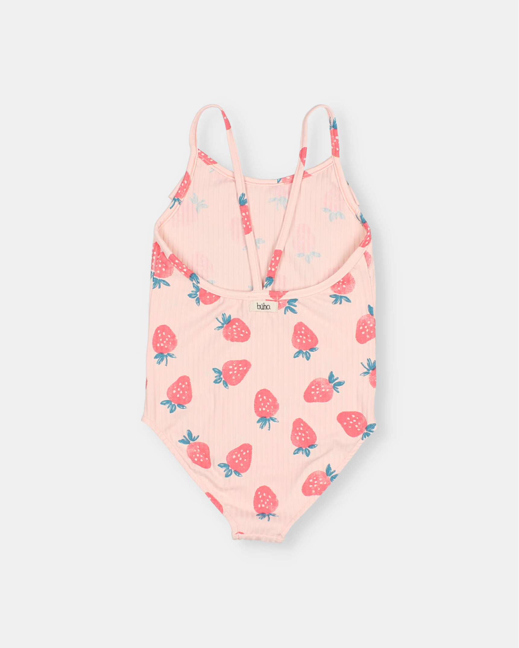 Ribbed polyamide maillot with strawberry print. Round neckline with ruffle. Elastic straps. Low-cut back.