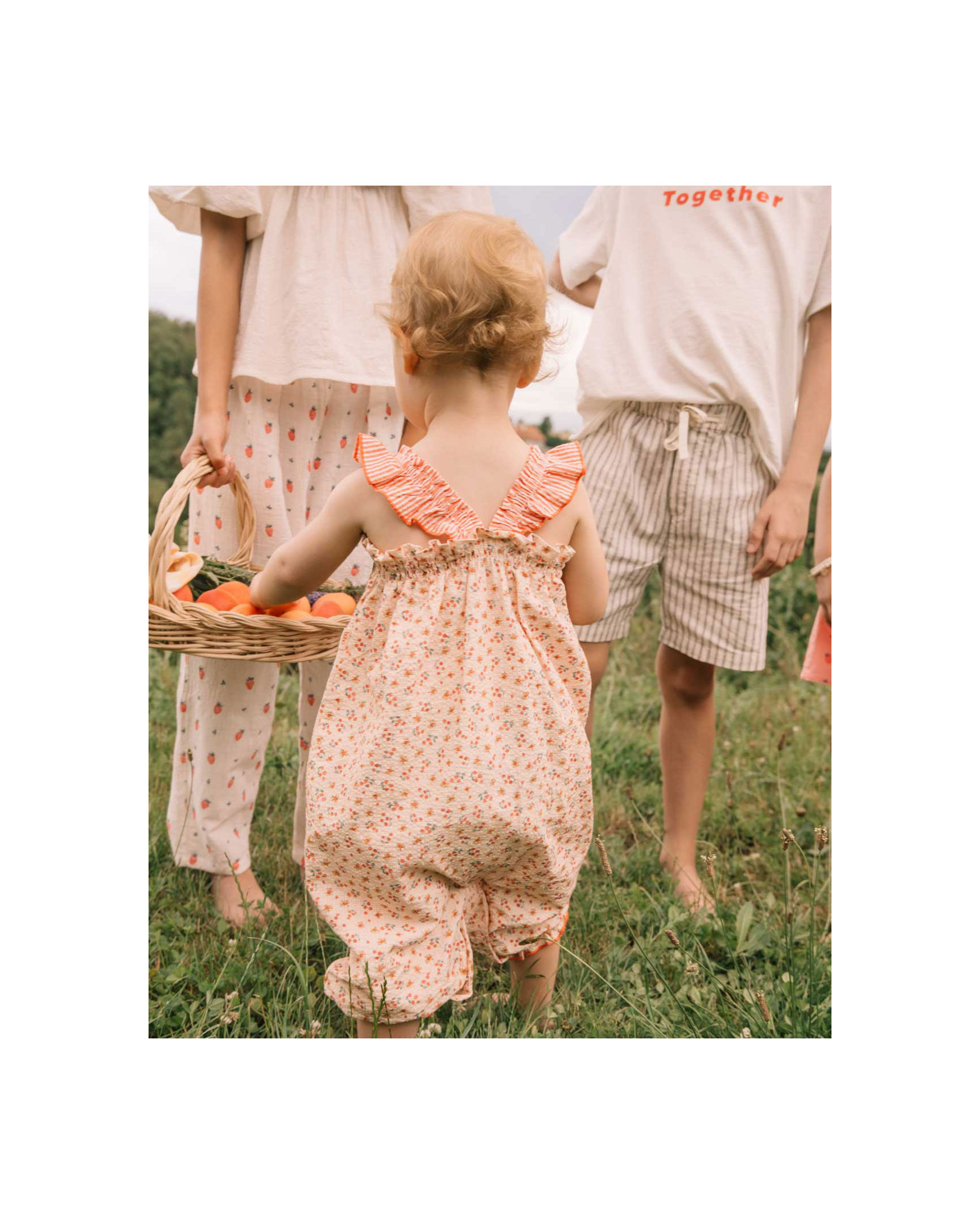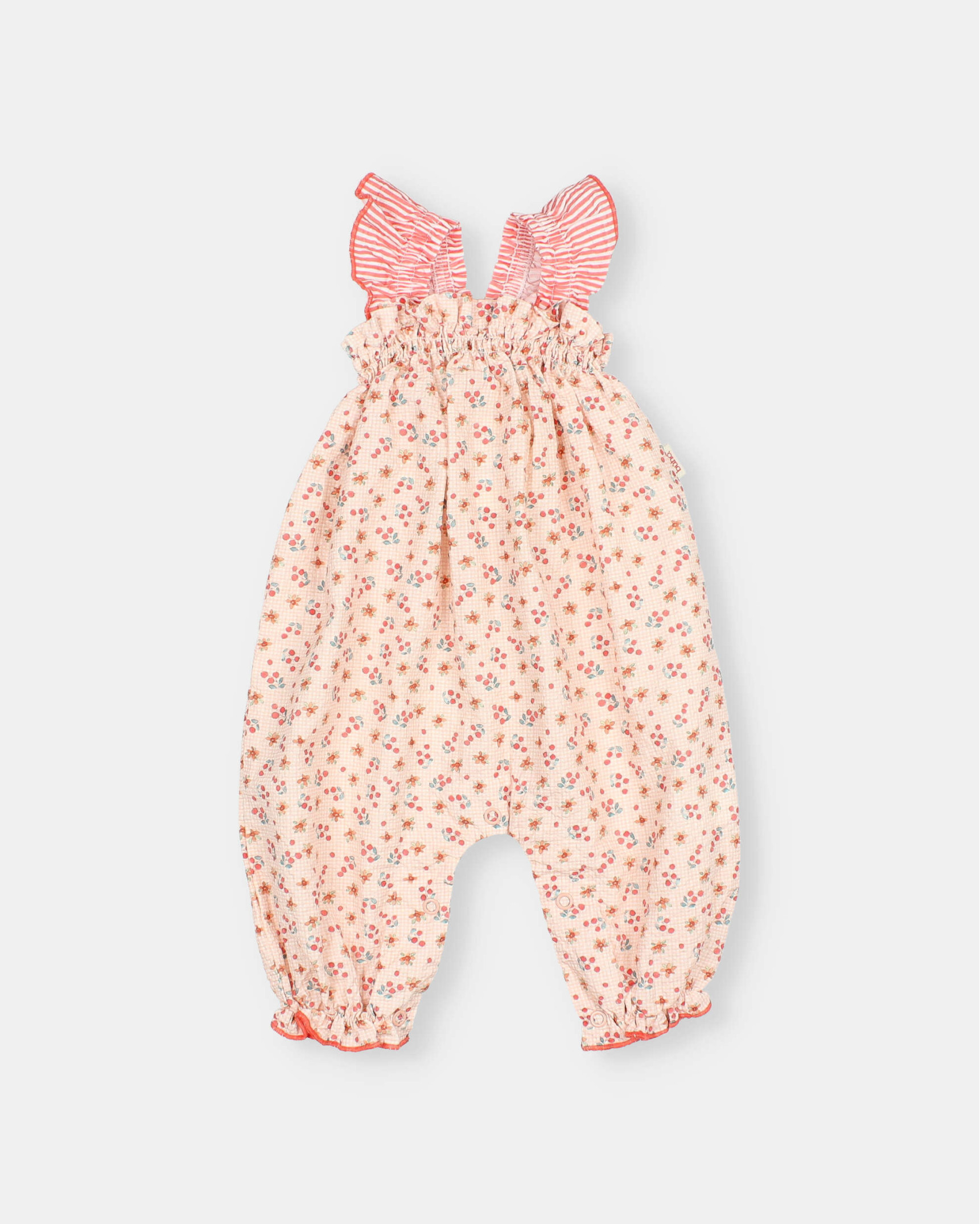 Wide-leg cotton seersucker jumpsuit with picnic print. Elastic and gathered top. Elastic straps. Popper fastening at the crotch for easy dressing. Elastic hem. Contrast piping trim.