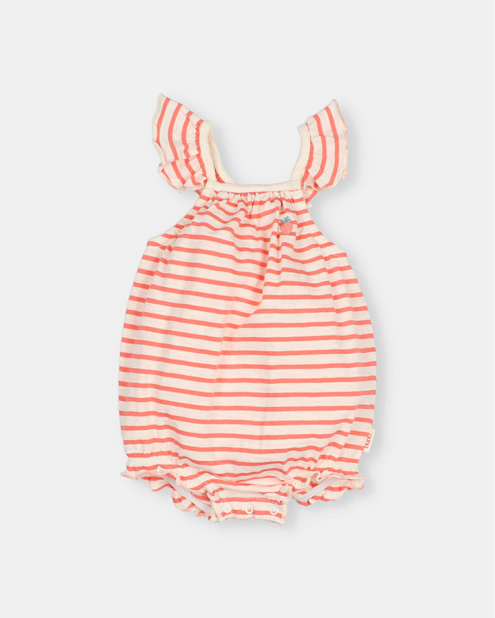 Striped knitted romper in organic cotton. Straight neckline. Straps with ruffles. Strawberry embroidery on the chest. Fastens with press studs at the crotch for easy dressing. Elastic waistband and ruffles on the thighs.
