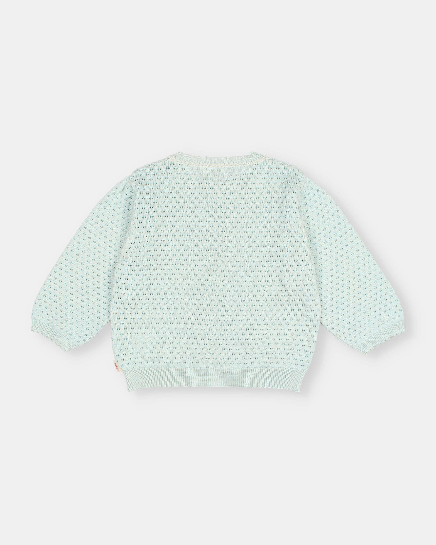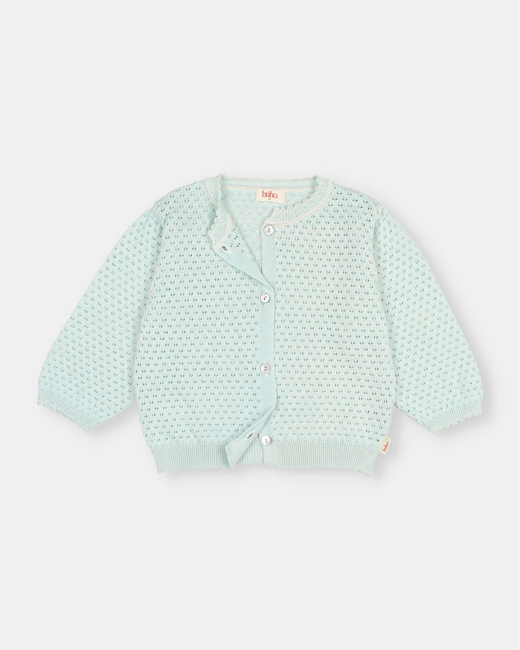 Openwork knit cardigan in organic cotton. Round neck and 3/4 sleeves. Front button fastening with mother-of-pearl buttons. Scalloped rib neckline and cuffs.