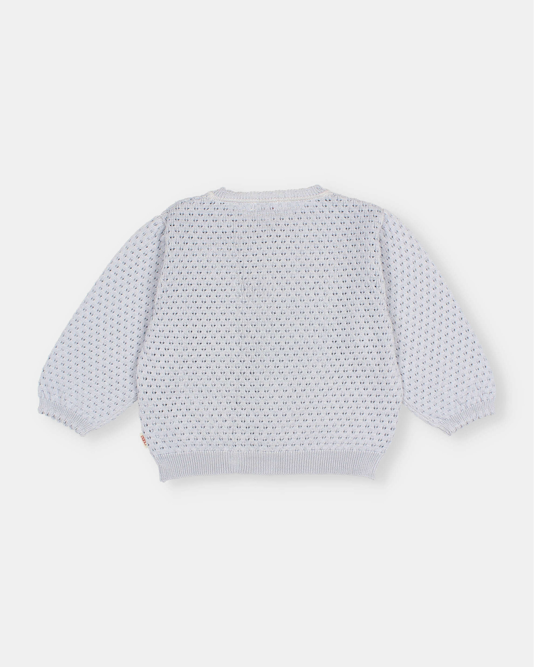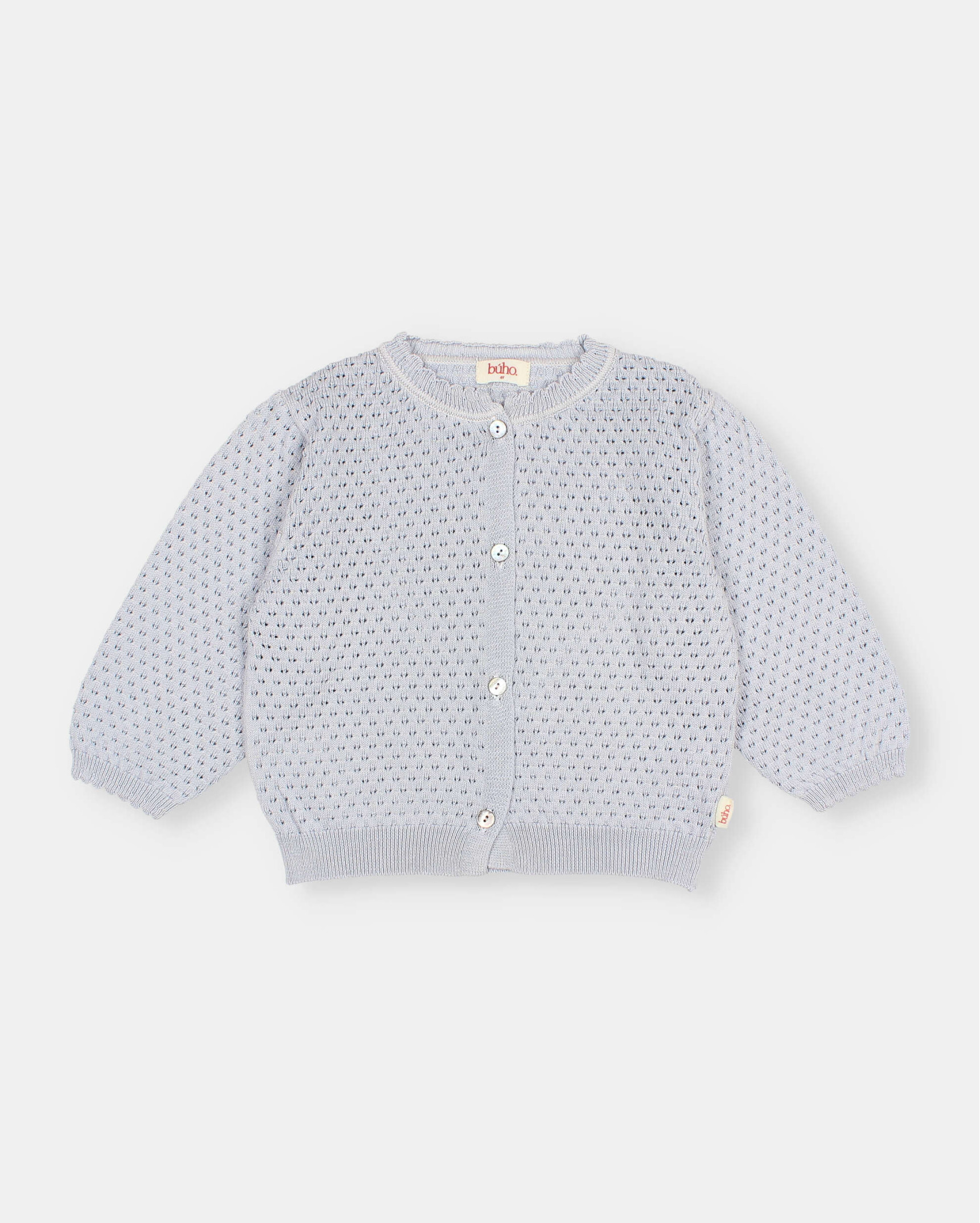 Openwork knit cardigan in organic cotton. Round neck and 3/4 sleeves. Front button fastening with mother-of-pearl buttons. Scalloped rib neckline and cuffs.