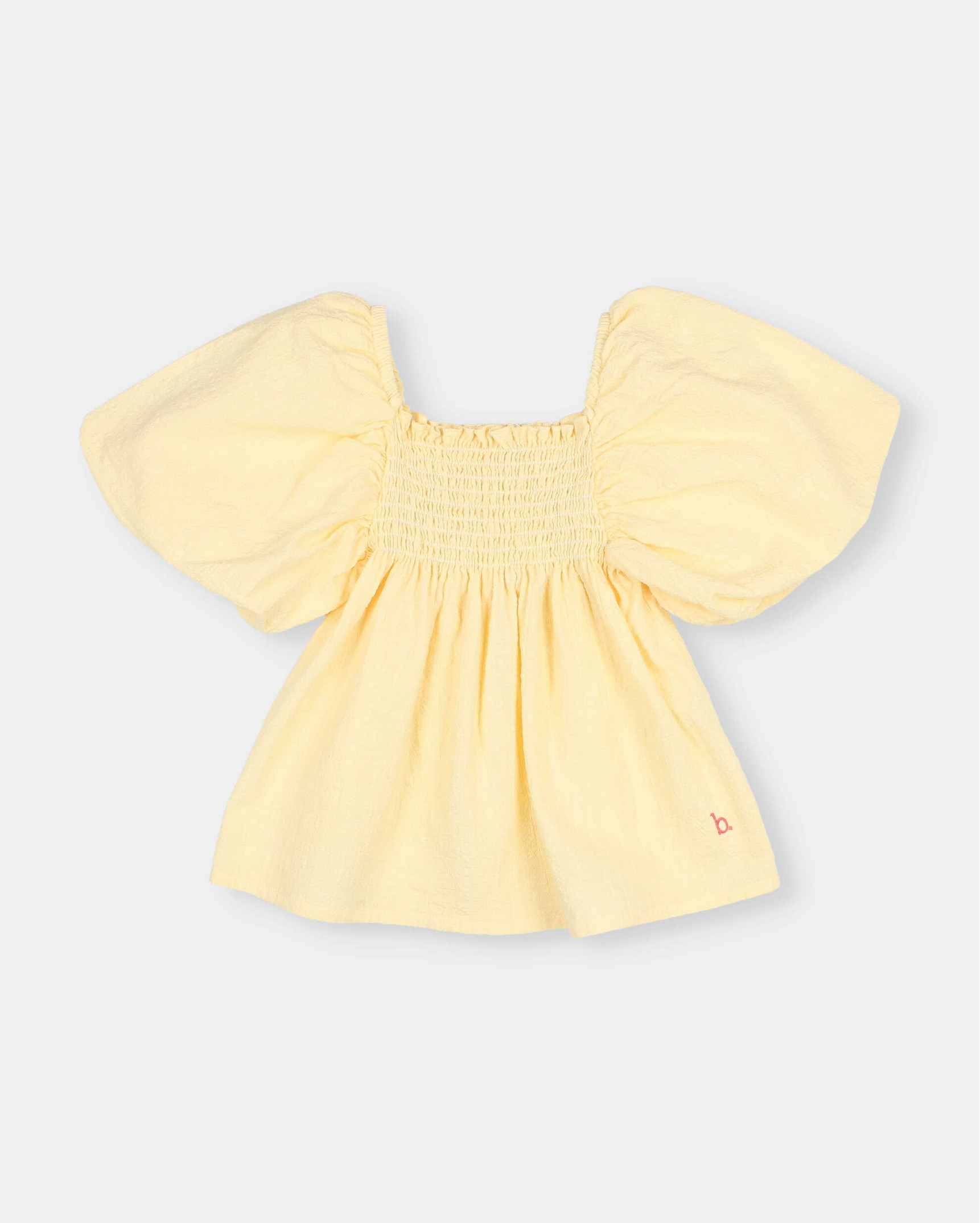Textured organic cotton top. Puff sleeves. Straight neckline with elastic band. Ruffled hem with contrasting embroidered detail on the side.