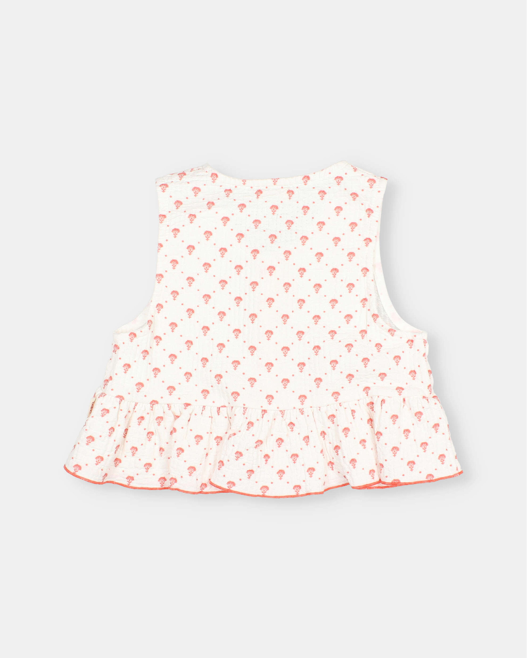 Quilted cotton top with bali print. Ruffled hem with contrasting gathered finish. Round neckline. Front button fastening with wooden buttons.