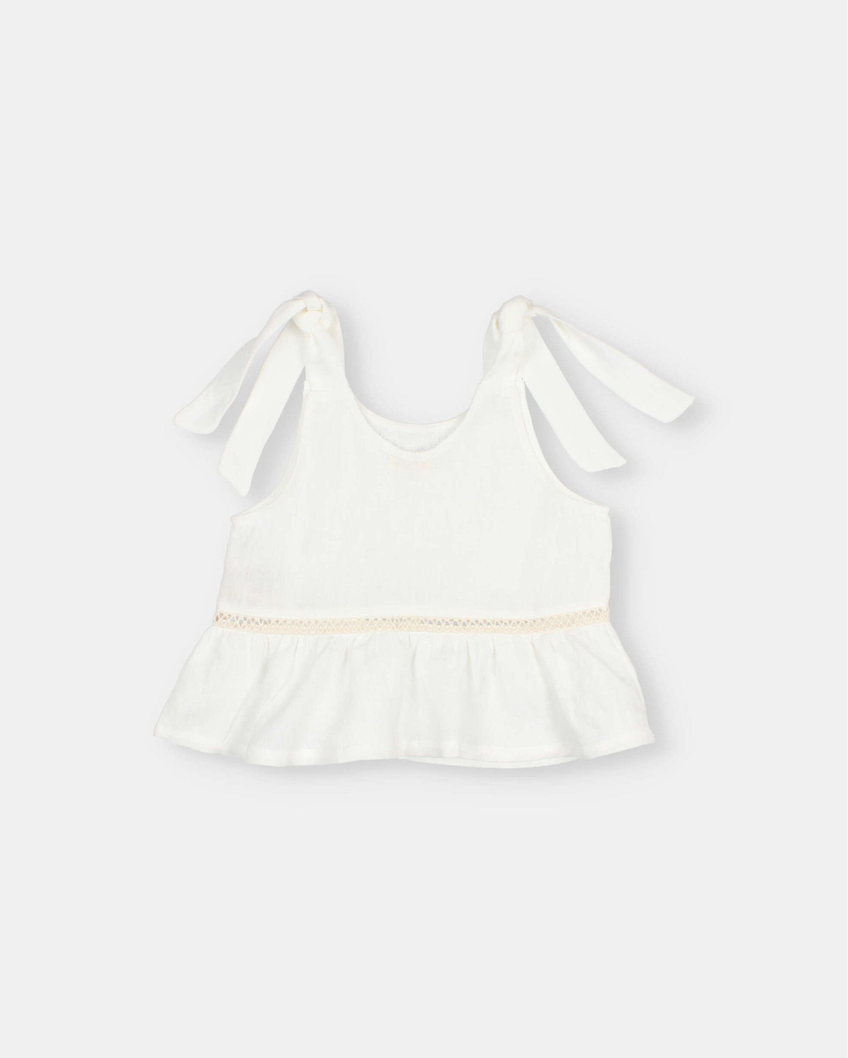 linen top with a soft washed effect and a relaxed feel. Ruffled hem. Entre-deux detail on the yoke. Round neckline and ribbon straps.