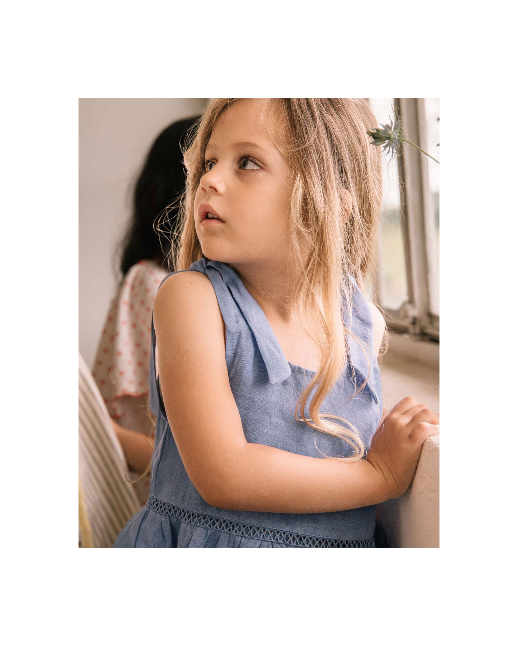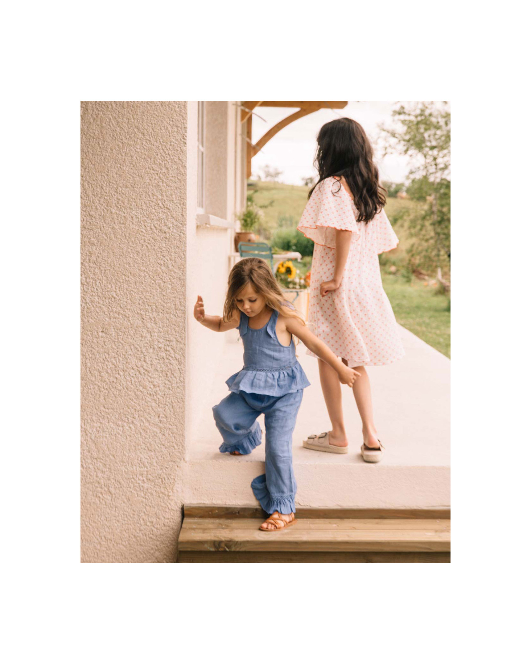 100% linen top with a soft washed effect and a relaxed feel. Ruffled hem. Entre-deux detail on the yoke. Round neckline and ribbon straps.