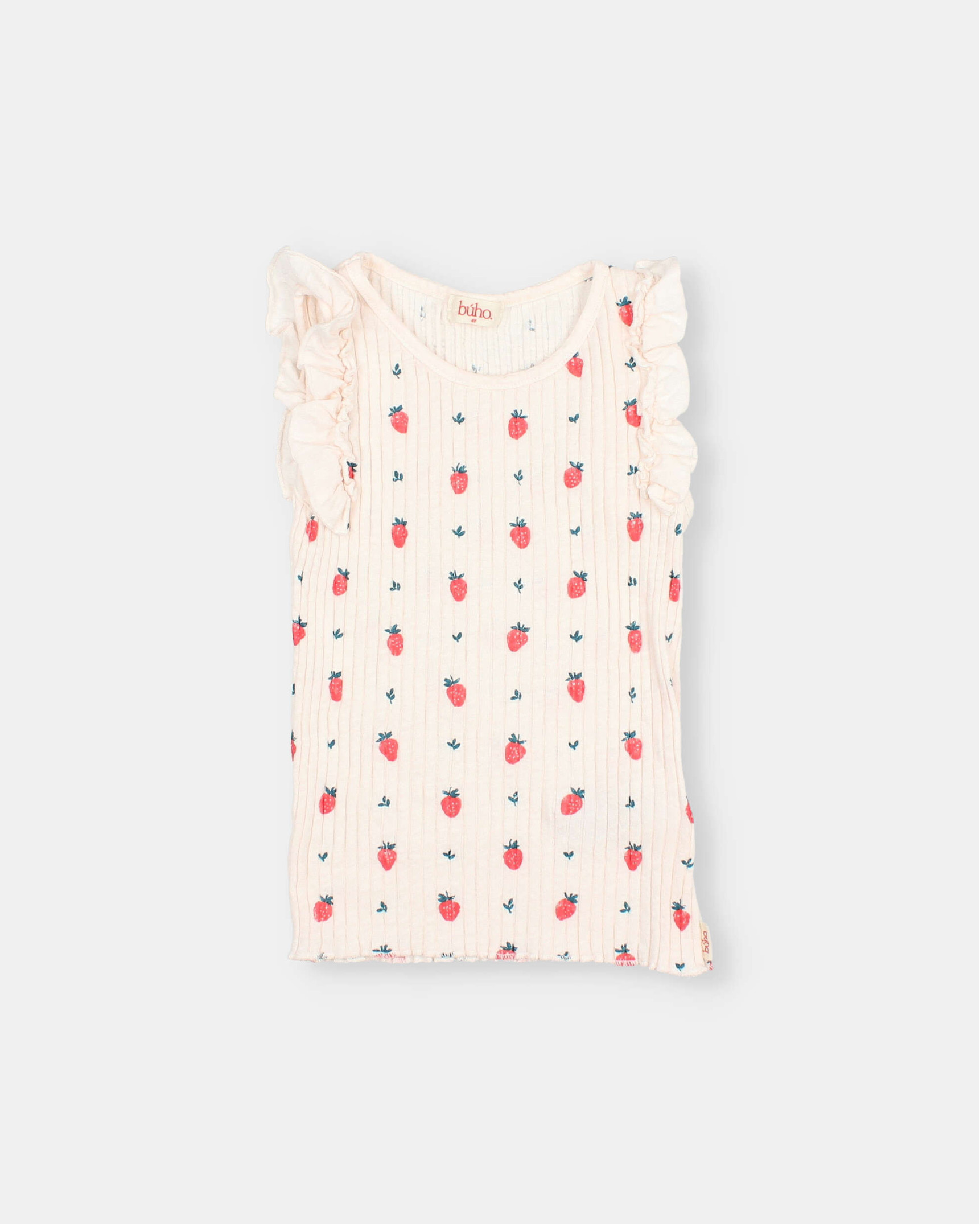 Wide ribbed organic cotton T-shirt with strawberry print. Ruffled straps. Round neck.