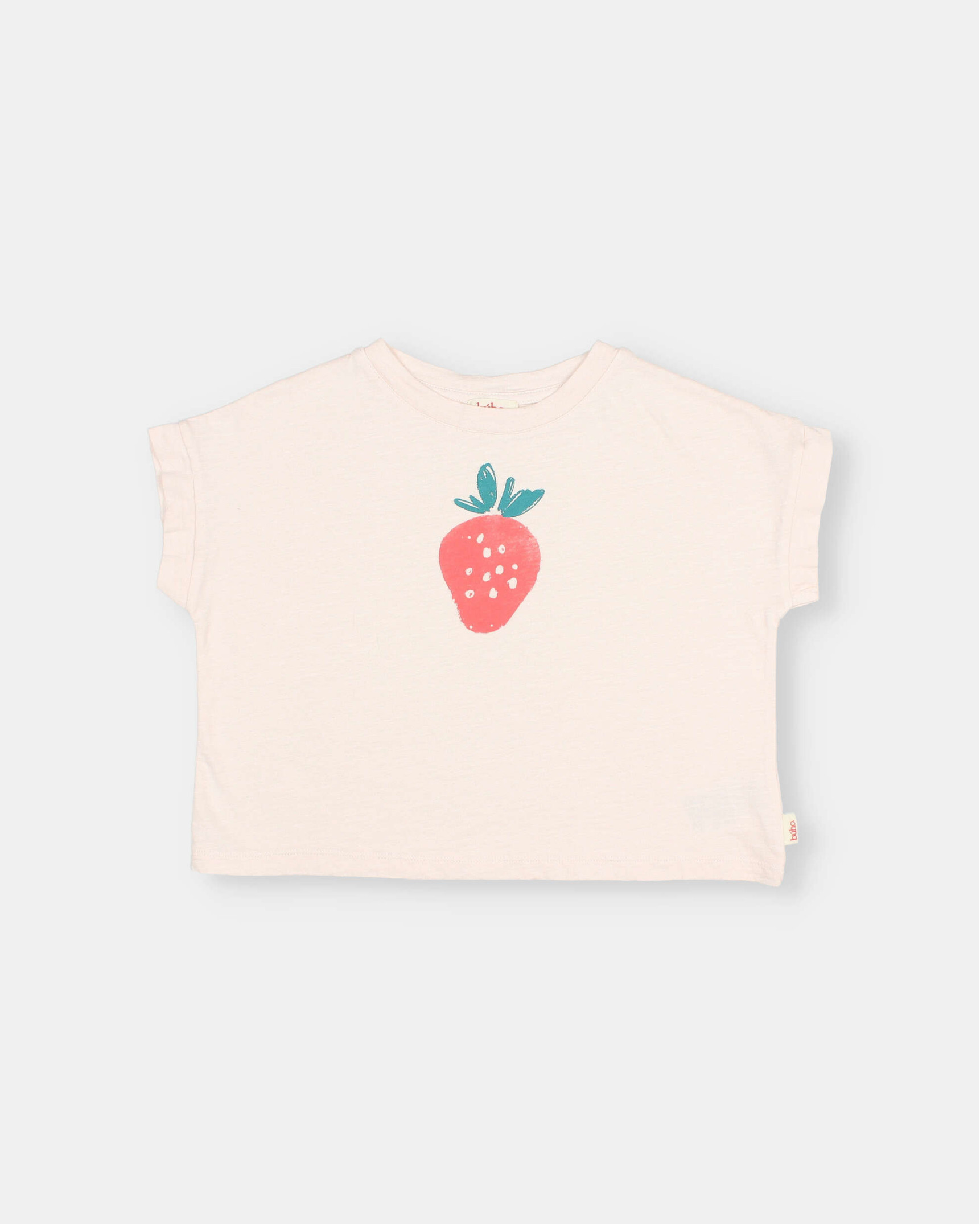 Organic cotton T-shirt with strawberry print on the chest. Round neck. Short sleeves with turn-up.
