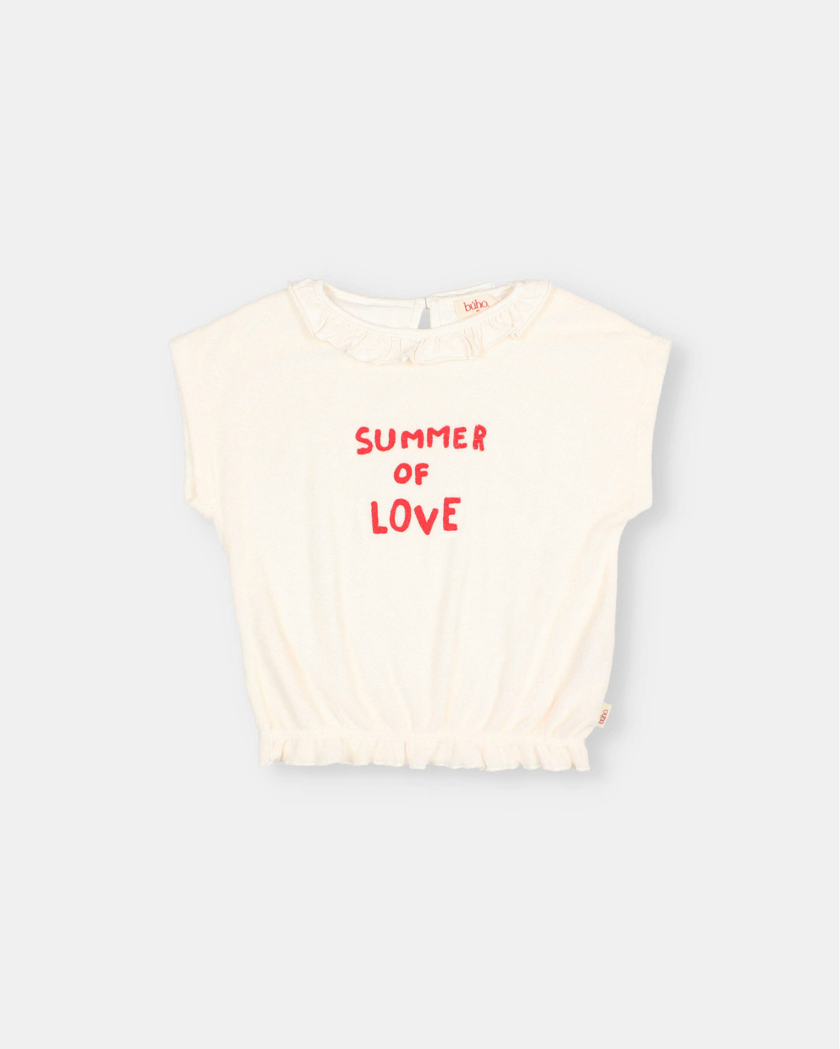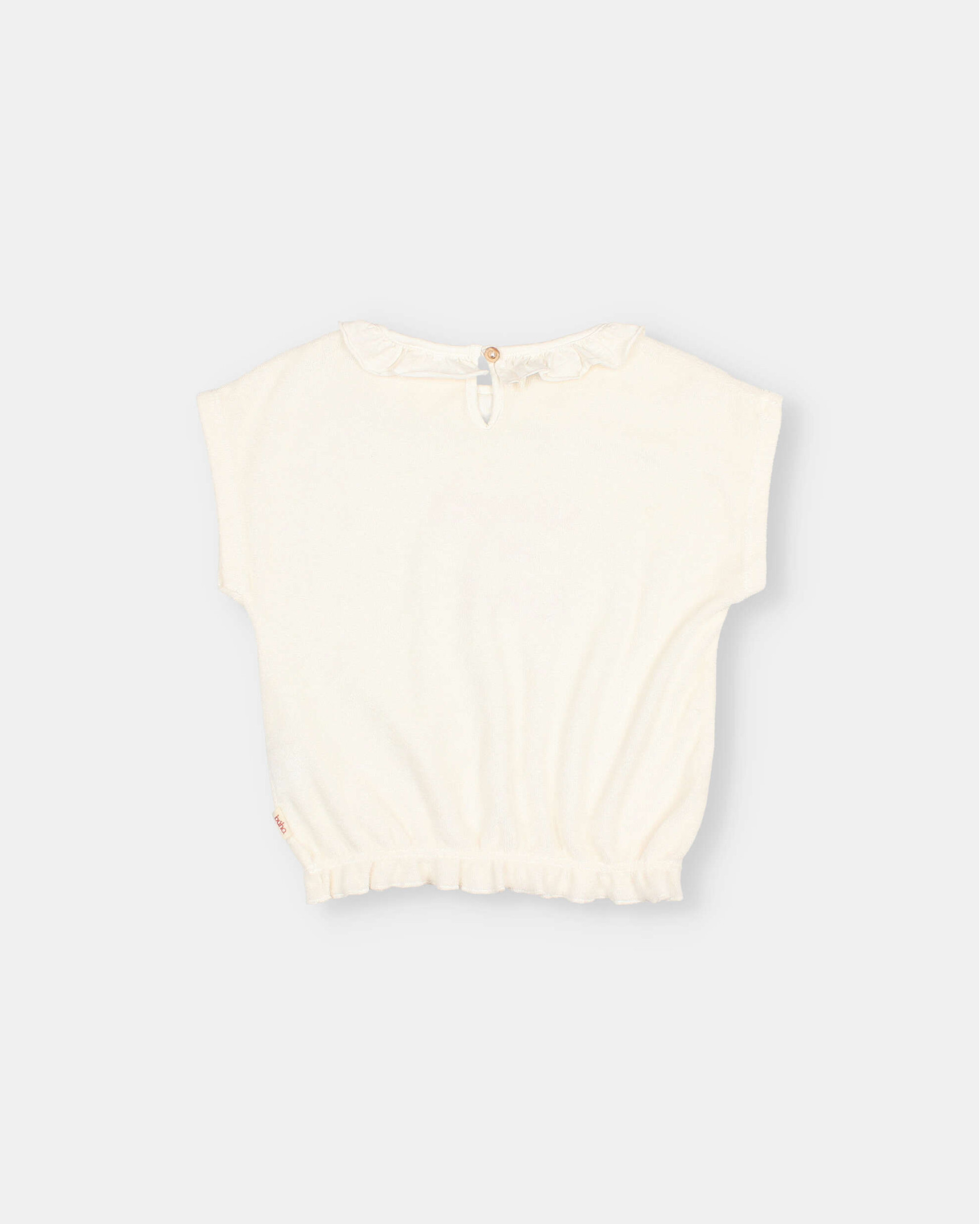 Soft terry short-sleeved T-shirt. Print on the chest. Round neck with cotton knit ruffle and teardrop opening with wooden button at the back. Elastic hem.