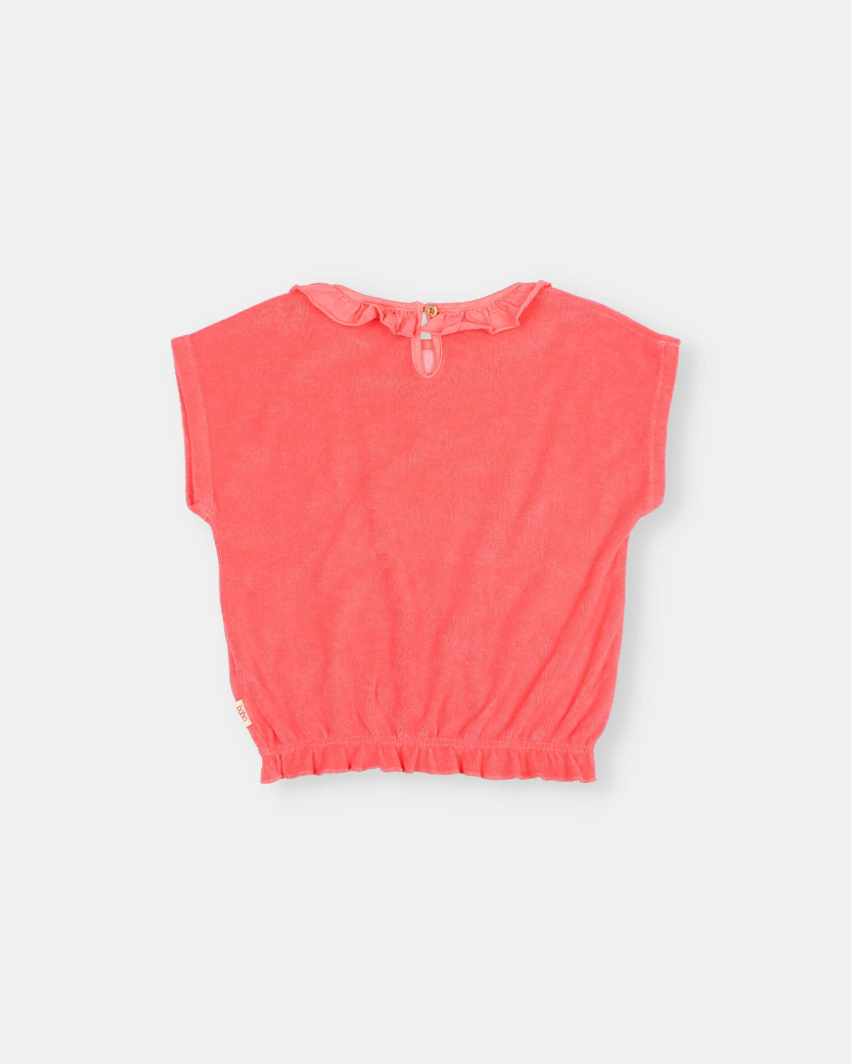 Soft terry short-sleeved T-shirt. Print on the chest. Round neck with cotton knit ruffle and teardrop opening with wooden button at the back. Elastic hem.