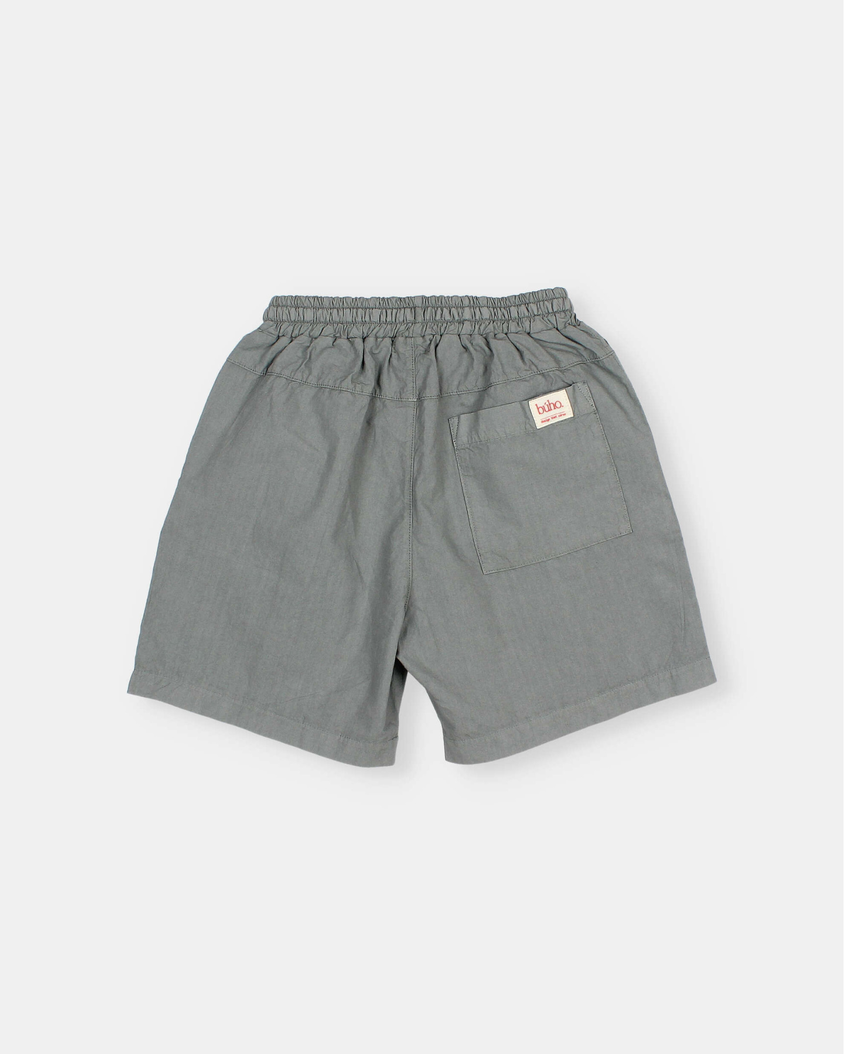 Organic cotton poplin bermuda. Elastic waistband with ribbon for a better fit. Front pockets and patch pockets on the back with decorative label.