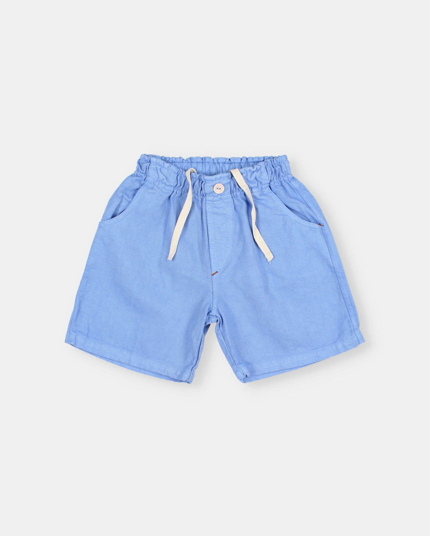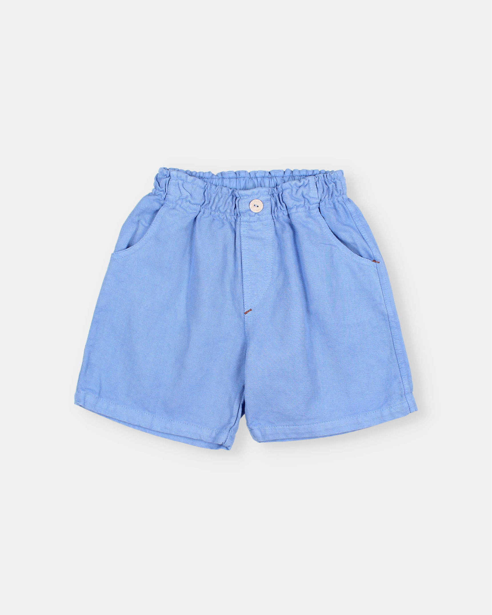 Drill bermuda. Elastic waistband with cotton ribbon inside for a better fit. Decorative button at the front. Front pockets. Plastron-style pocket at the back with decorative label. Contrasting stitching.