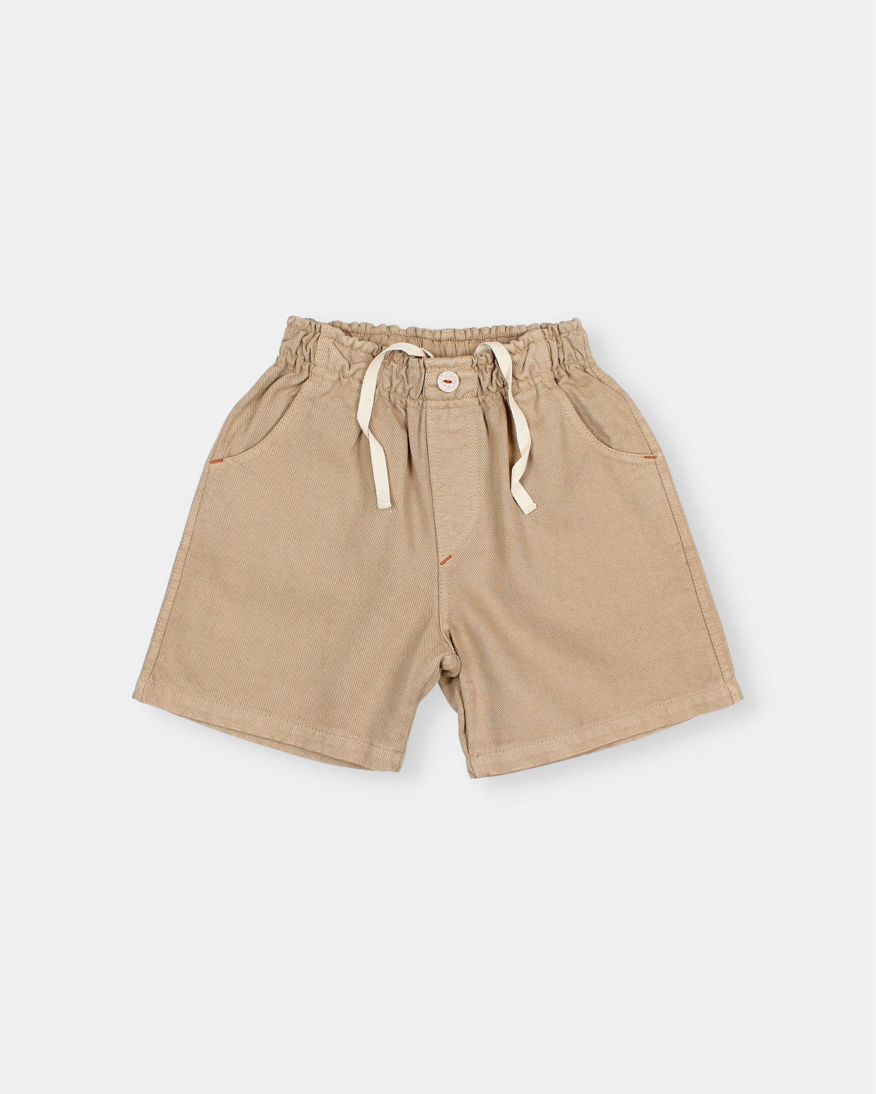 Drill bermuda. Elastic waistband with cotton ribbon inside for a better fit. Decorative button at the front. Front pockets. Plastron-style pocket at the back with decorative label. Contrasting stitching.