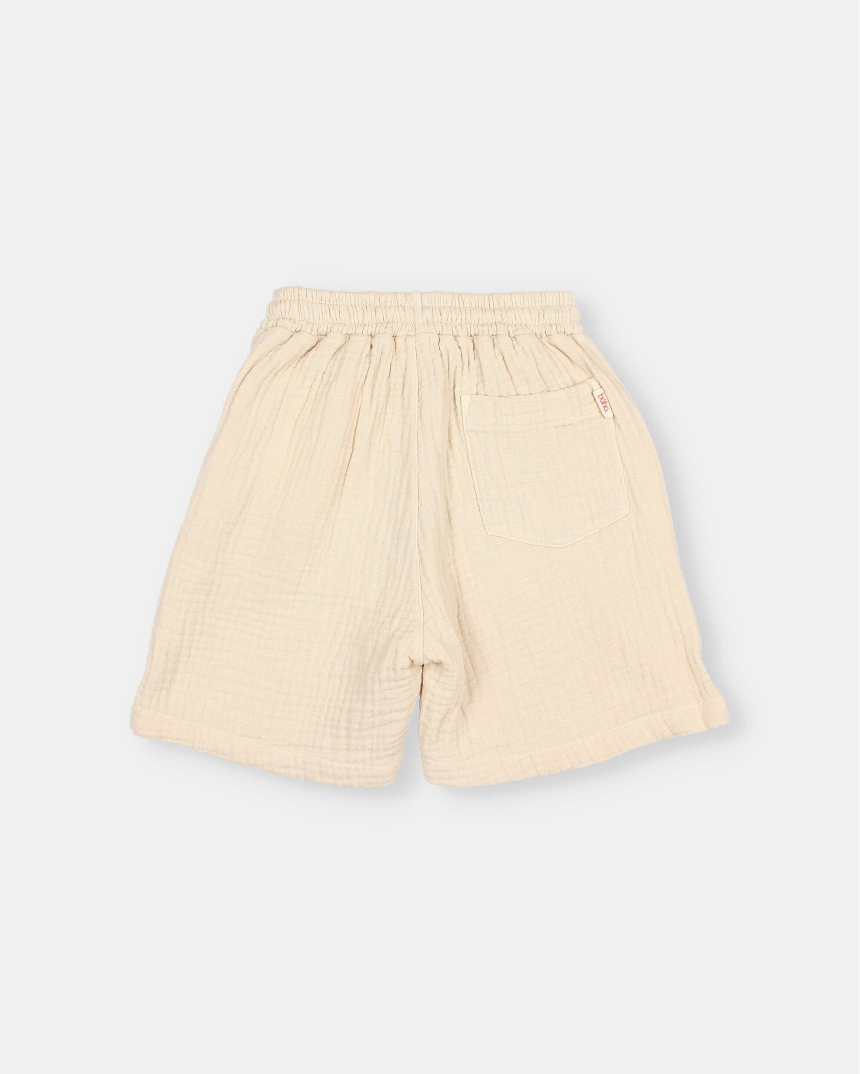 Cotton muslin bermuda. Elastic waistband with raw cotton ribbon for a better fit. Decorative wooden buttons on the front. Front pockets. Plastron-style pocket on the back. Checkered fabric waistband lining.