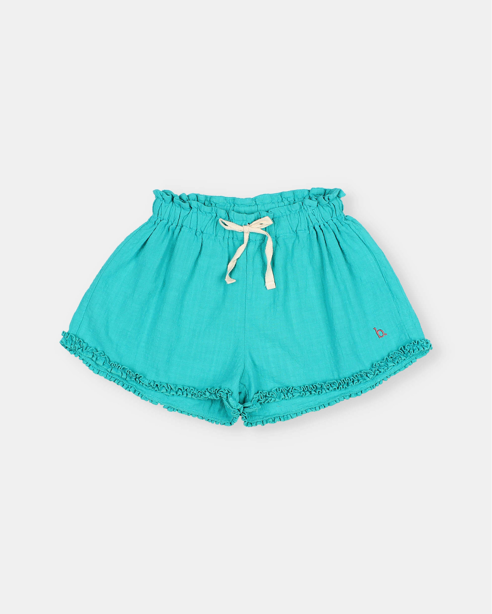 Textured organic cotton shorts with ruffles. Elastic waistband with raw cotton ribbon for adjustment. Contrasting embroidered detail.