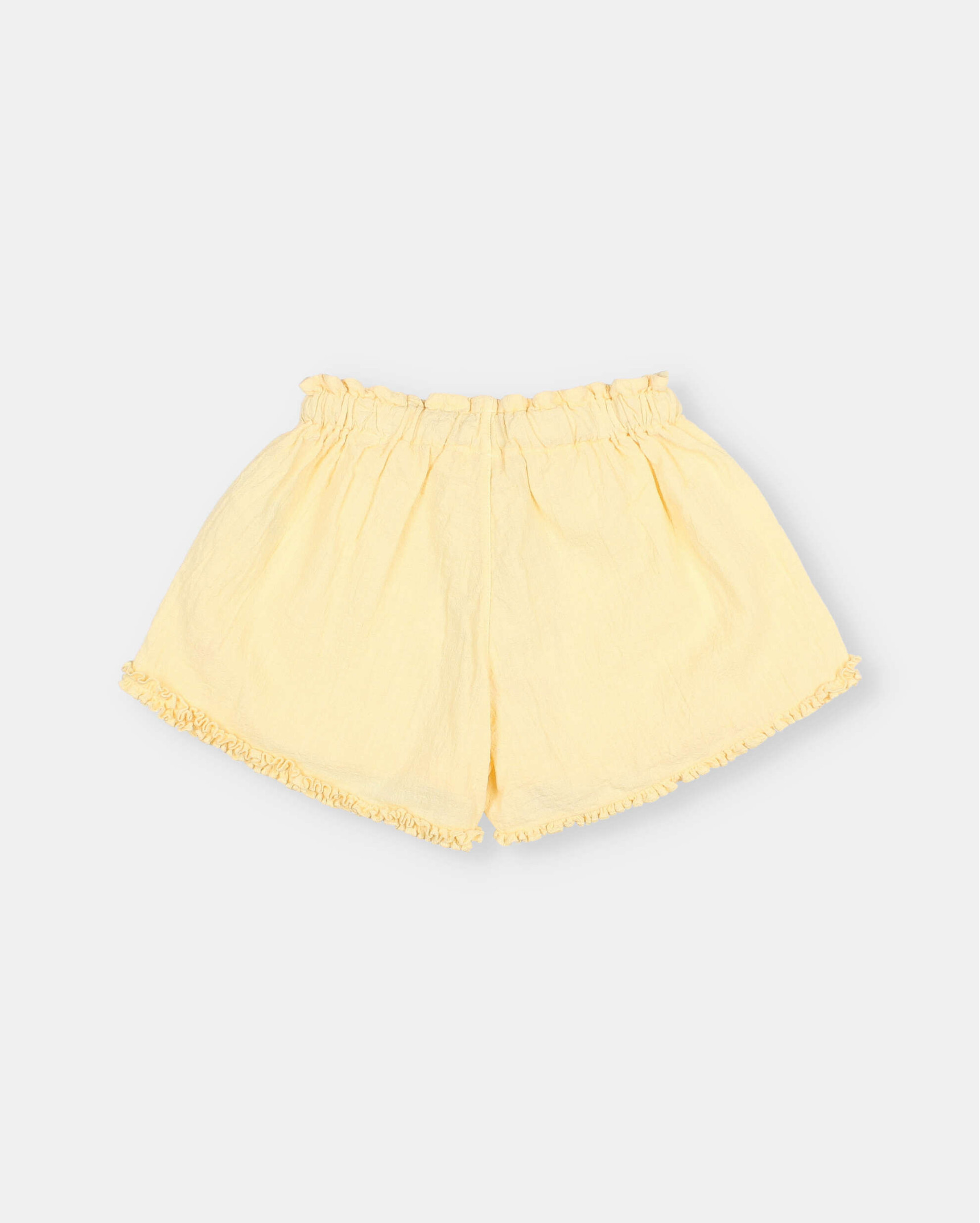 Textured organic cotton shorts with ruffles. Elastic waistband with raw cotton ribbon for adjustment. Contrasting embroidered detail.