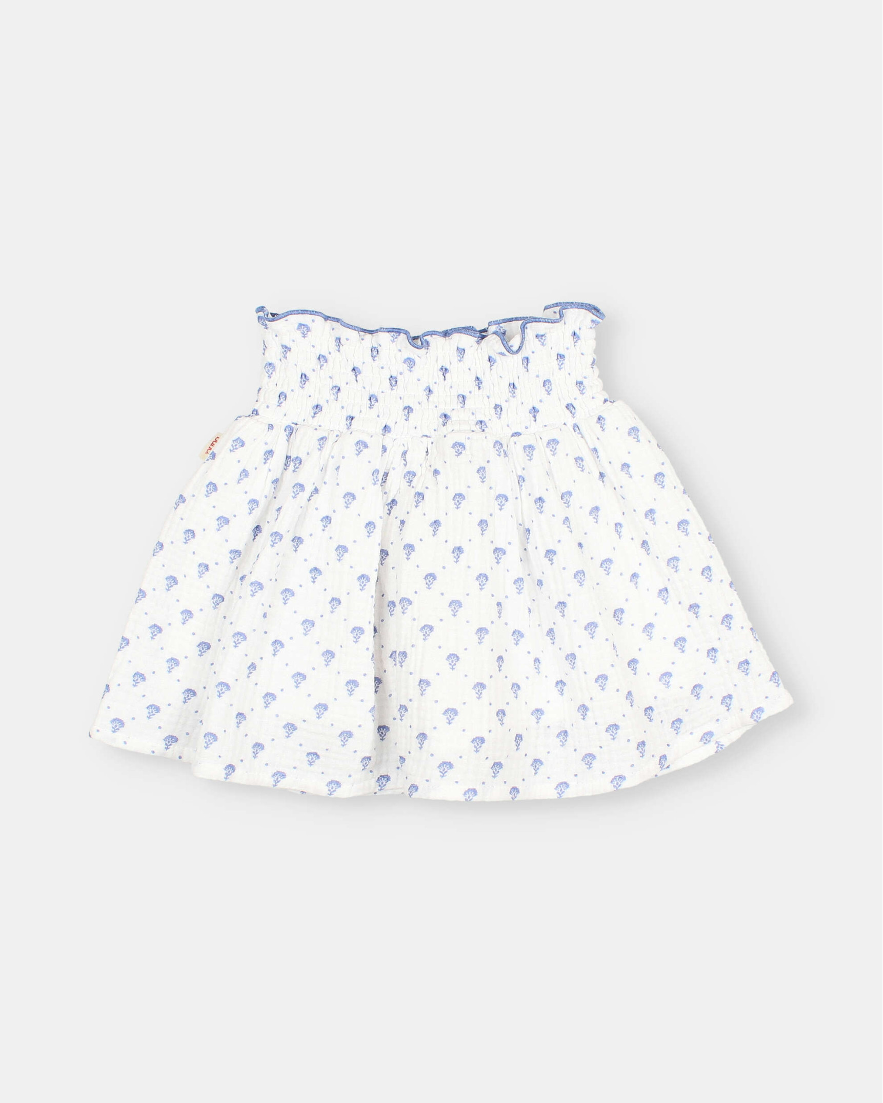 Cotton muslin skirt with bali print. Elastic waistband and ruffle with contrasting gathered finish. Flared skirt. Shorts-style inner lining.