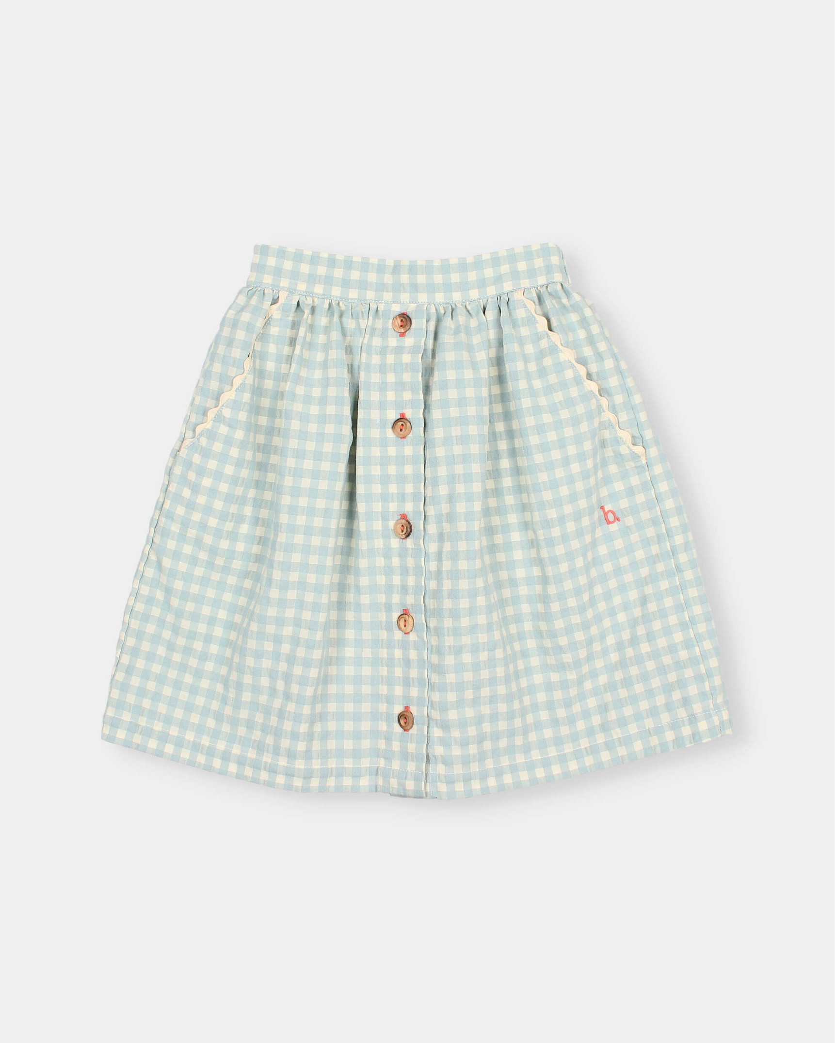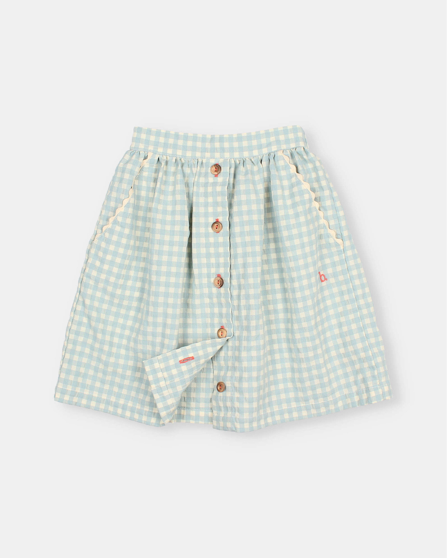 Gingham midi skirt in cotton seersucker. Elastic waistband at the back. Front button fastening with wooden buttons. Gathered skirt. Side pockets with onduline ribbon detail. Embroidery and buttonholes in contrasting thread.