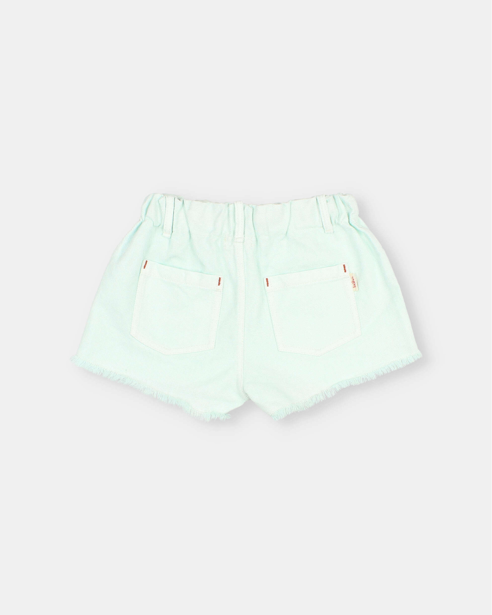 Twill shorts. Elastic waistband with belt loops and raw cotton ribbon for adjustment. Front pockets and patch pockets on the back. Frayed hem. Contrasting stitching.