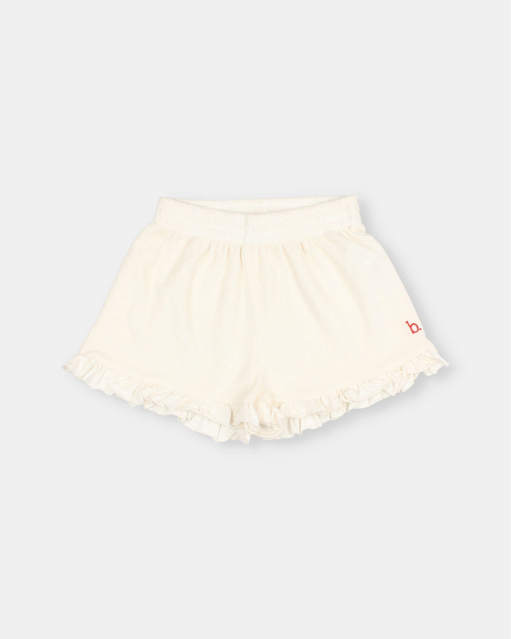 Soft terry shorts with plain cotton knit ruffle. Elastic waistband. Contrasting embroidered detail.