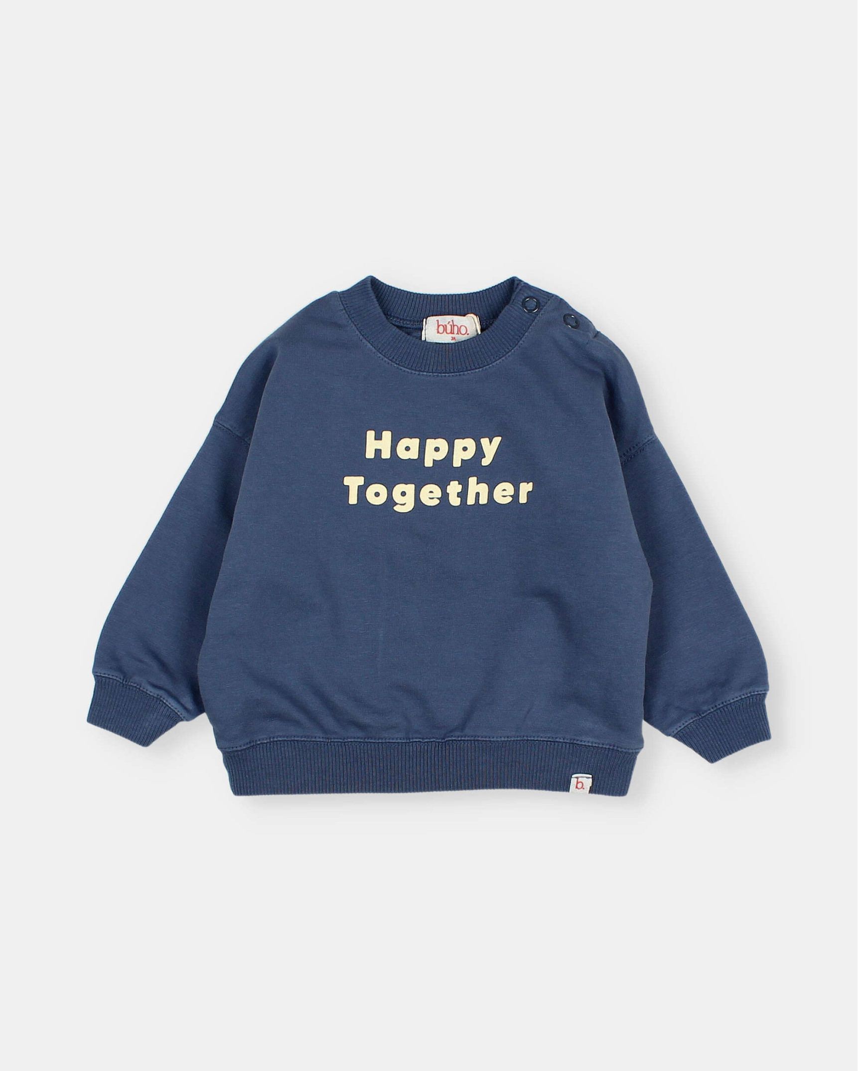 Soft fleece sweatshirt with happy motif printed on the chest. Round neck with press stud fastening on the shoulder.