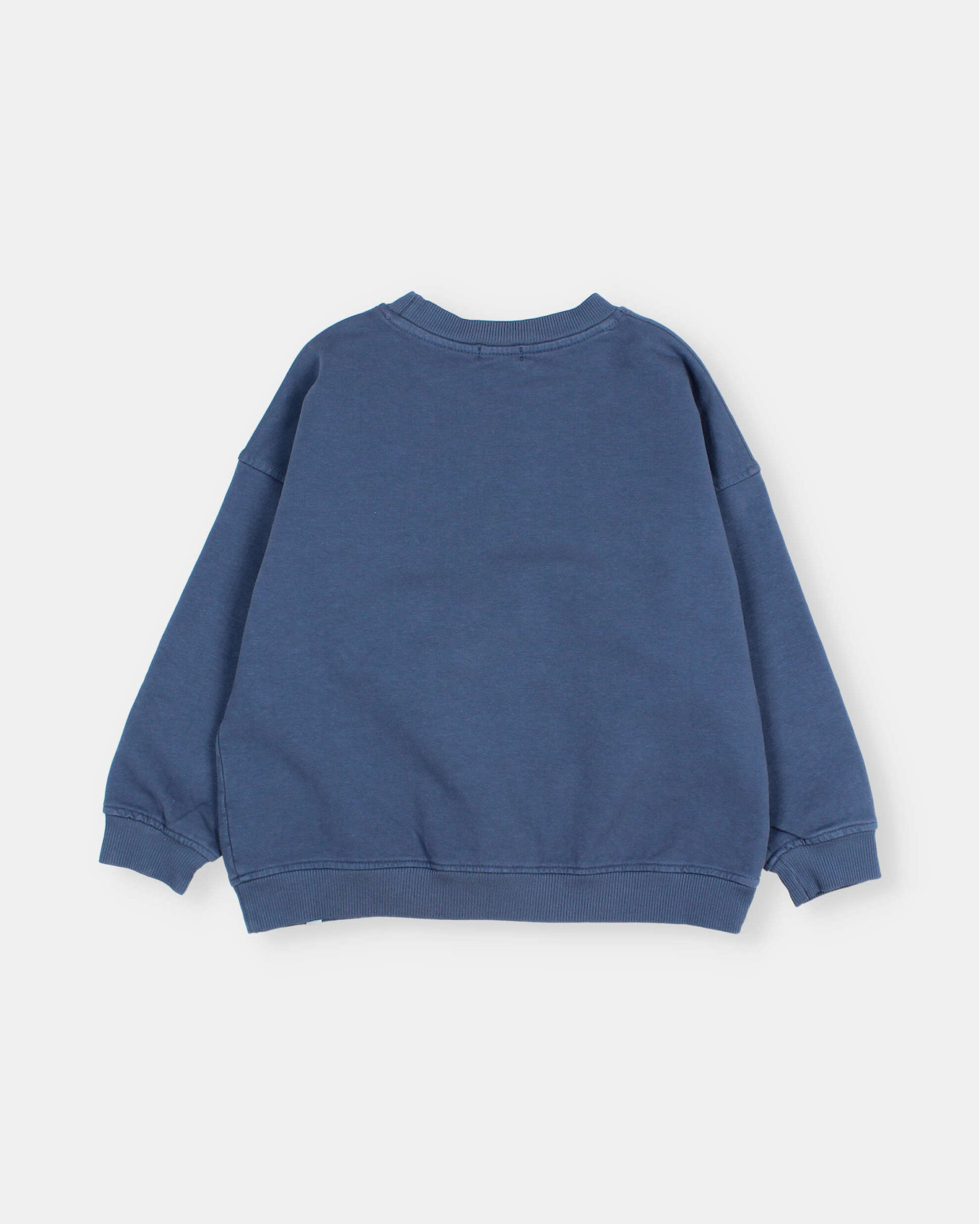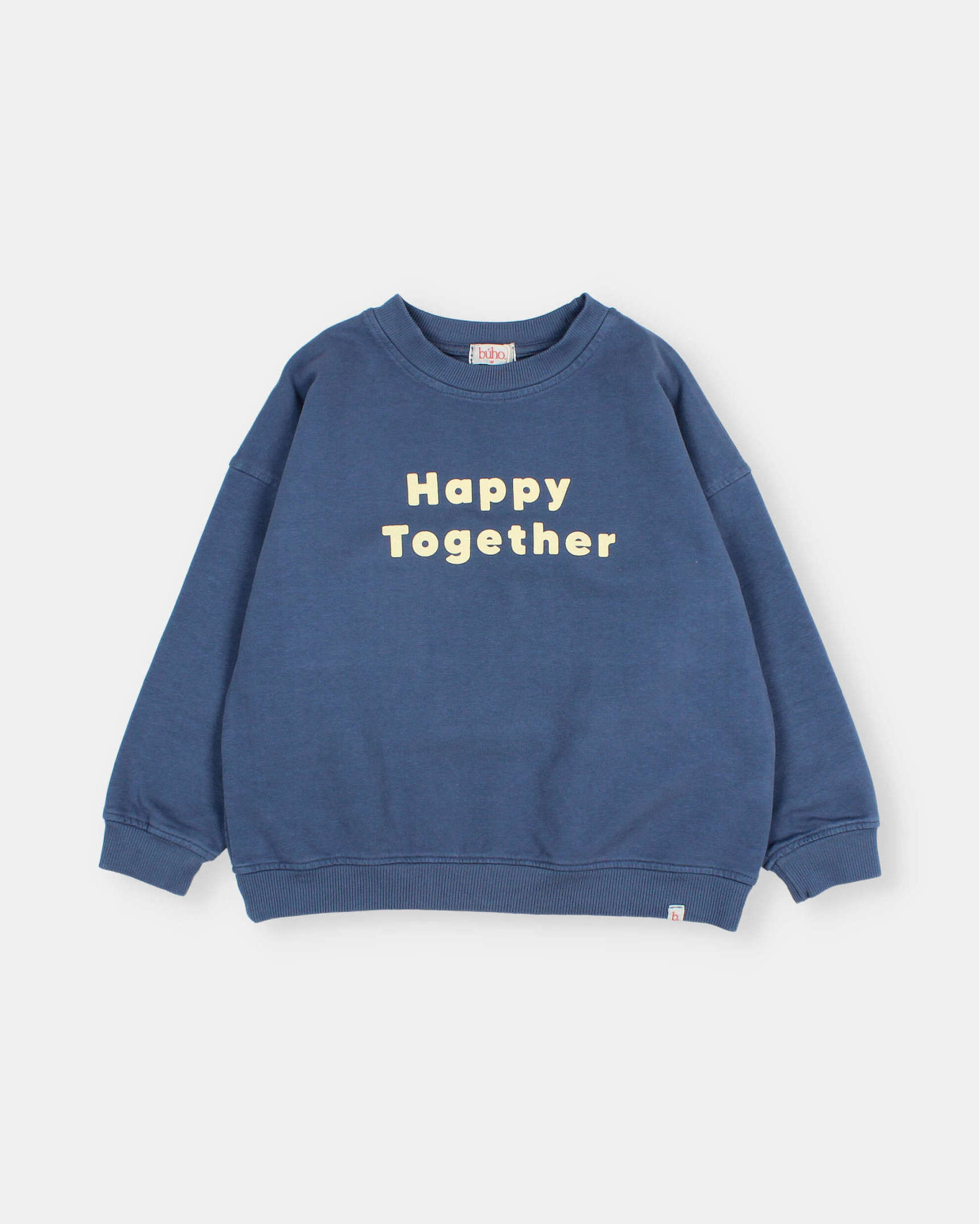 Soft organic cotton fleece sweatshirt with a happy print on the chest. Round neck. Ribbed trim.