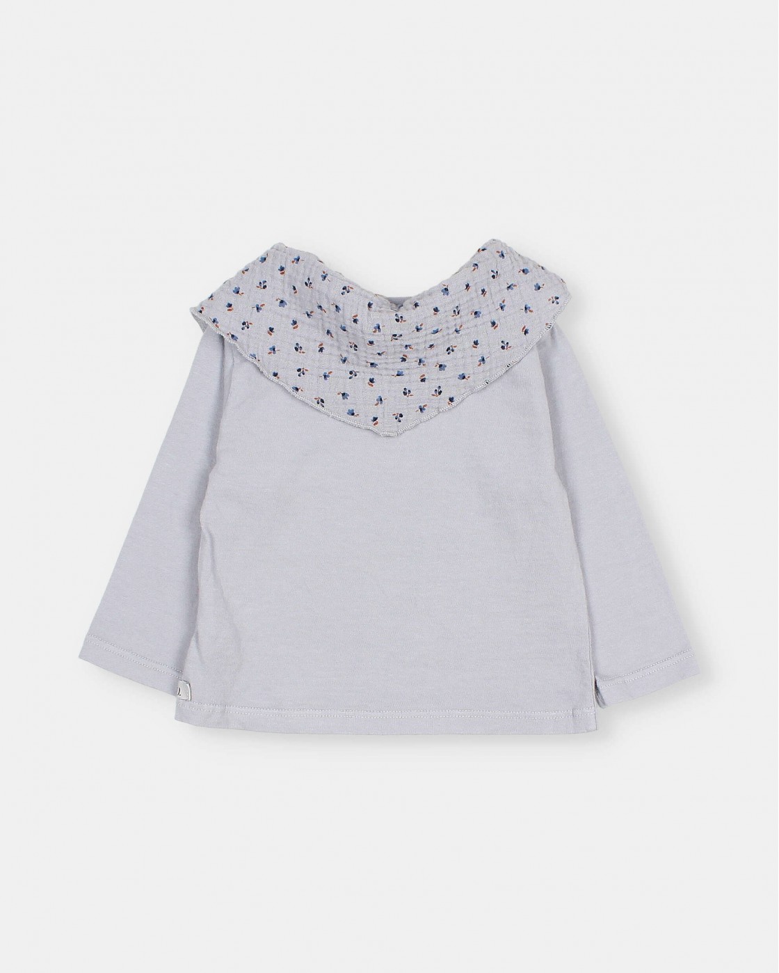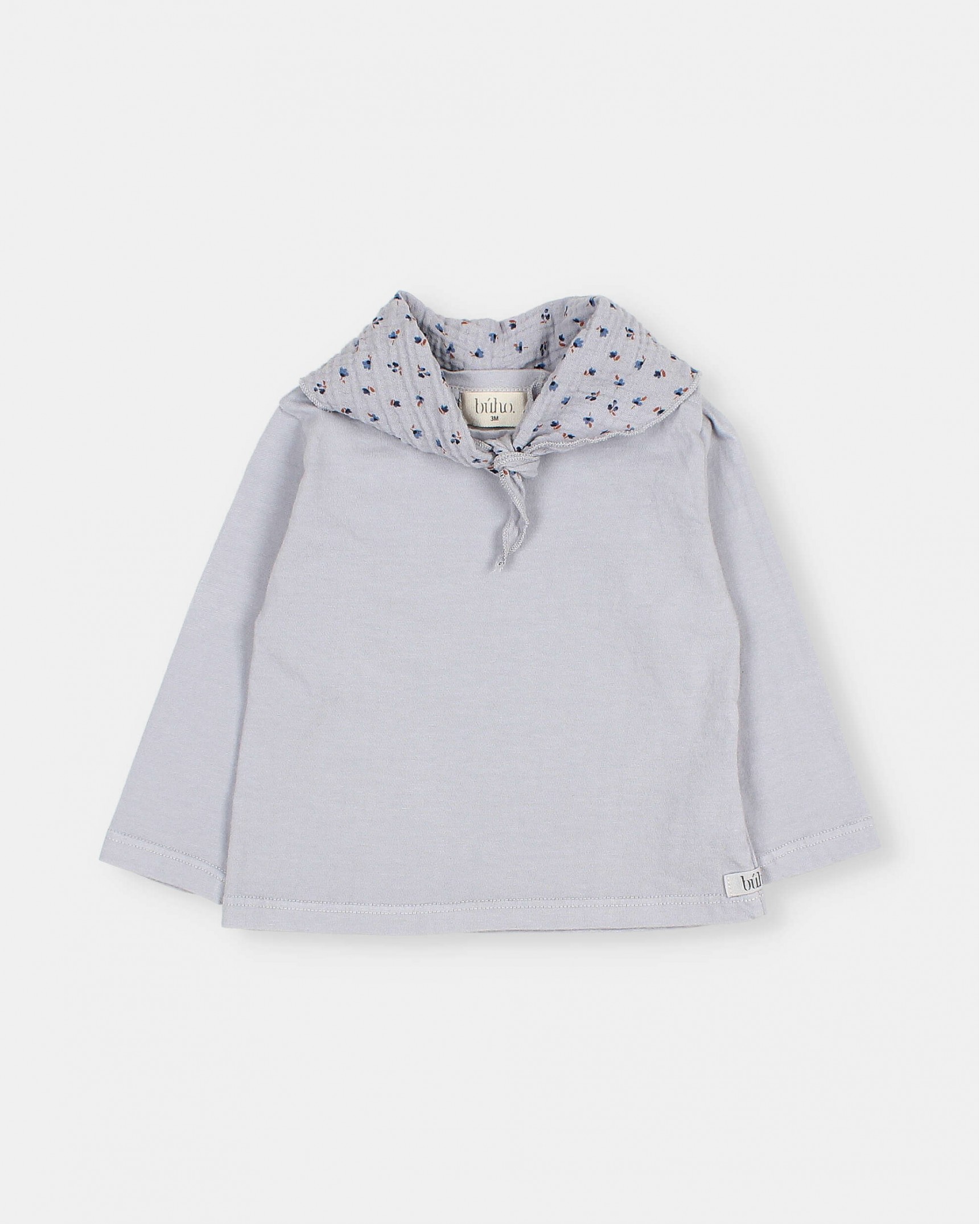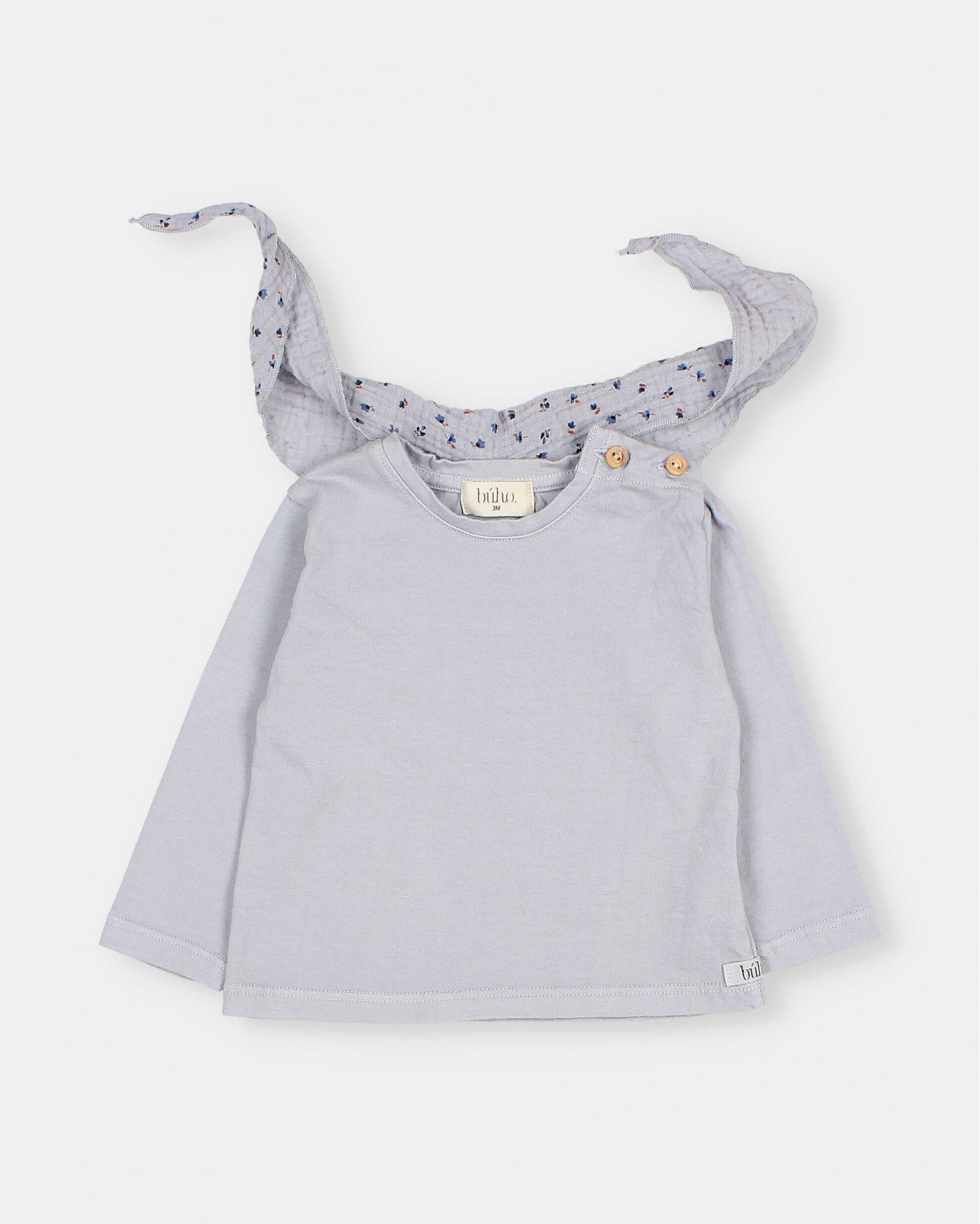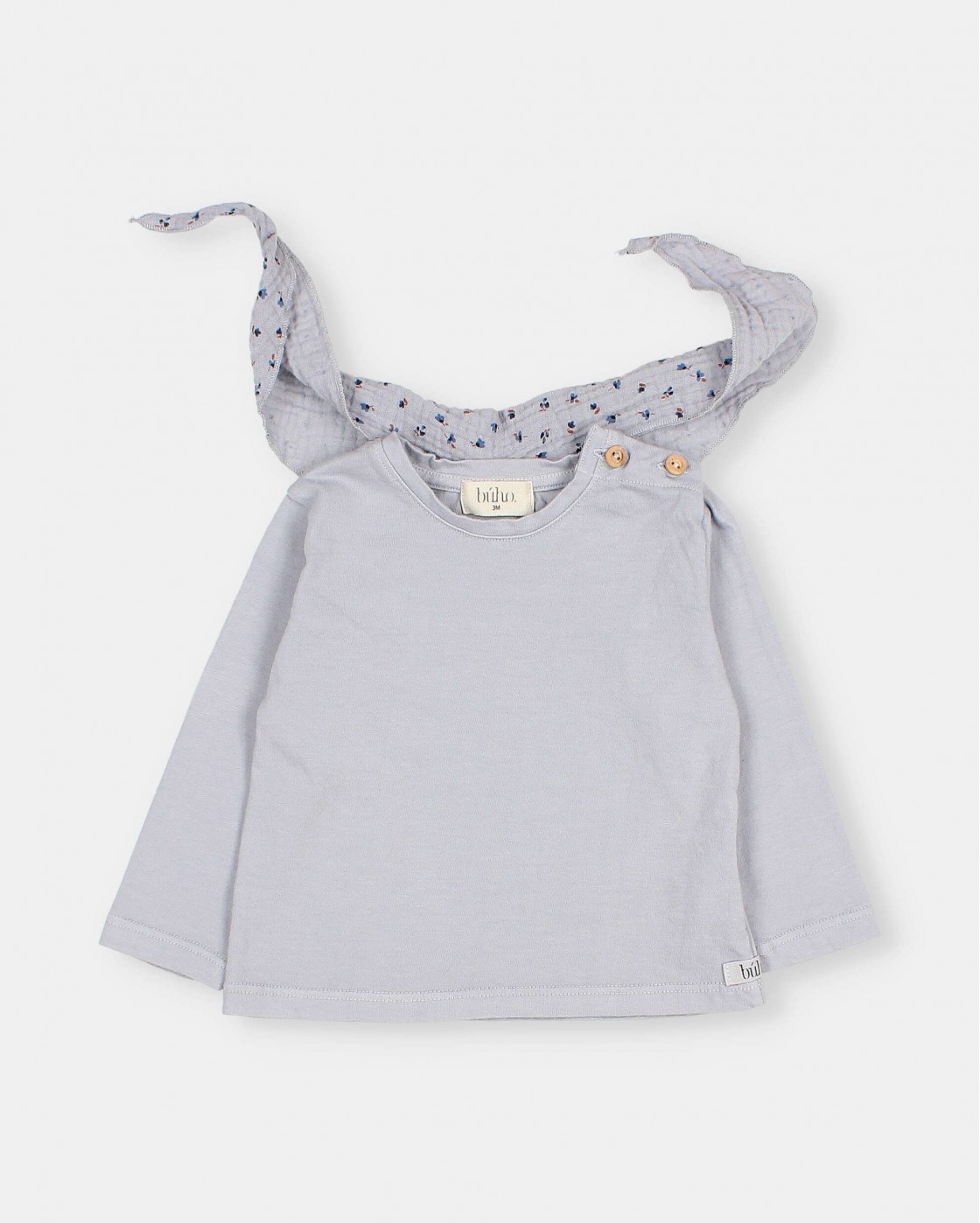 Long sleeve T-shirt with muslin "fall" print scarf. Round neck with button fastening on the shoulder. Scarf fastened with button at the back.