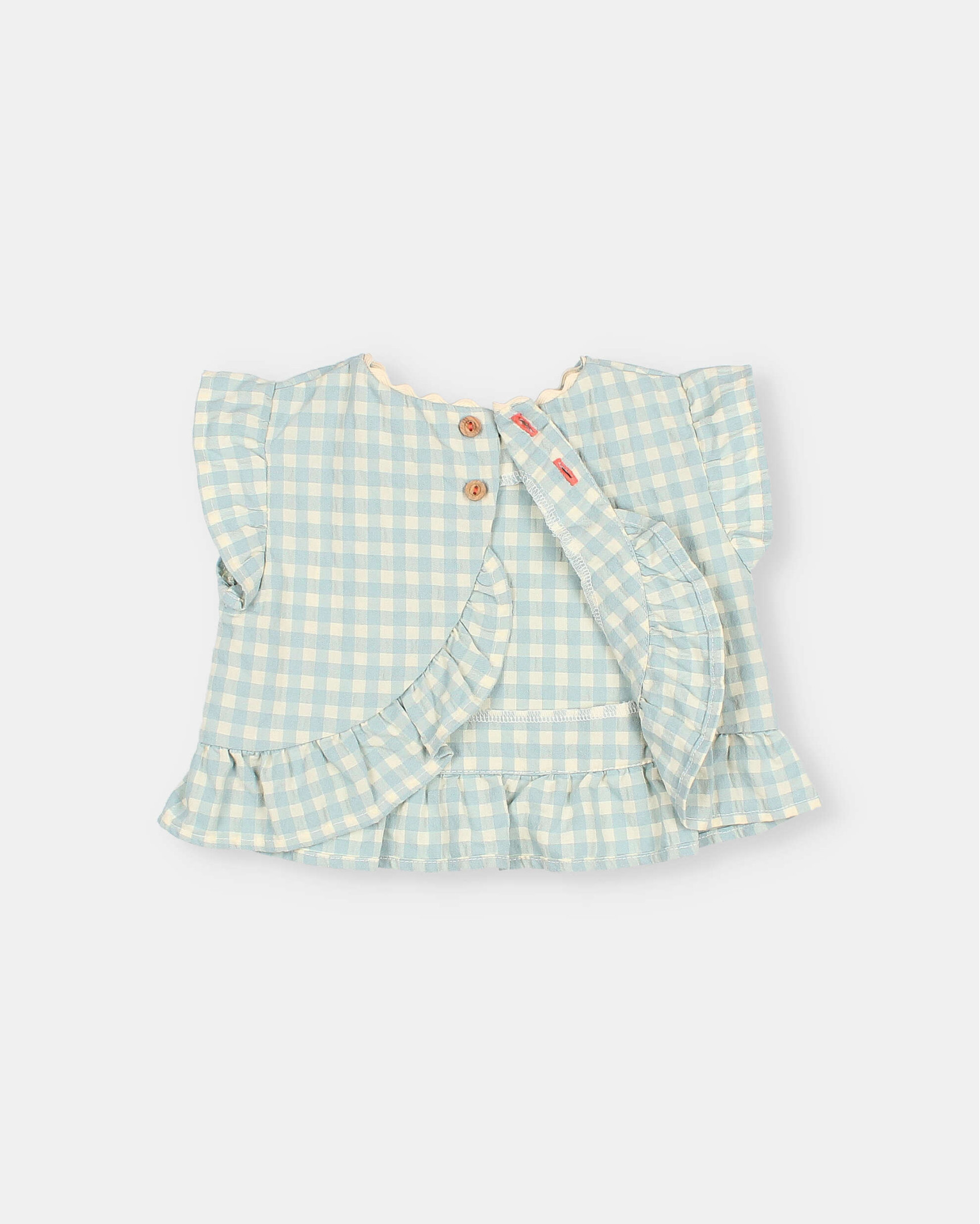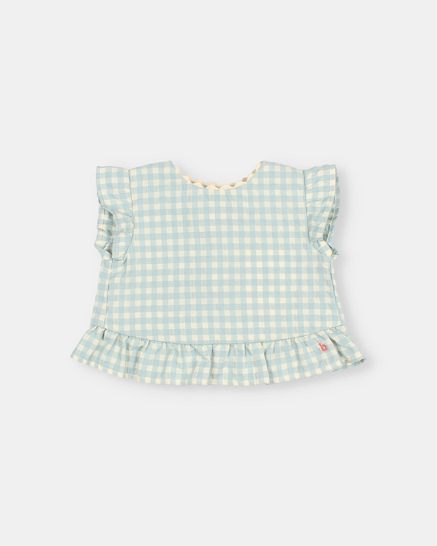 Cotton seersucker gingham top. Round neckline with onduline ribbon detail. Wooden button opening at the back. Cap sleeves with ruffles. Cross-over back with ruffles and contrasting embroidered detail on the side of the ruffle.
