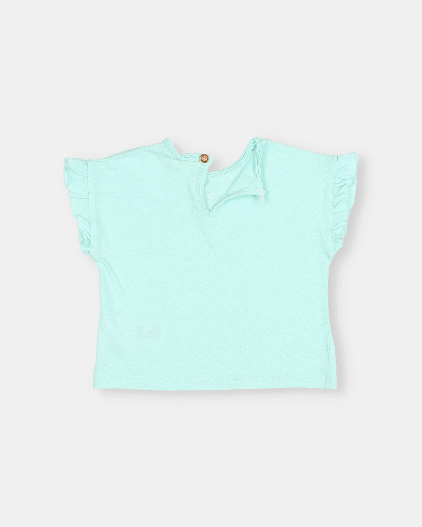 Linen cotton T-shirt. Short sleeves with ruffles. Round neckline with teardrop opening and wooden button at the back.