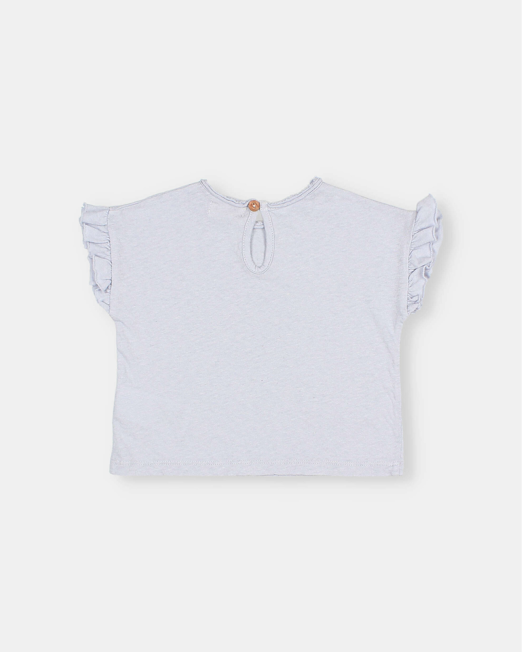 Linen cotton T-shirt. Short sleeves with ruffles. Round neckline with teardrop opening and wooden button at the back.