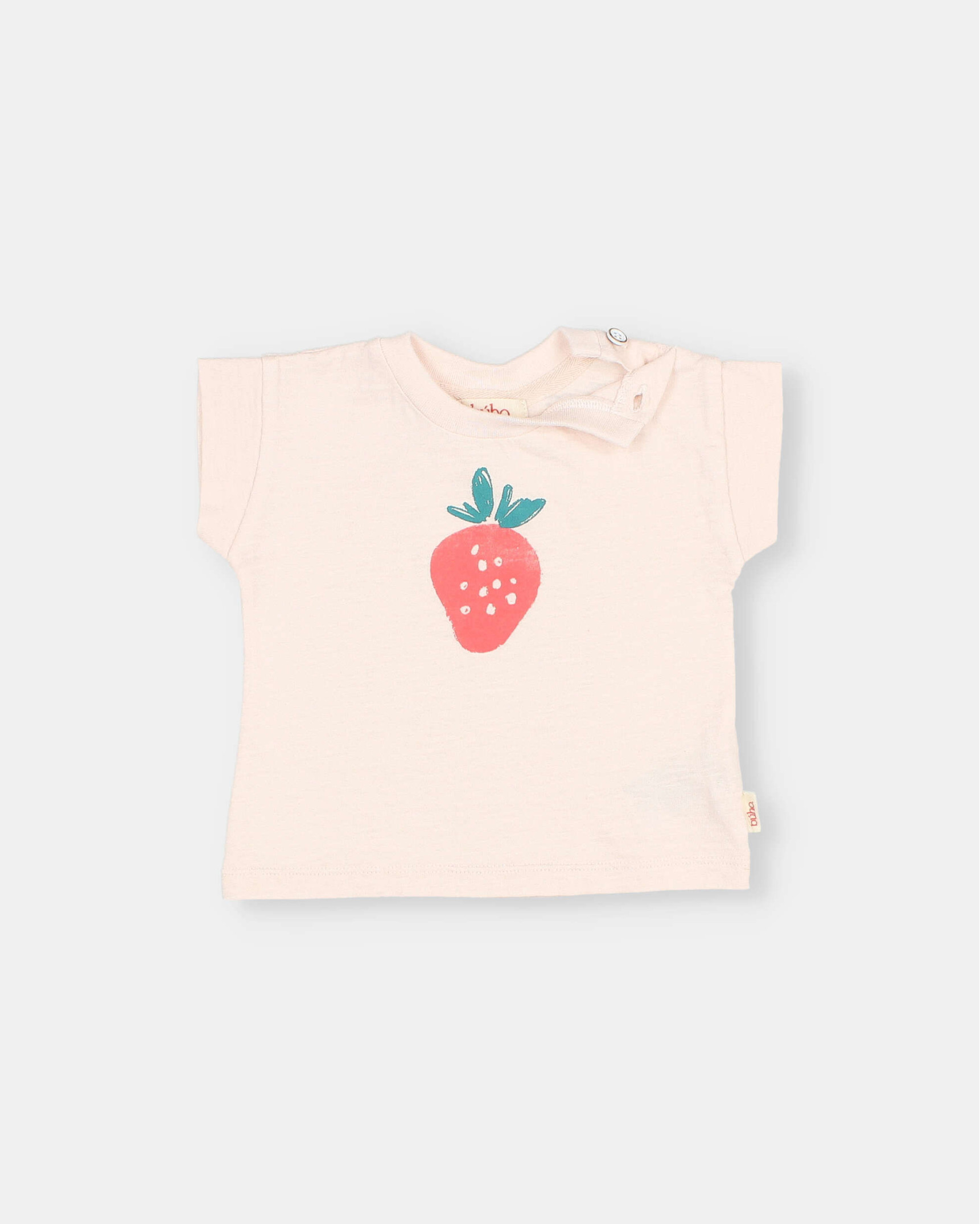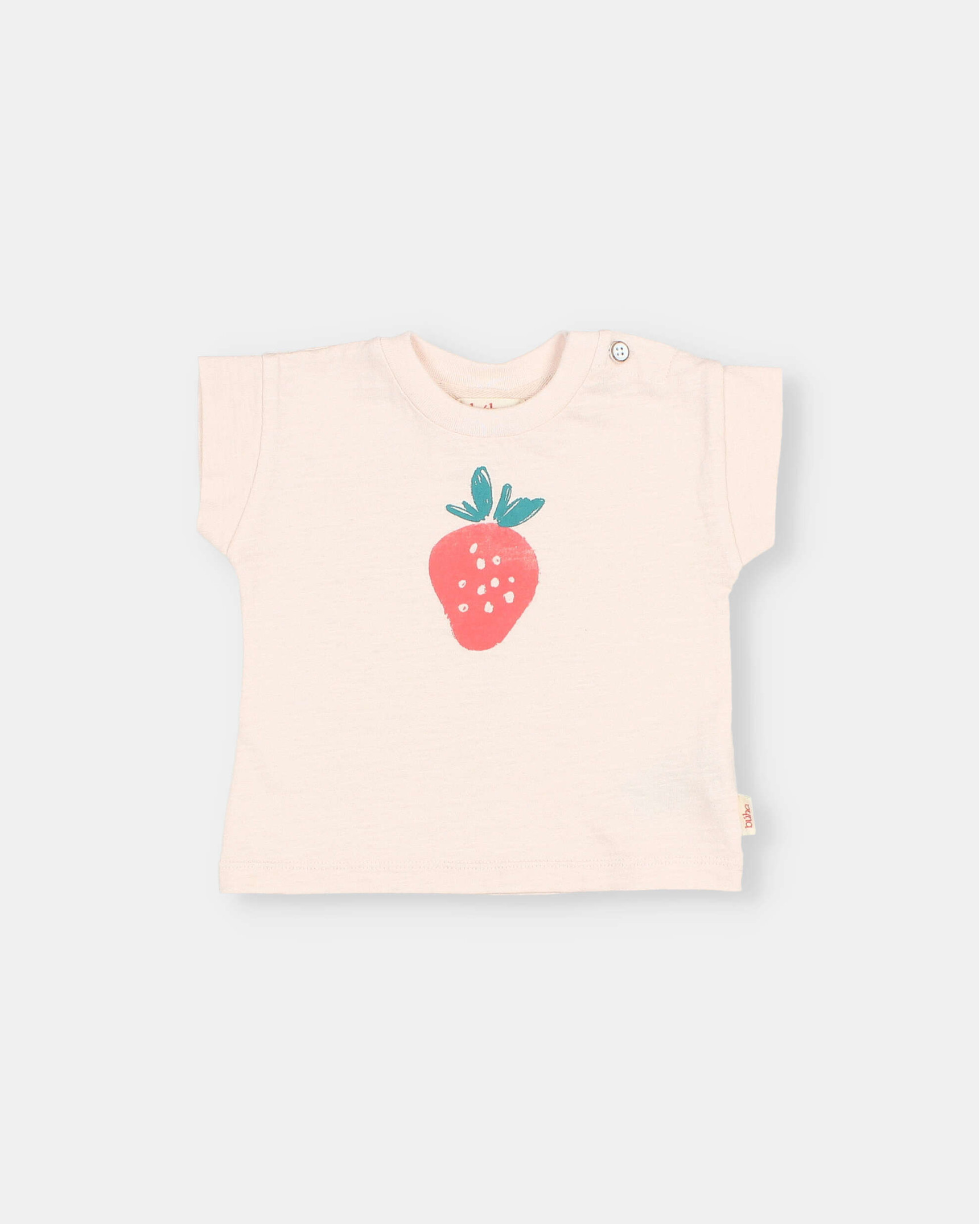 Organic cotton T-shirt with strawberry print on the chest. Round neck with button fastening on the shoulder. Short sleeves with turn-up.